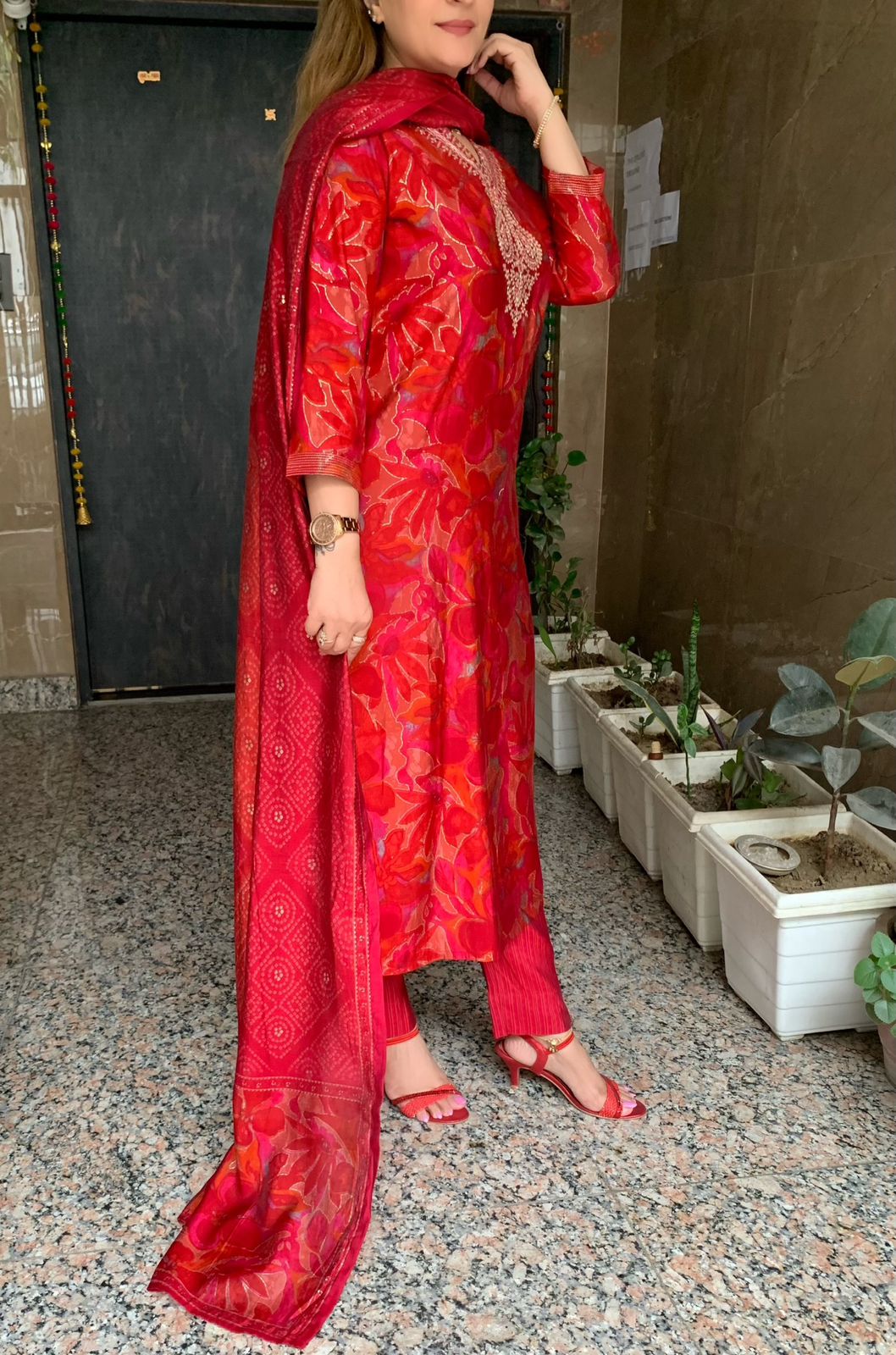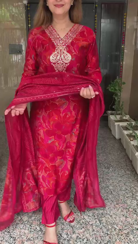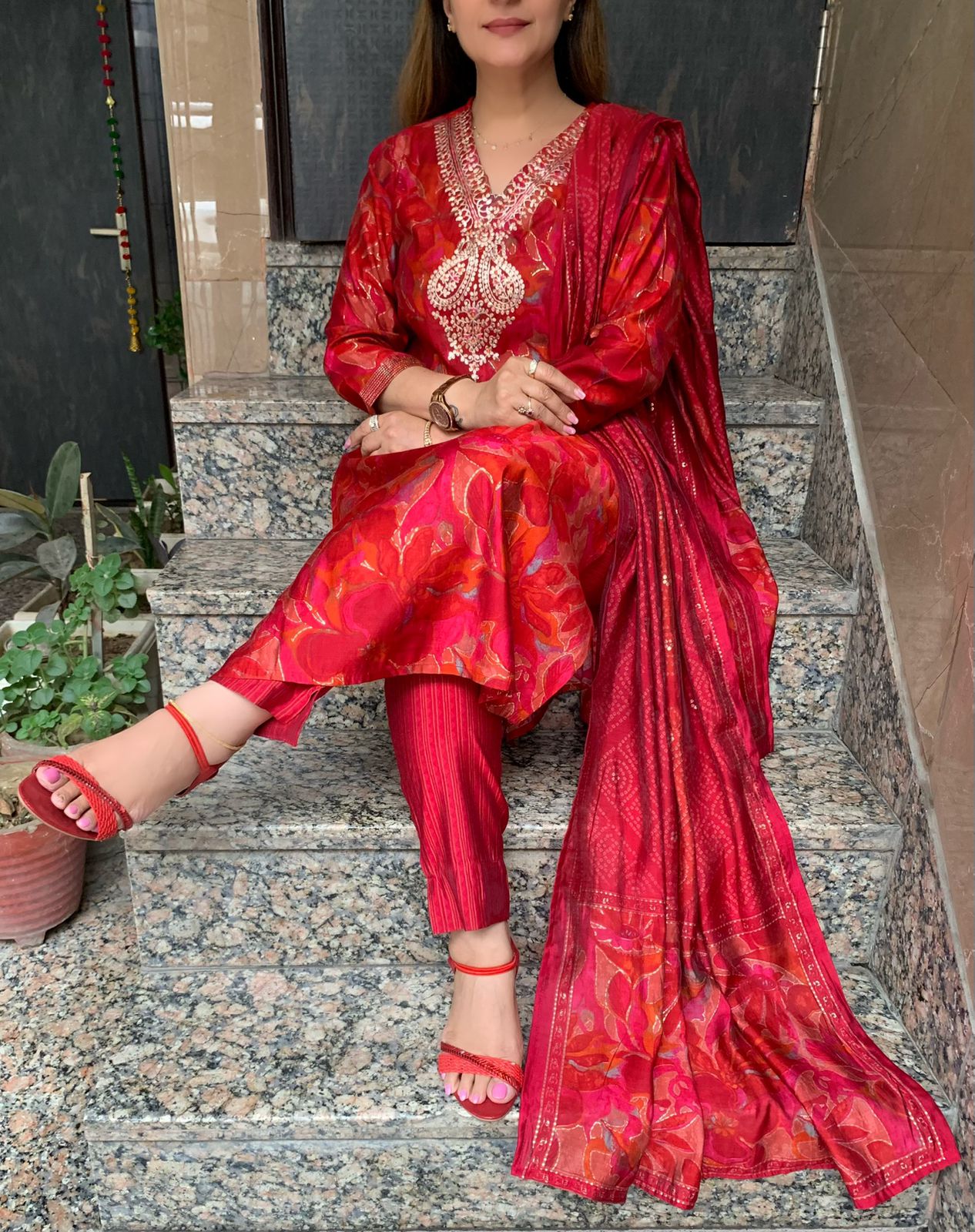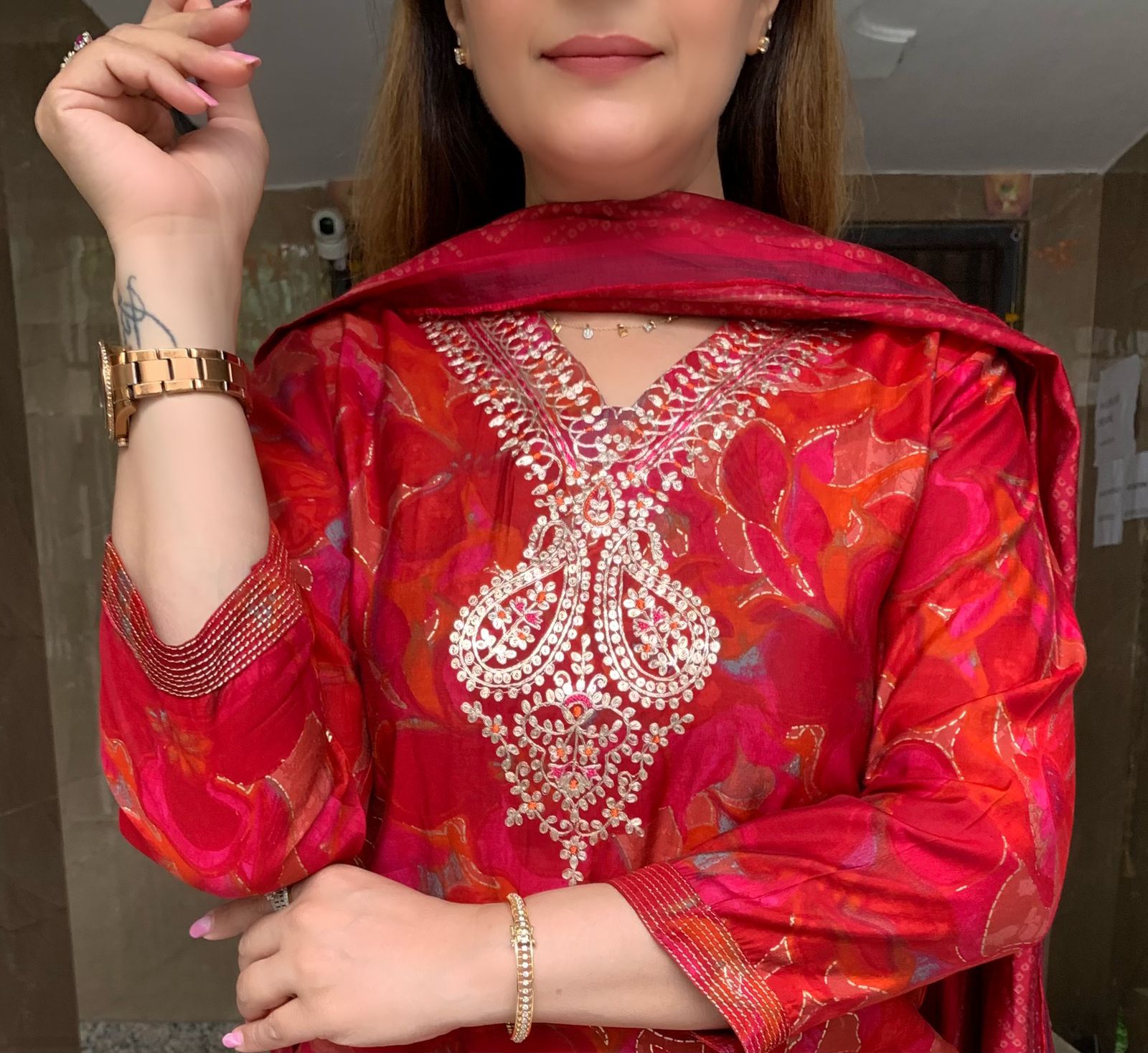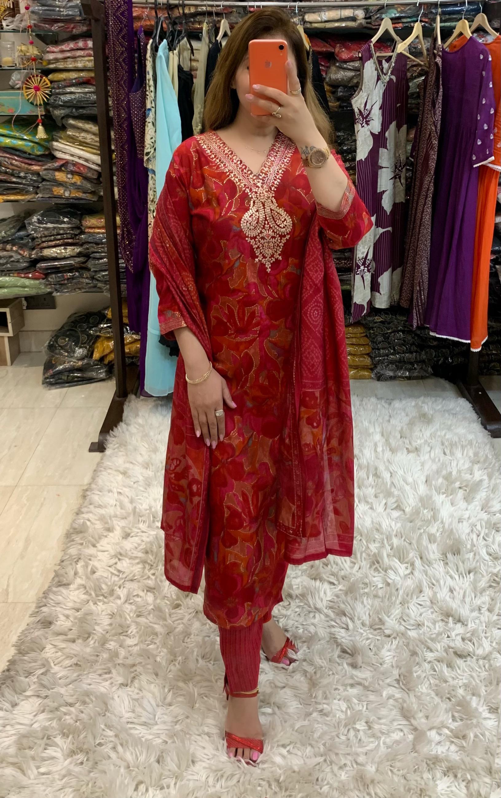 Elegant Printed Pure Muslin 3 Piece Kurti with Fine Badla Thread Work along with Pant and Dupatta