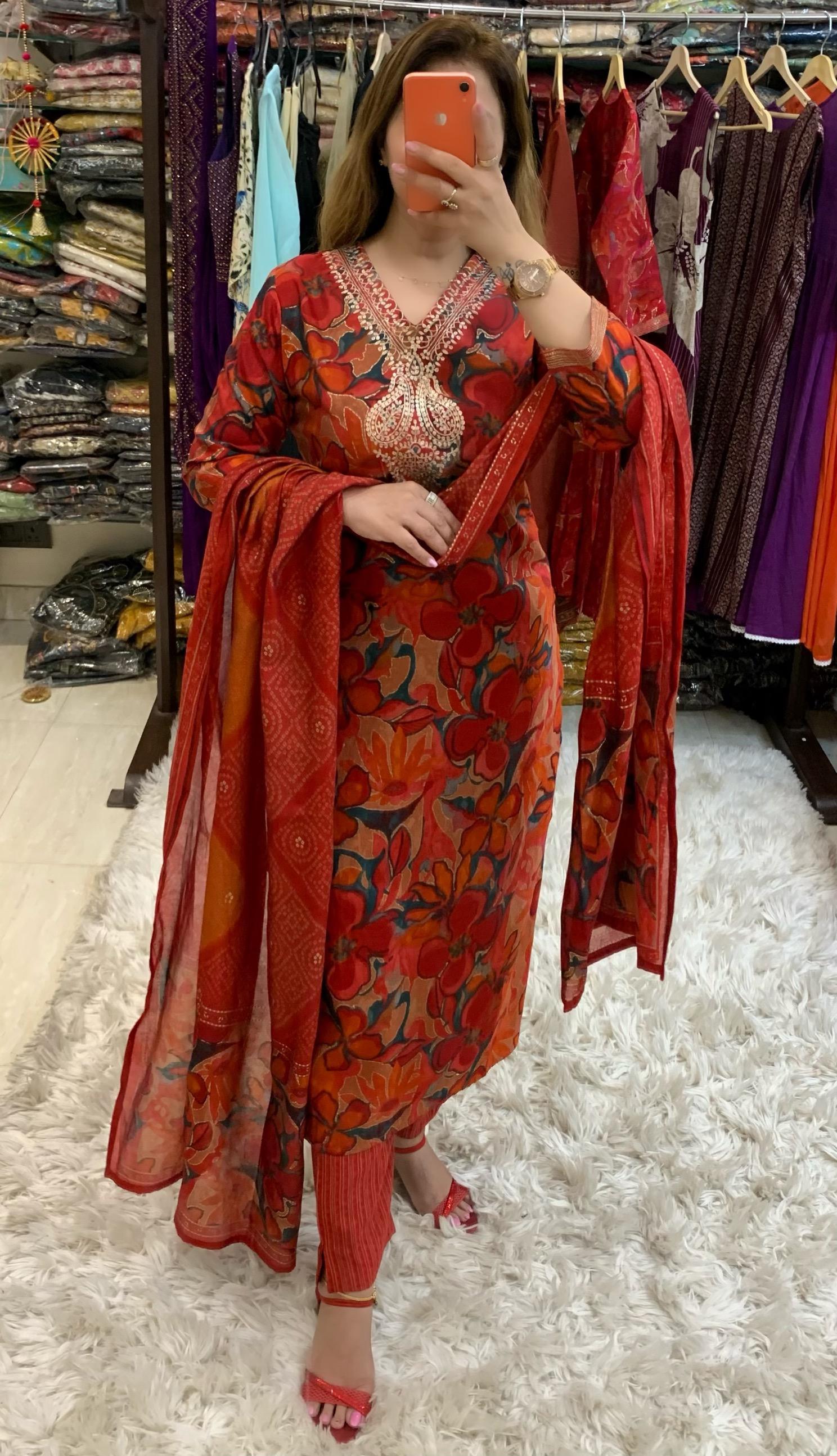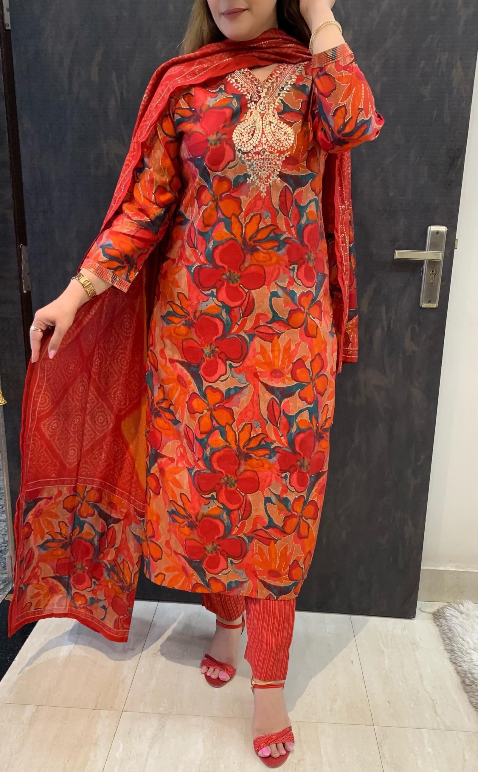 Elegant Printed Pure Muslin 3 Piece Kurti with Fine Badla Thread Work along with Pant and Dupatta