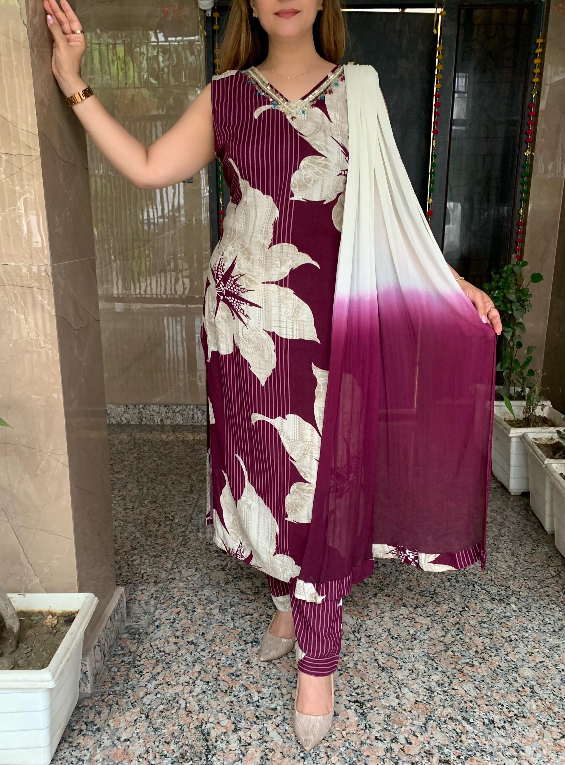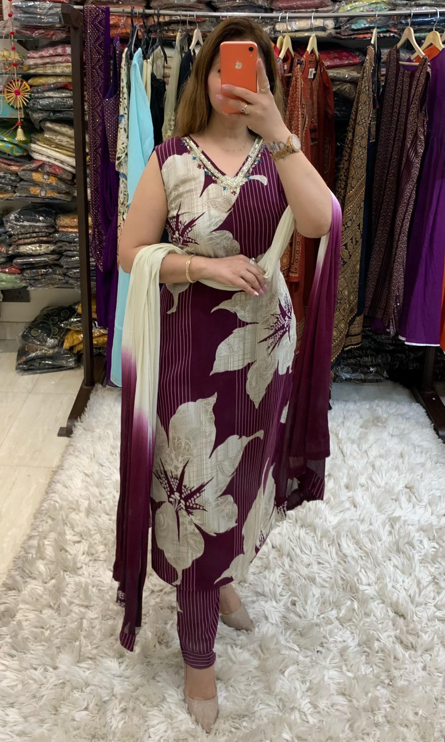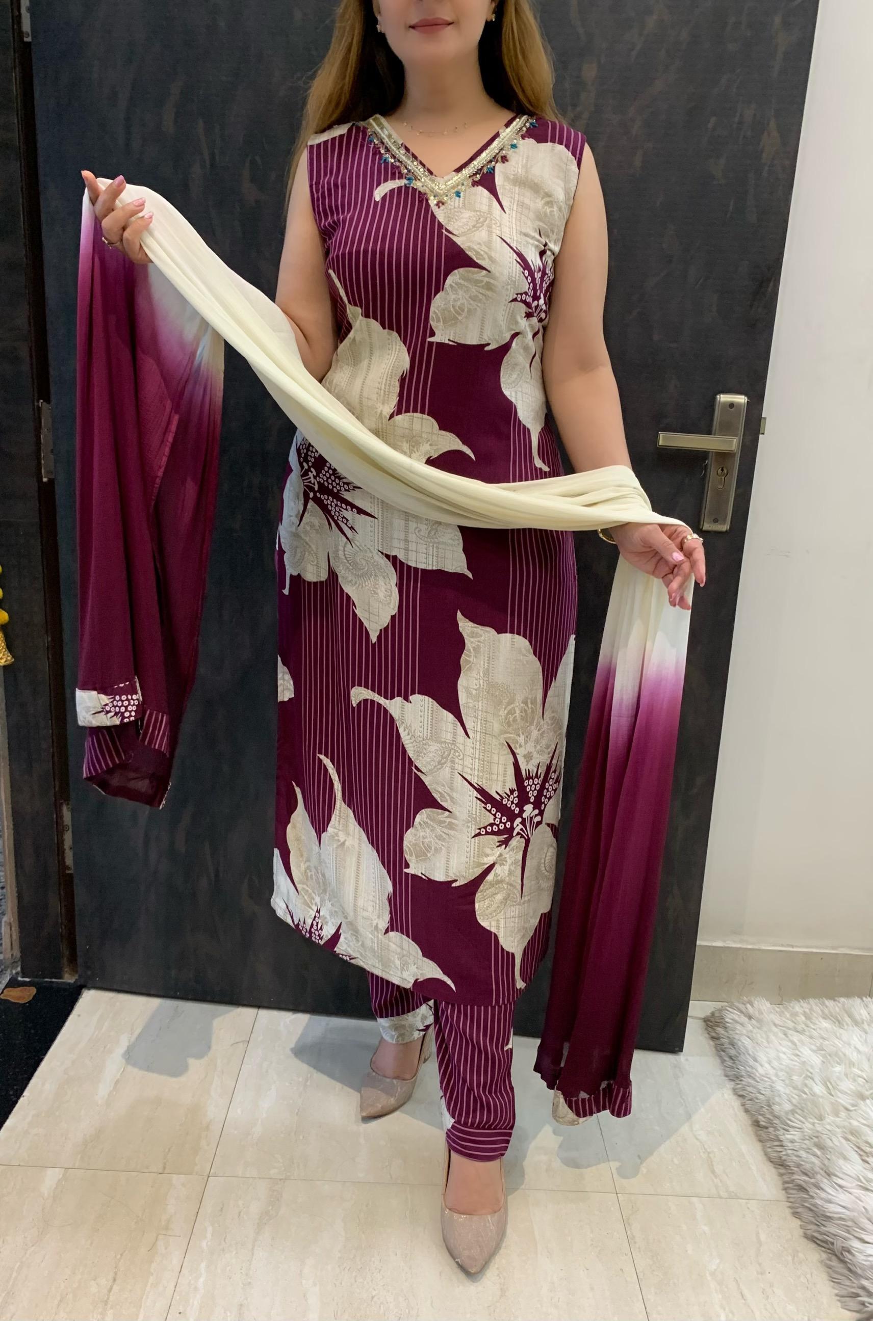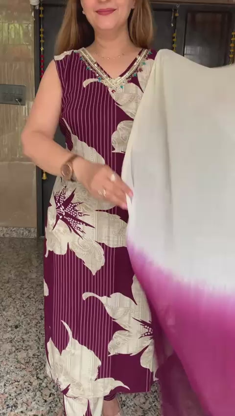 Beautiful Printed Rayon 3 Piece Kurti, Pant and Chiffon Dupatta Set with Fine Cutdana, Sequin Pearl and Thread Hand work