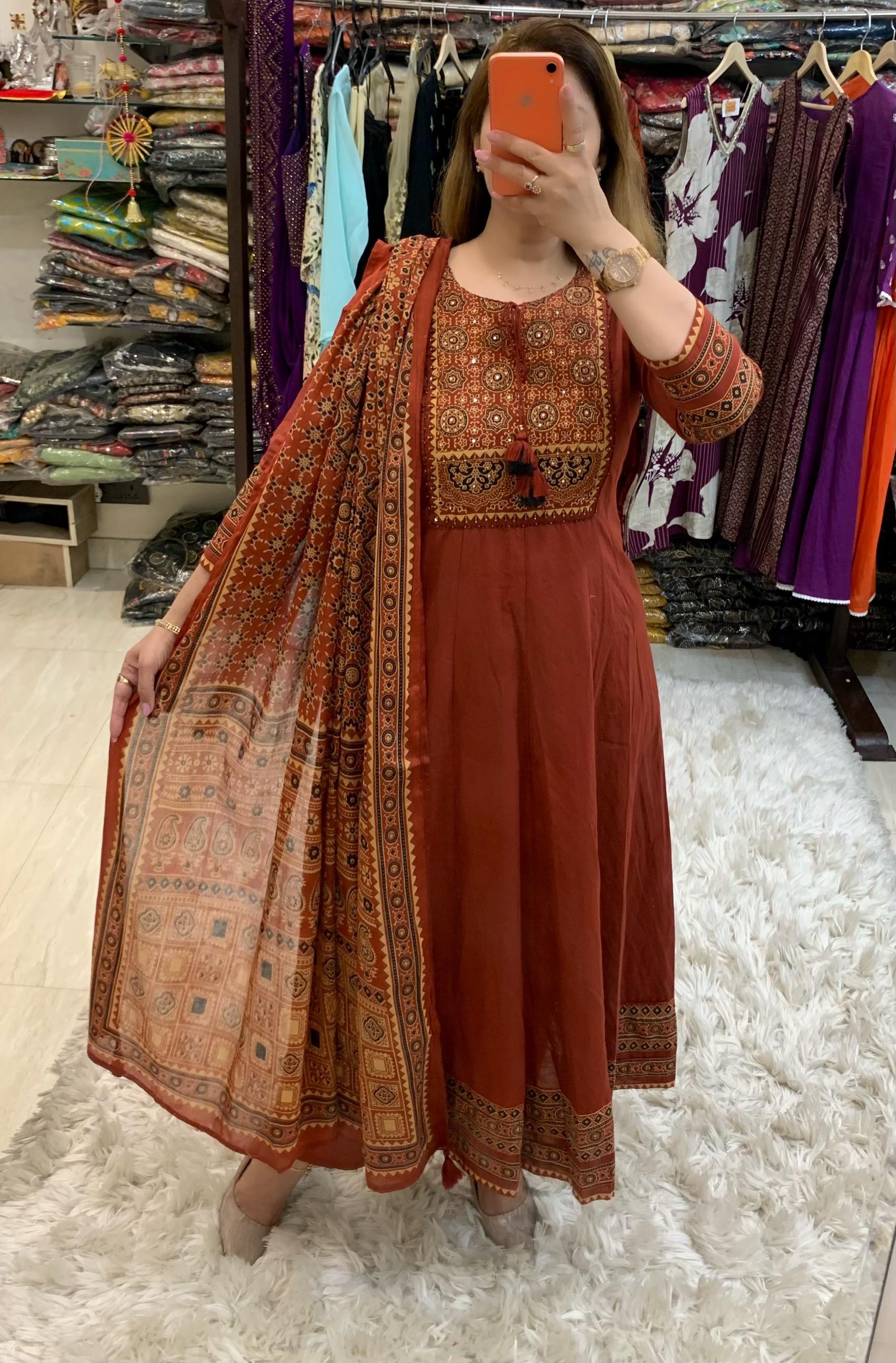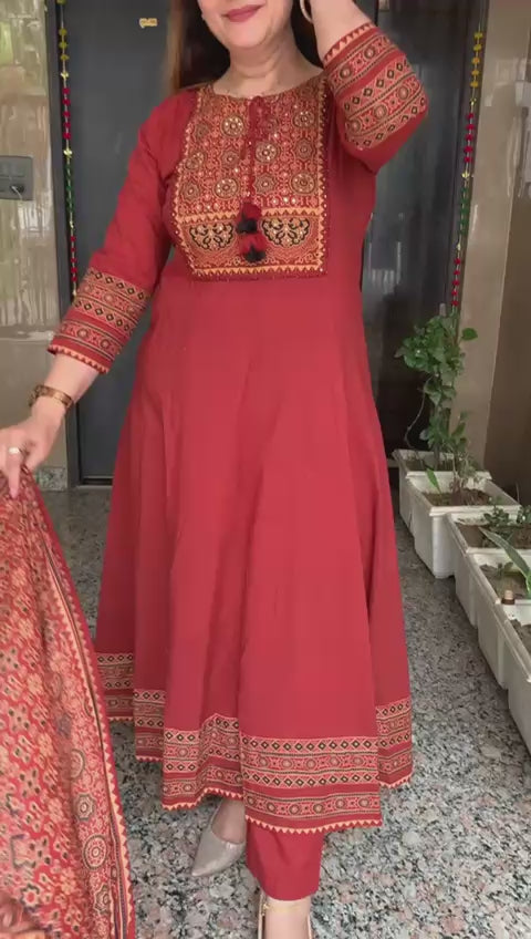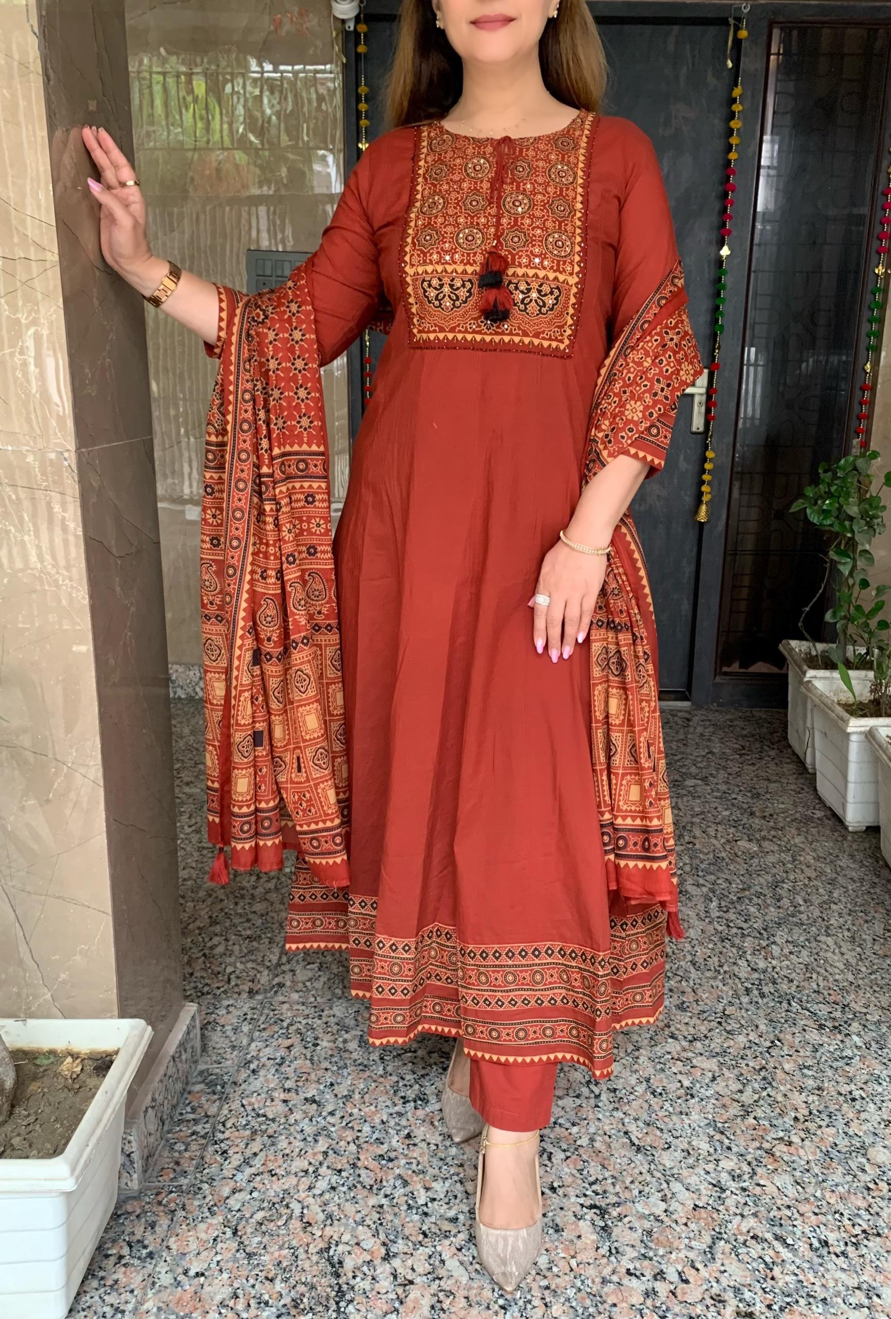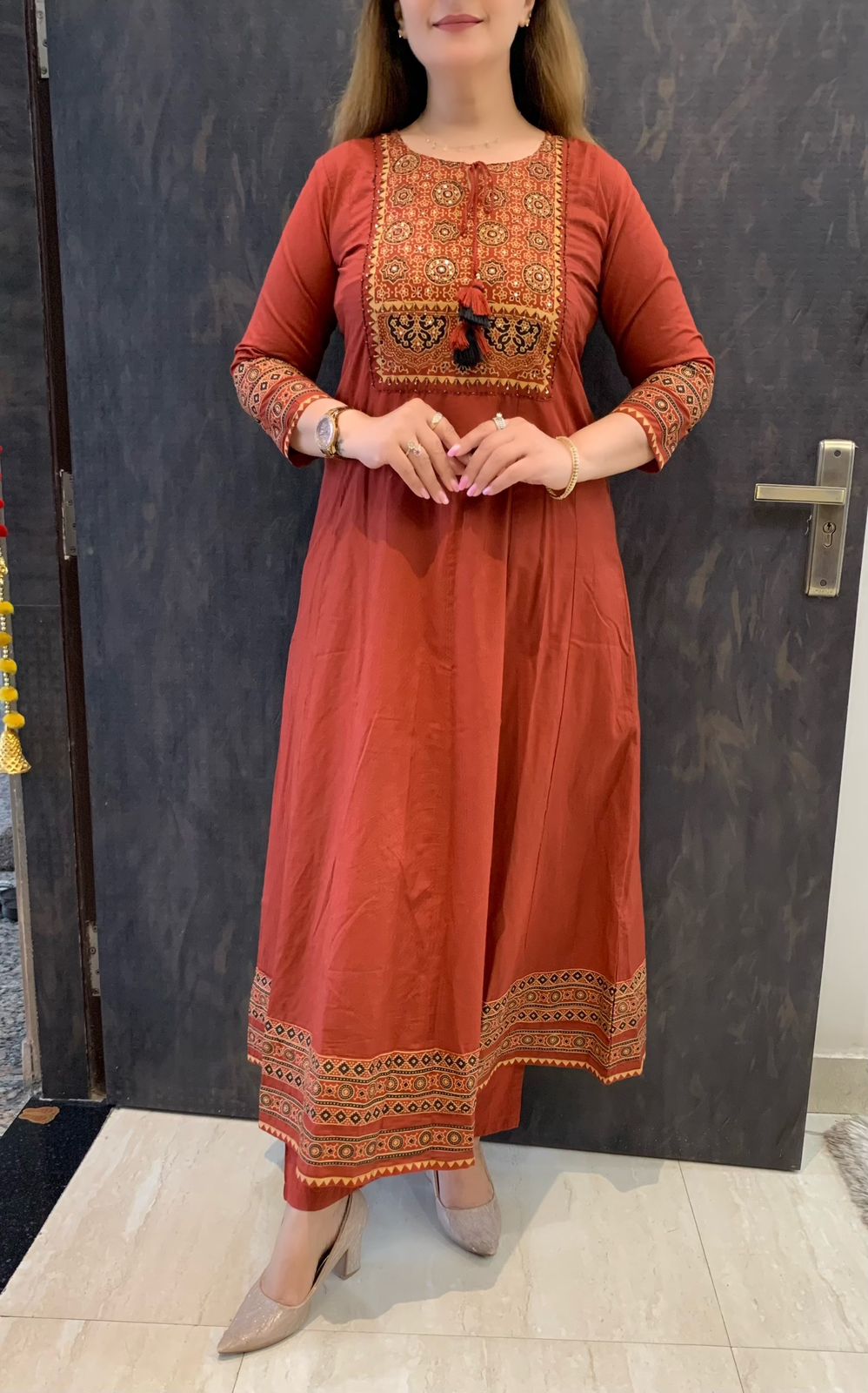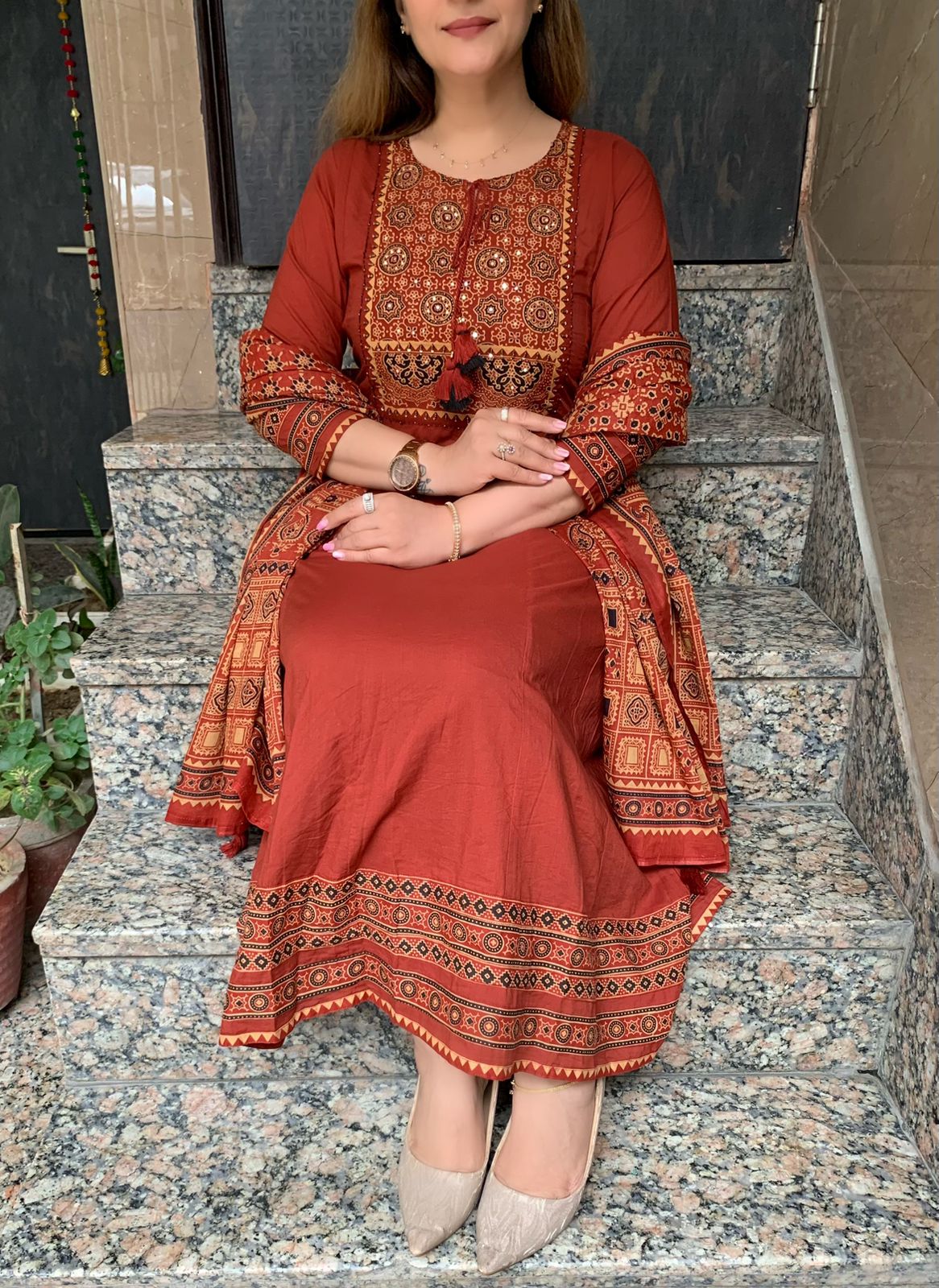 Beautiful Pure Cotton 3 Piece Anarkali Kurti with Kalamkari Patch, Beads and Sequin Work along with Pant and Dupatta