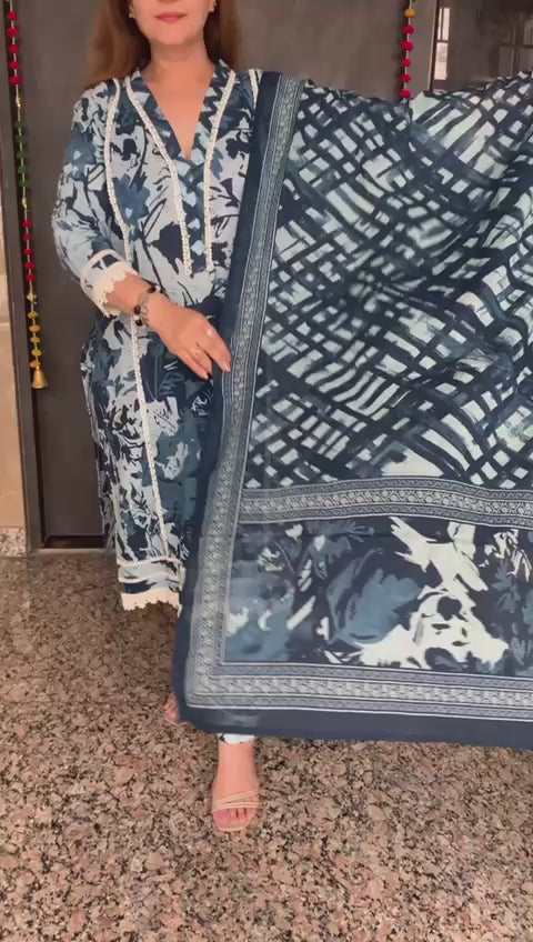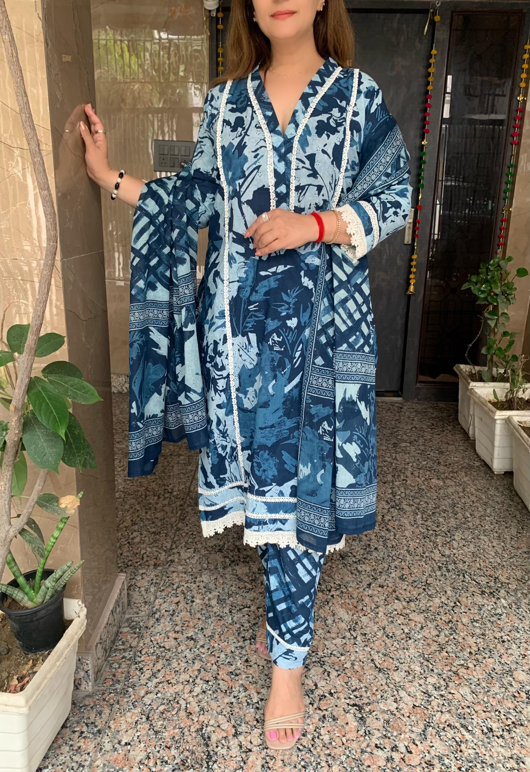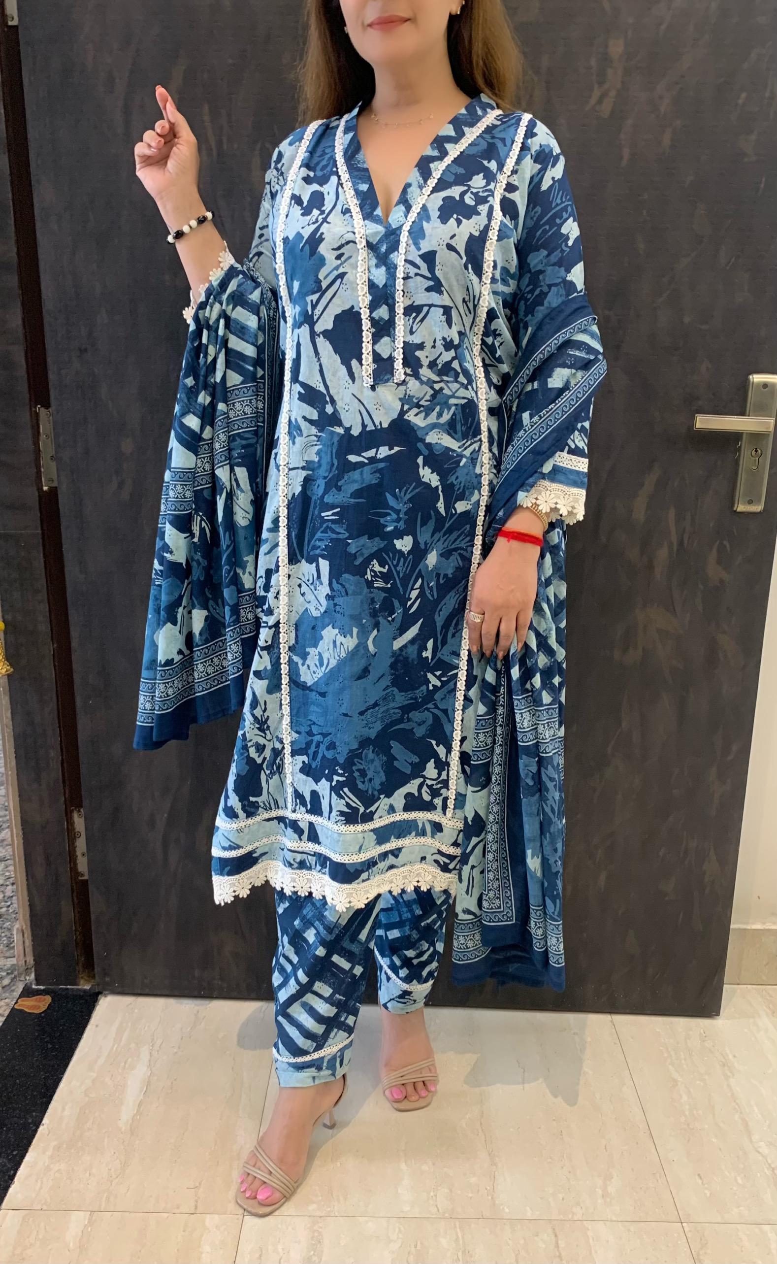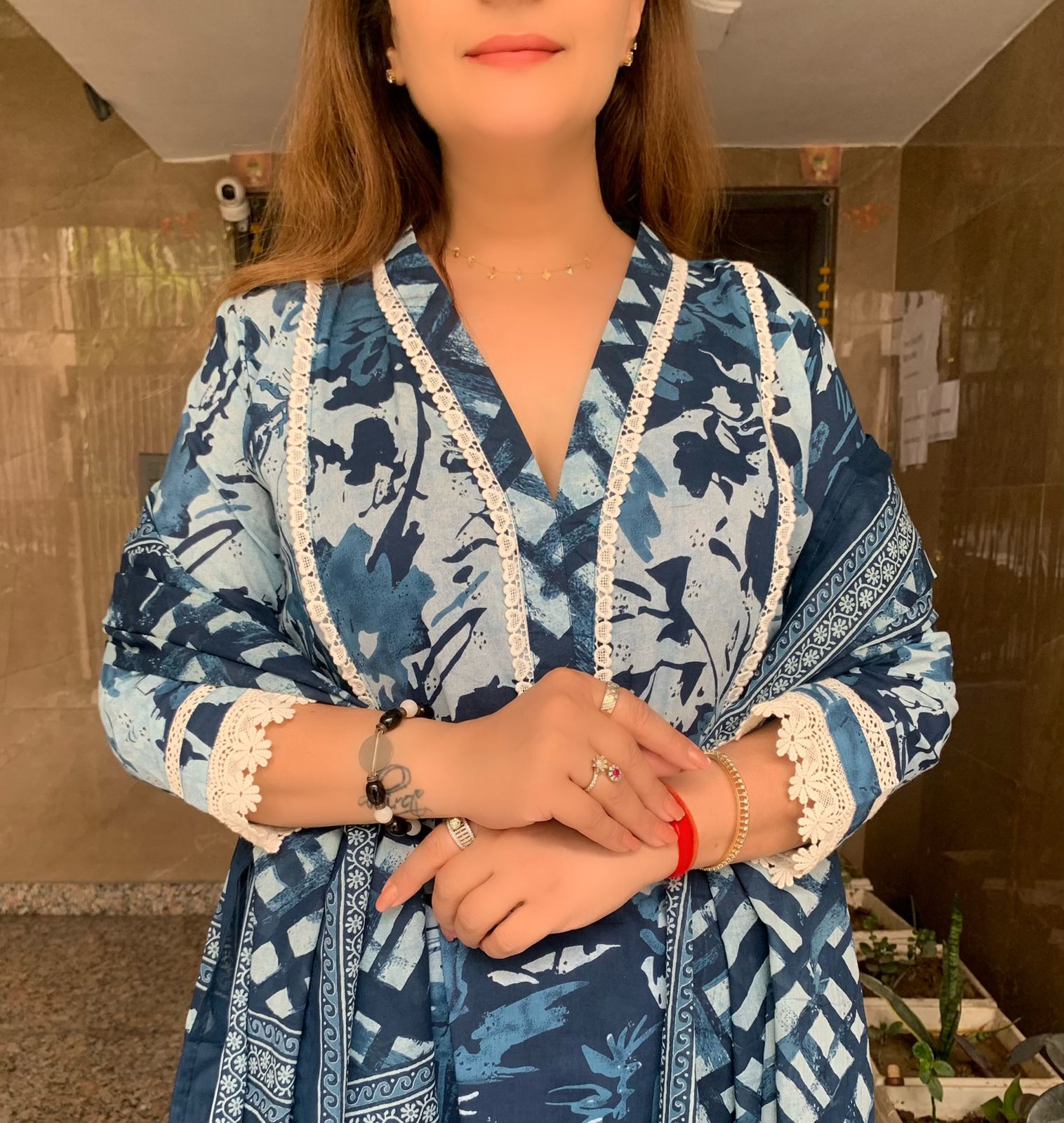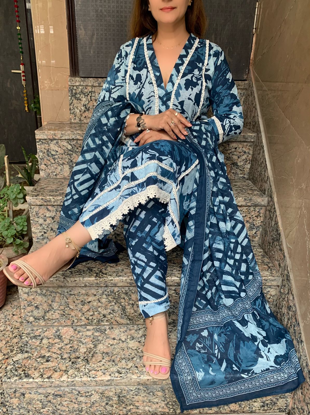 Beautiful Printed Cotton 3 Piece Kurti, Dupatta & Pant Set with Crochet Lace Work