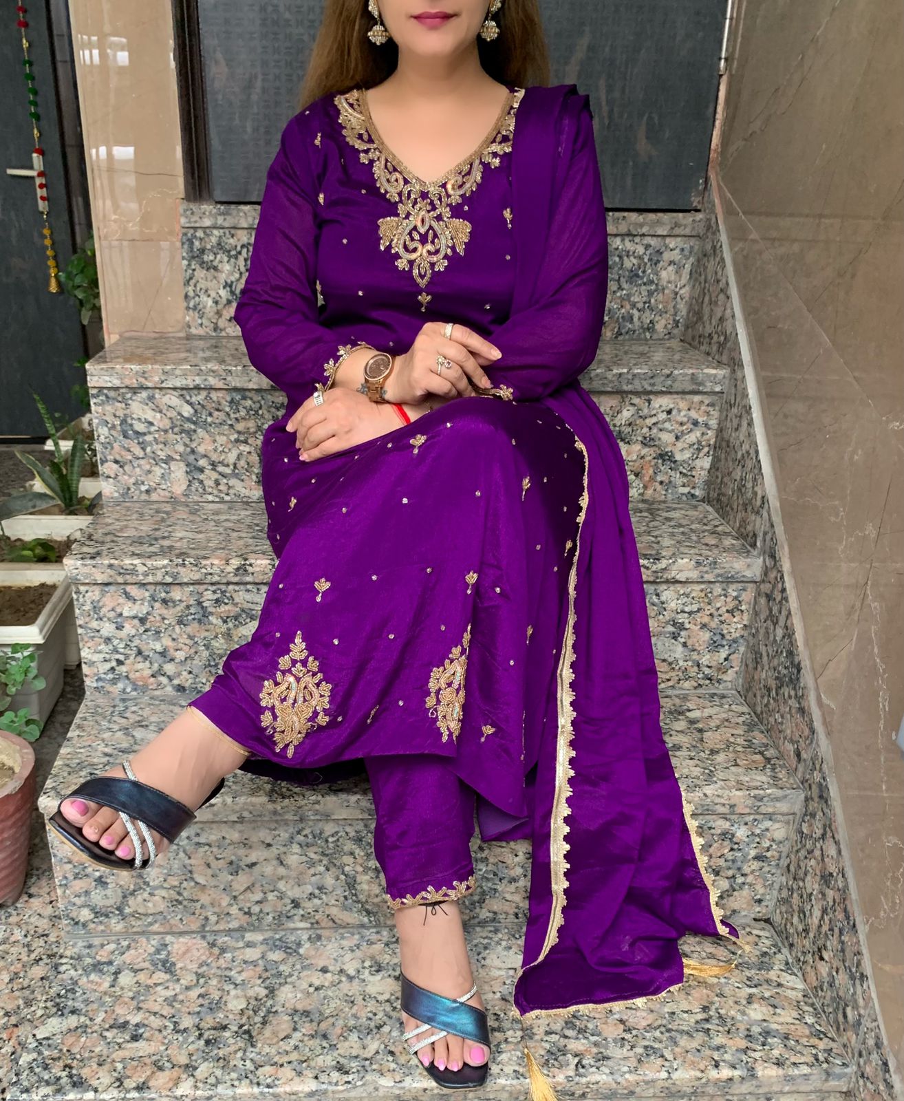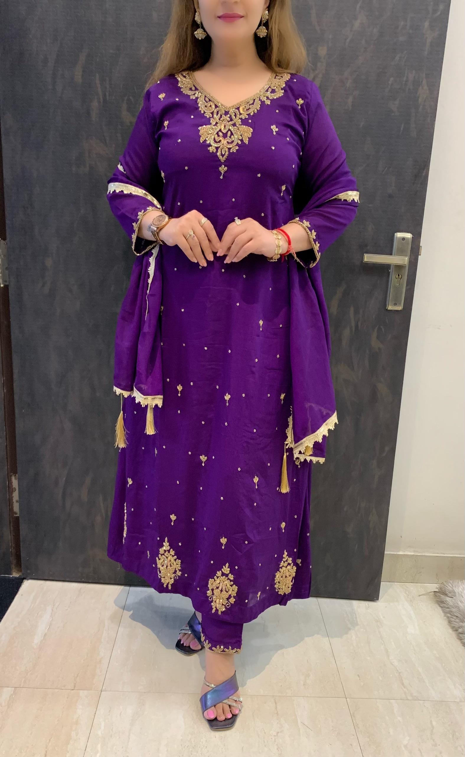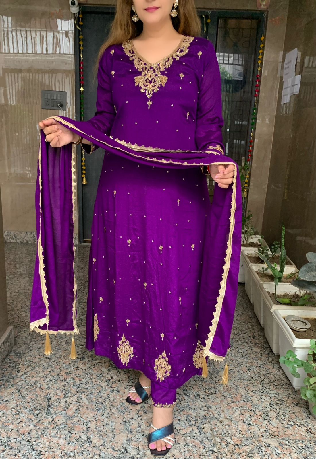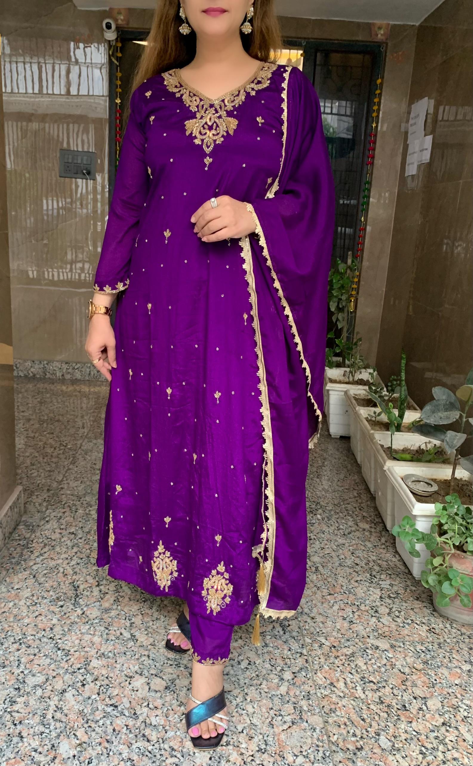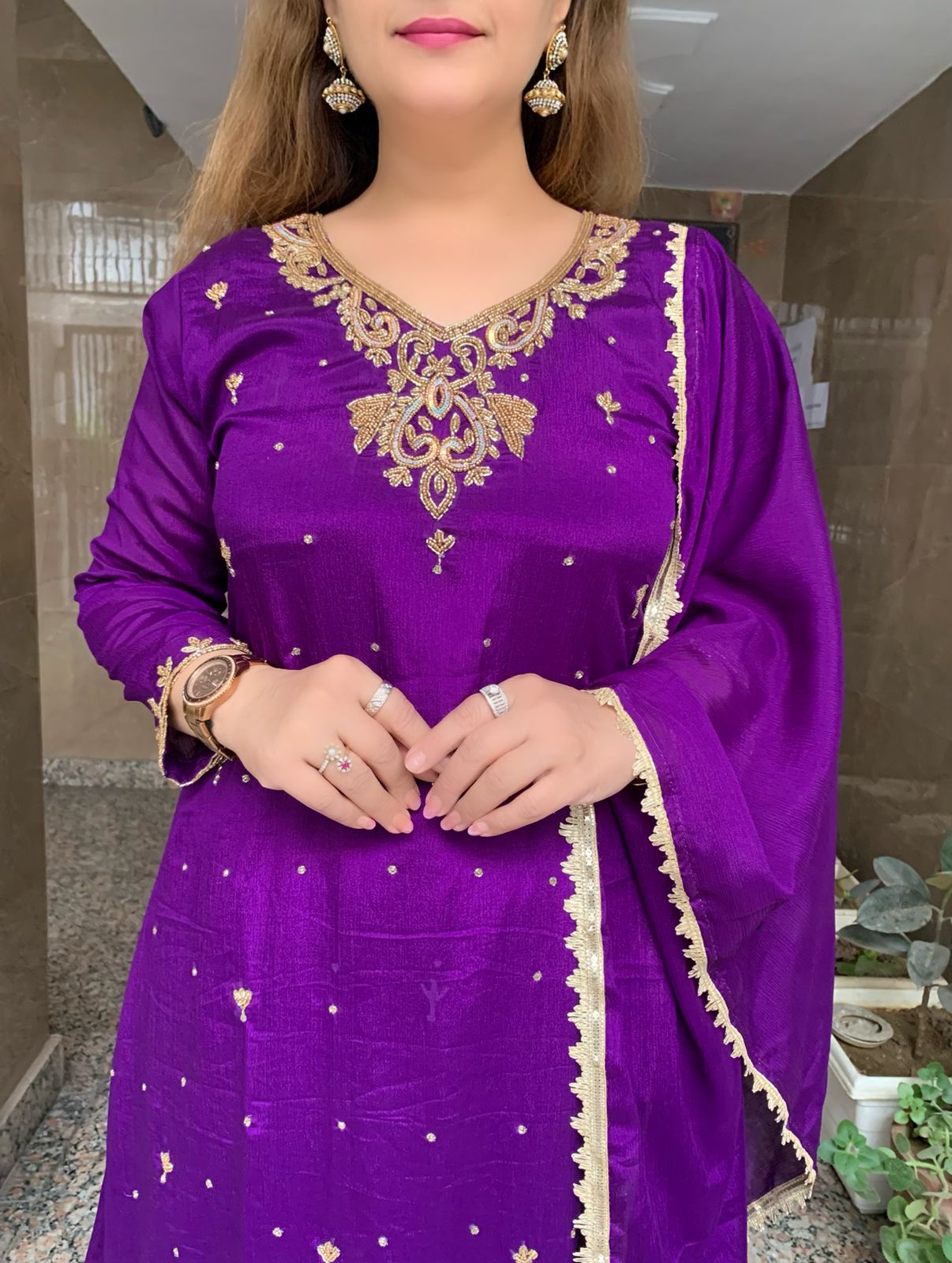 Classy Pure Chinnon Full Lining 3 piece A-Symmetrical Kurti with Fine Nalki, Sequin and Bead Handwork Paired with Pant and Dupatta