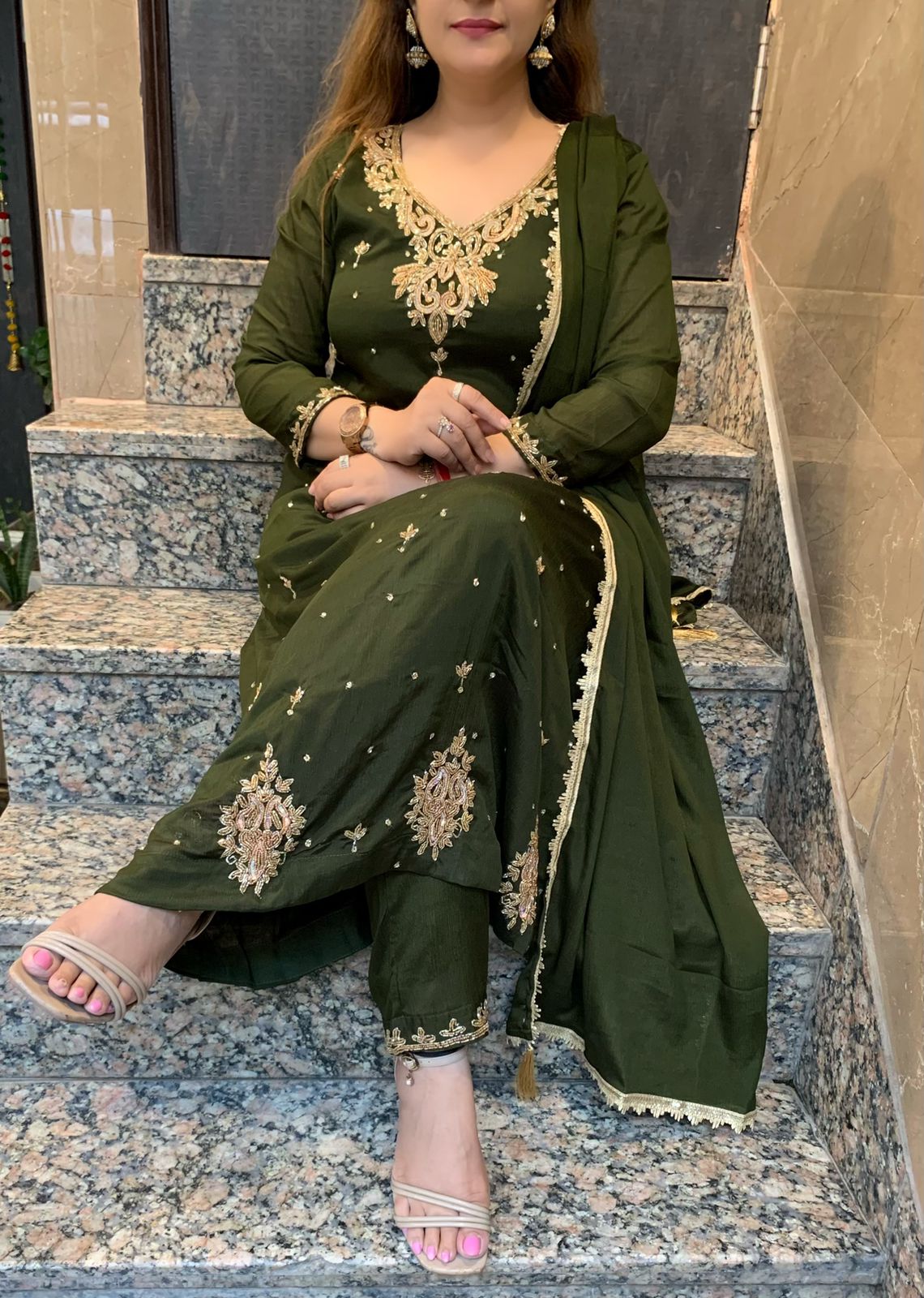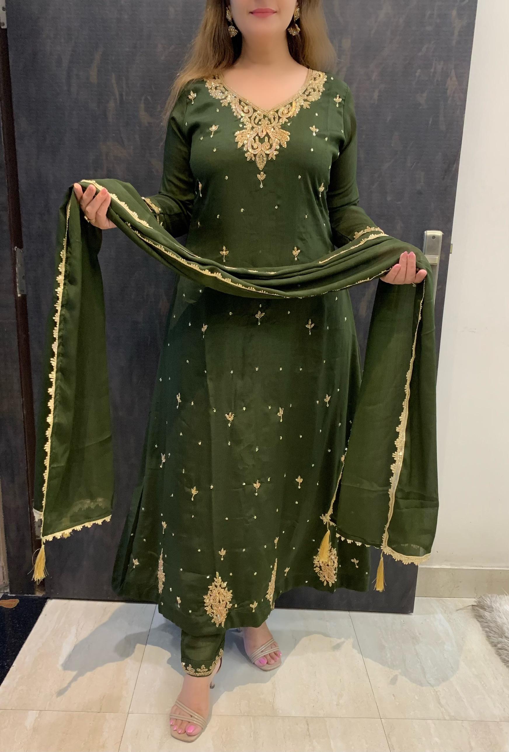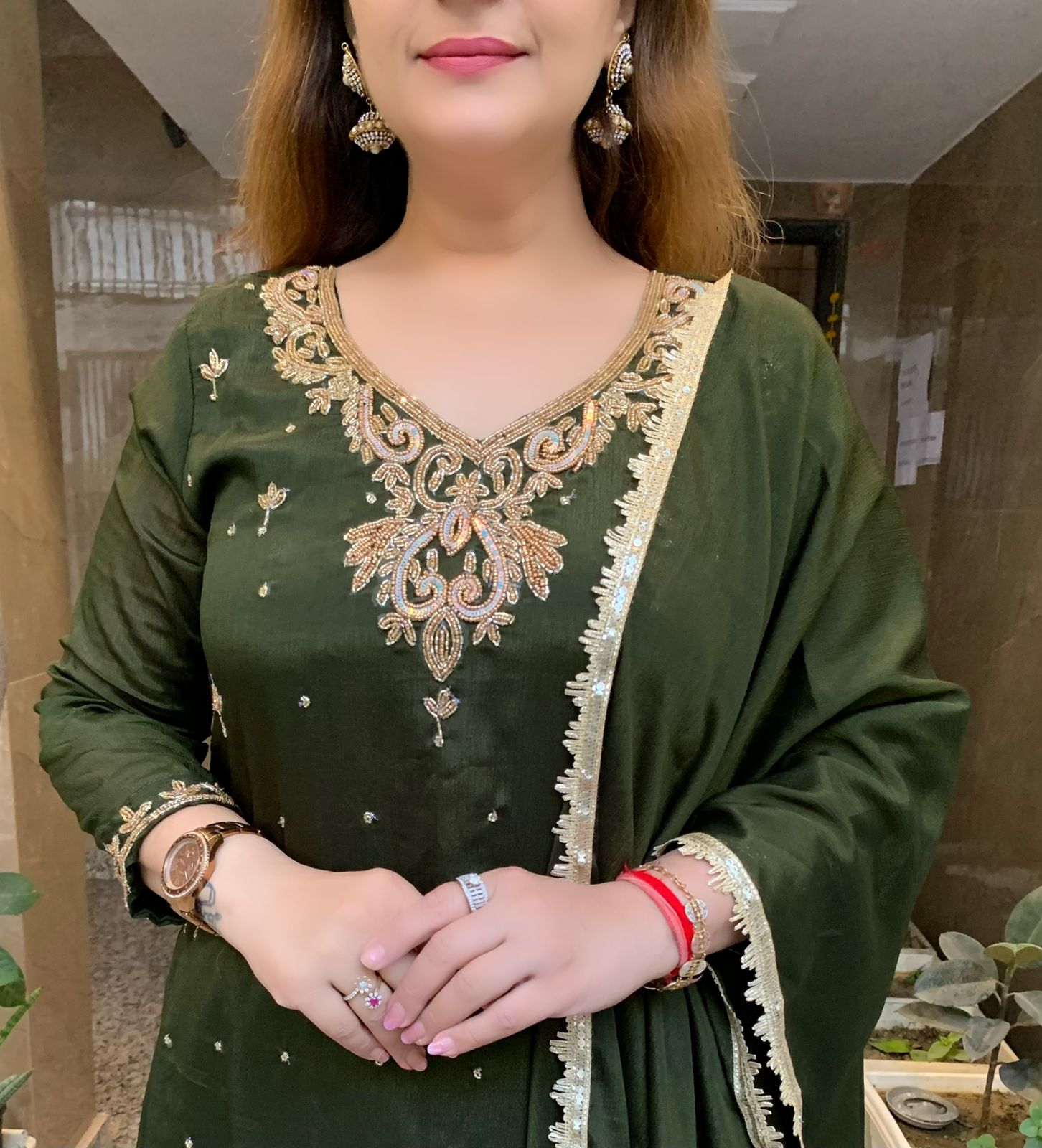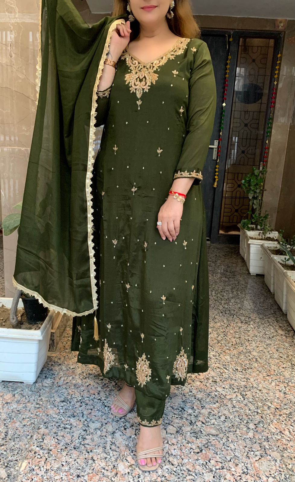 Classy Pure Chinnon Full Lining 3 piece A-Symmetrical Kurti with Fine Nalki, Sequin and Bead Handwork Paired with Pant and Dupatta