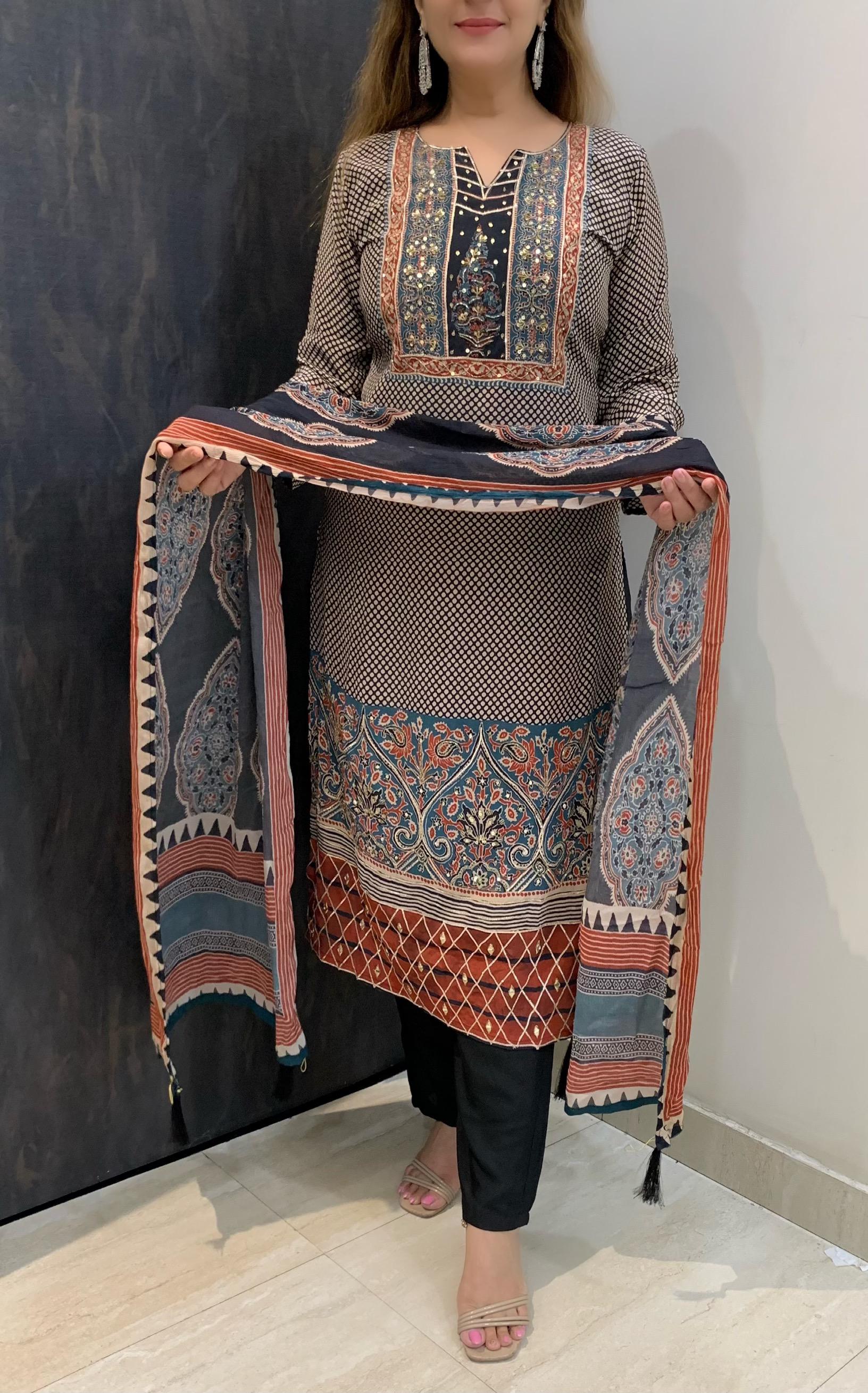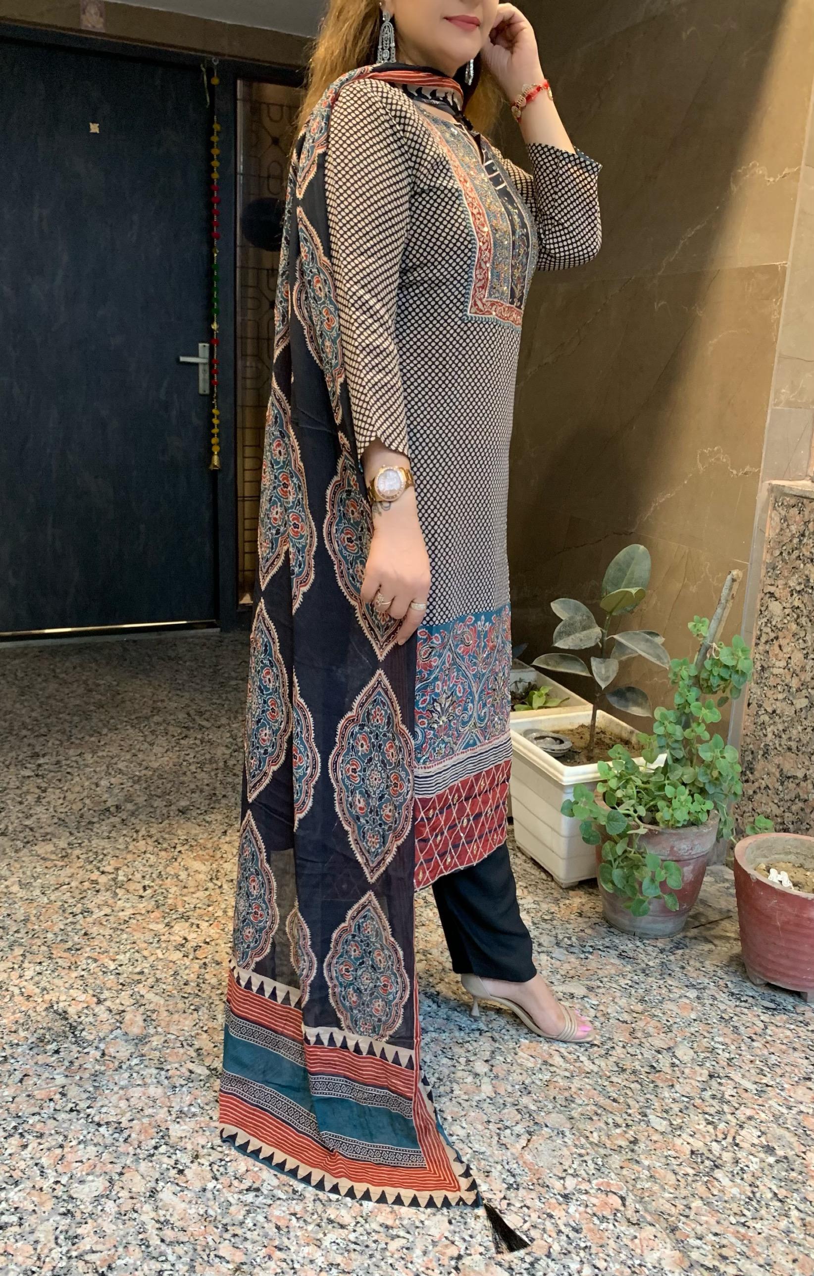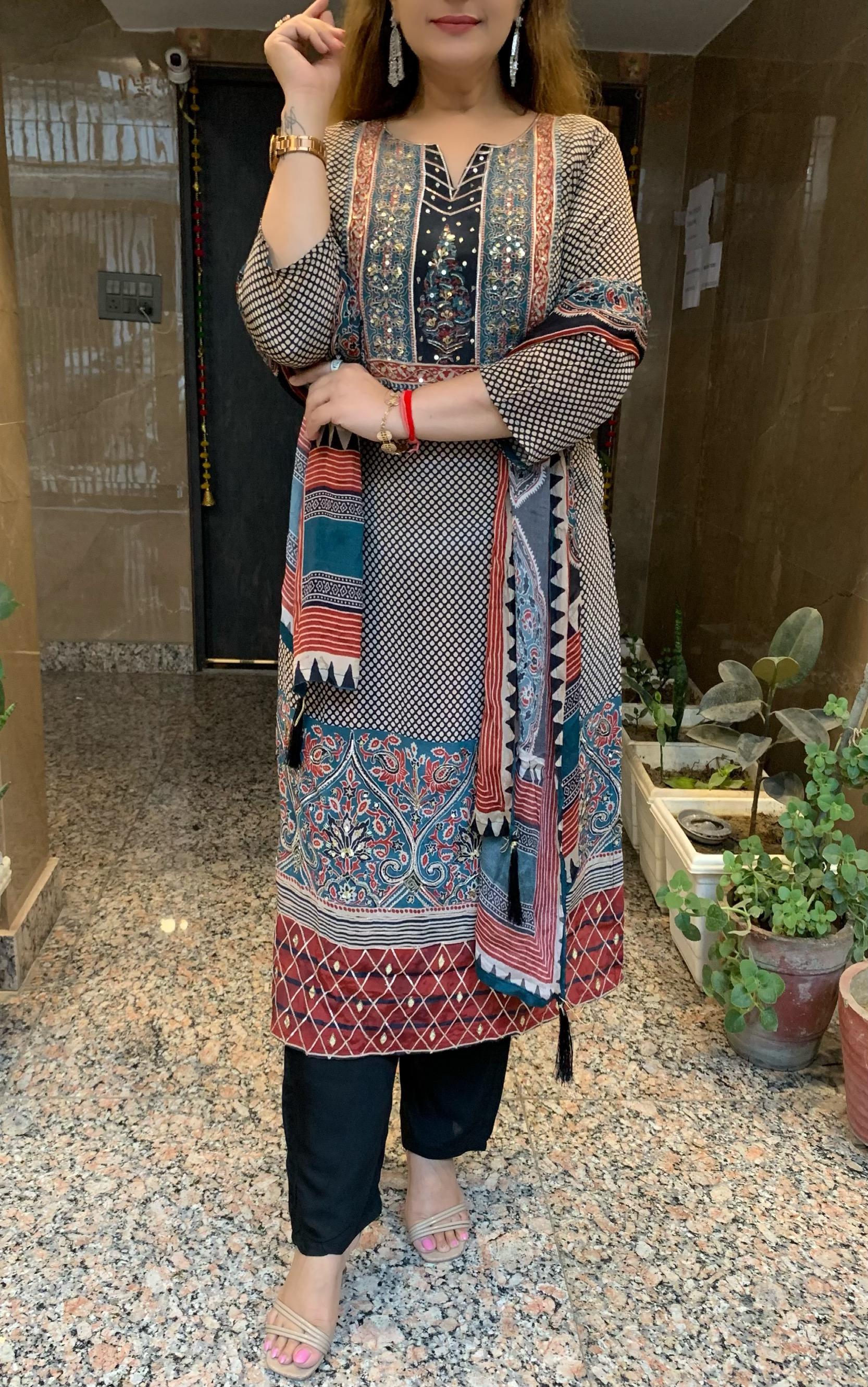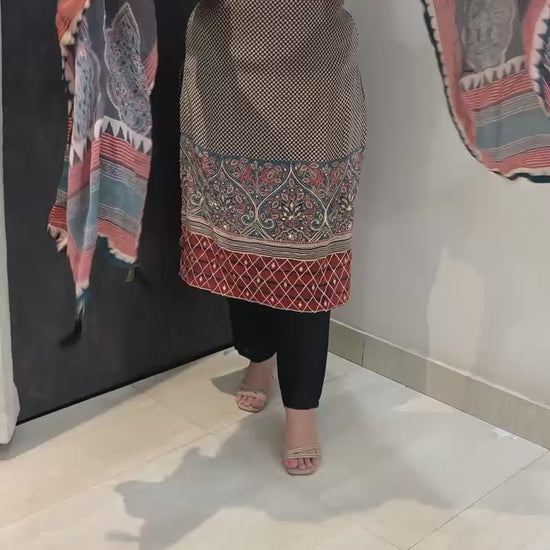 Classy Pure 3 Piece Digital Print Crepe Lining Kurti Set with Fine Gotta Detailing Sequin and Nalki work along with Shantoon Pant and Pure Chinnon Dupatta