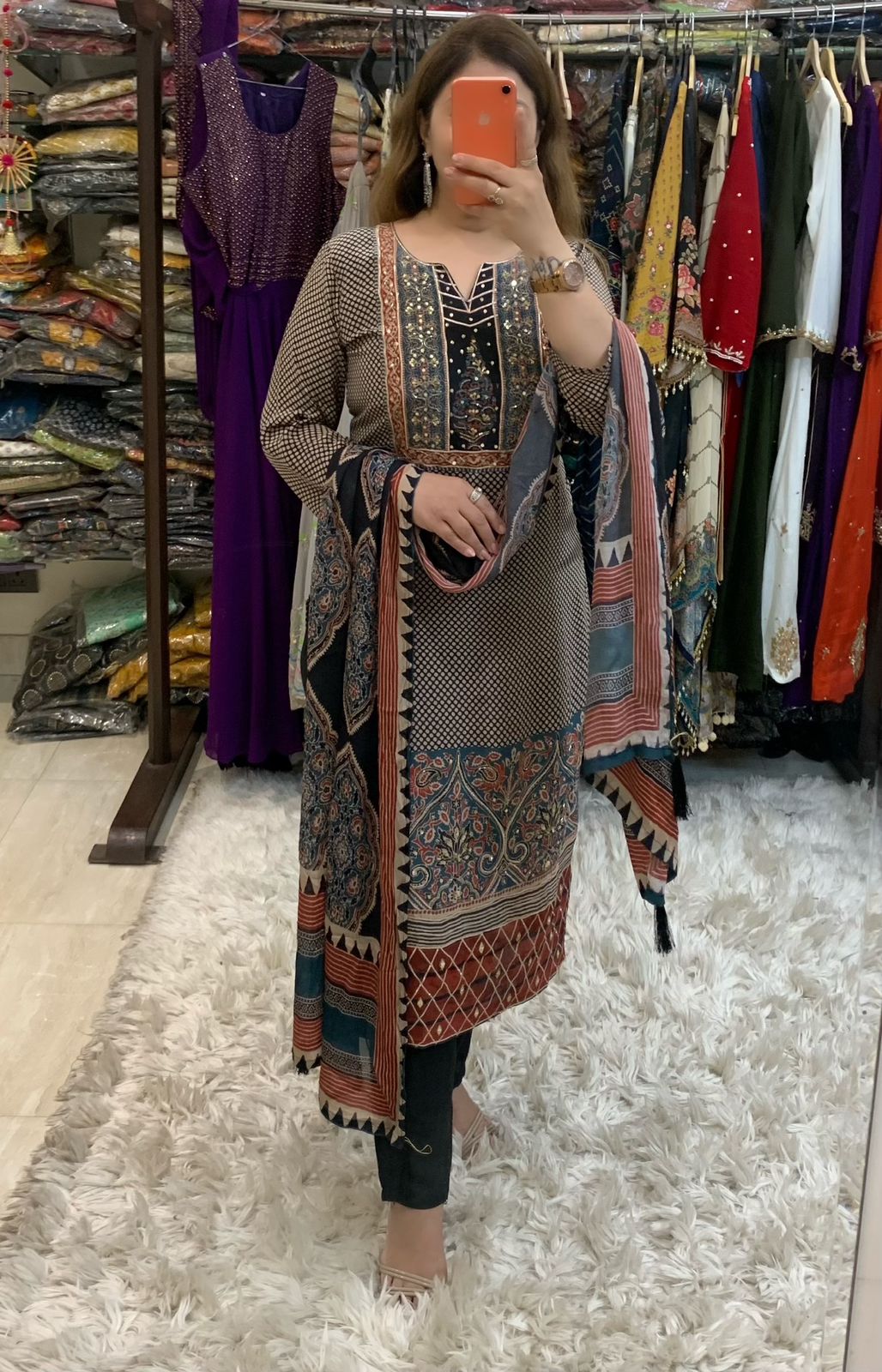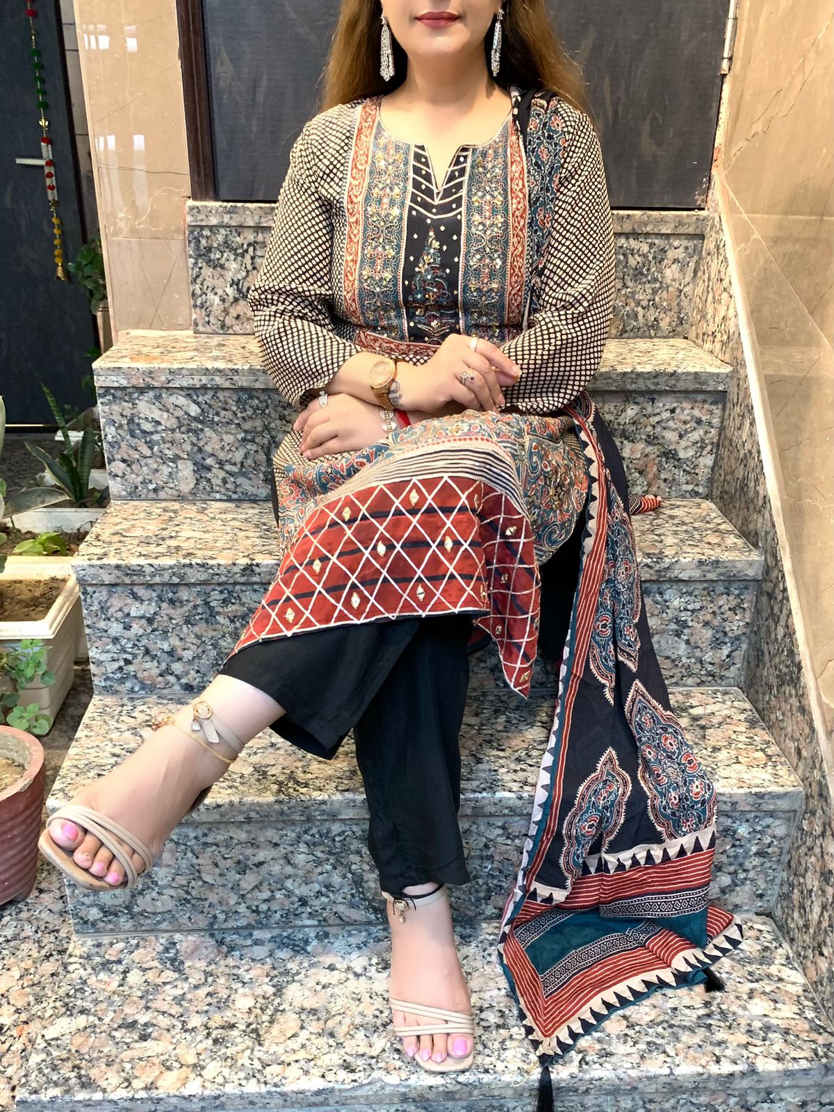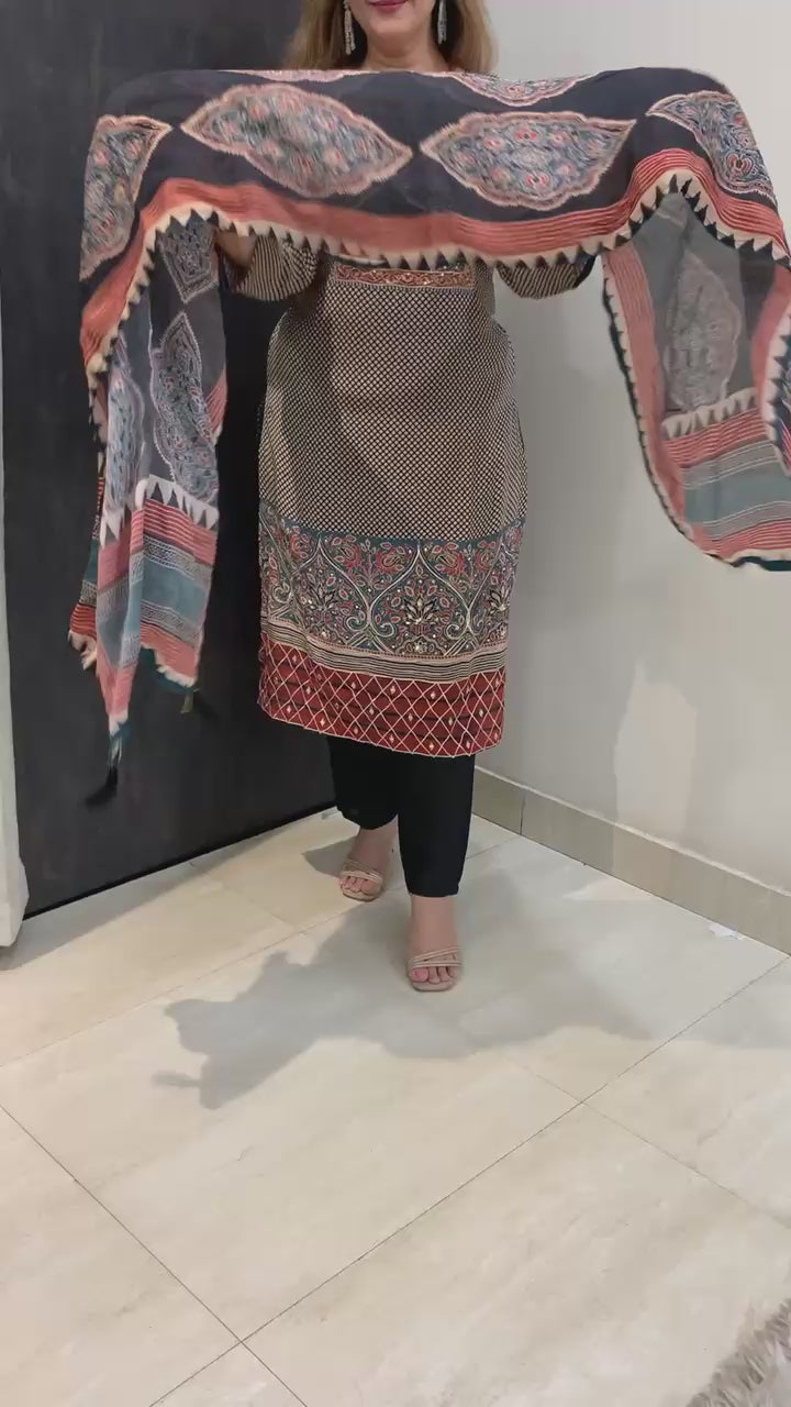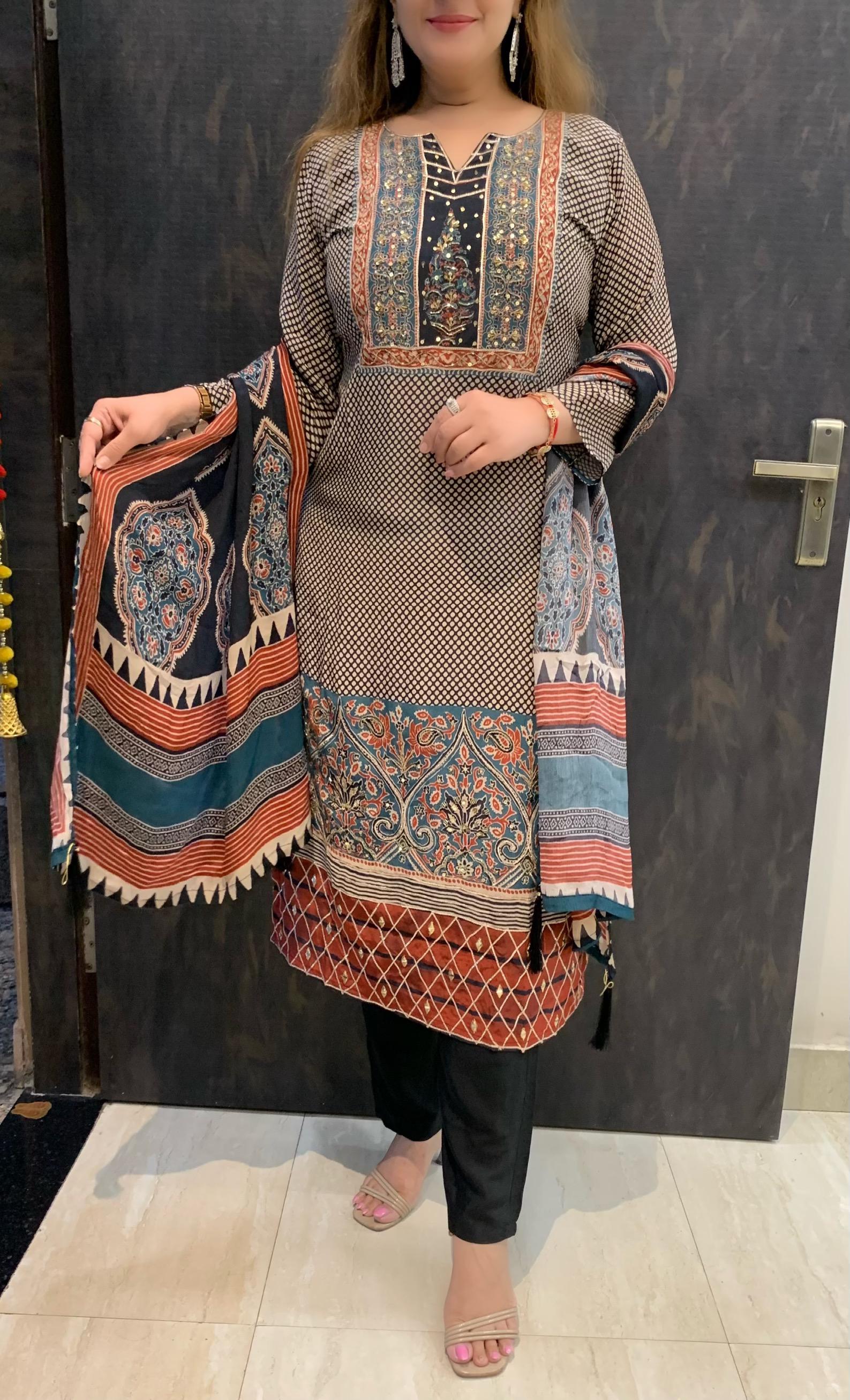 Classy Pure 3 Piece Digital Print Crepe Lining Kurti Set with Fine Gotta Detailing Sequin and Nalki work along with Shantoon Pant and Pure Chinnon Dupatta