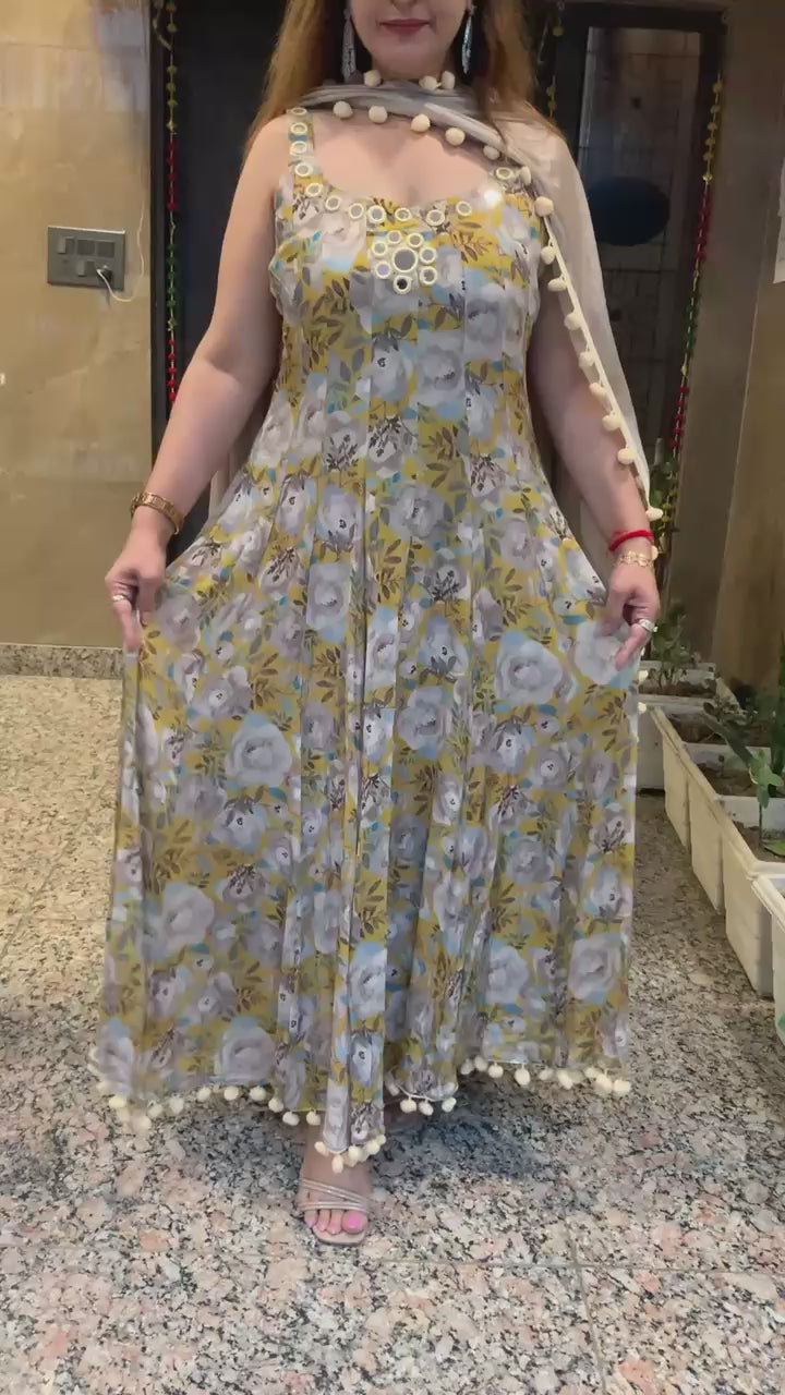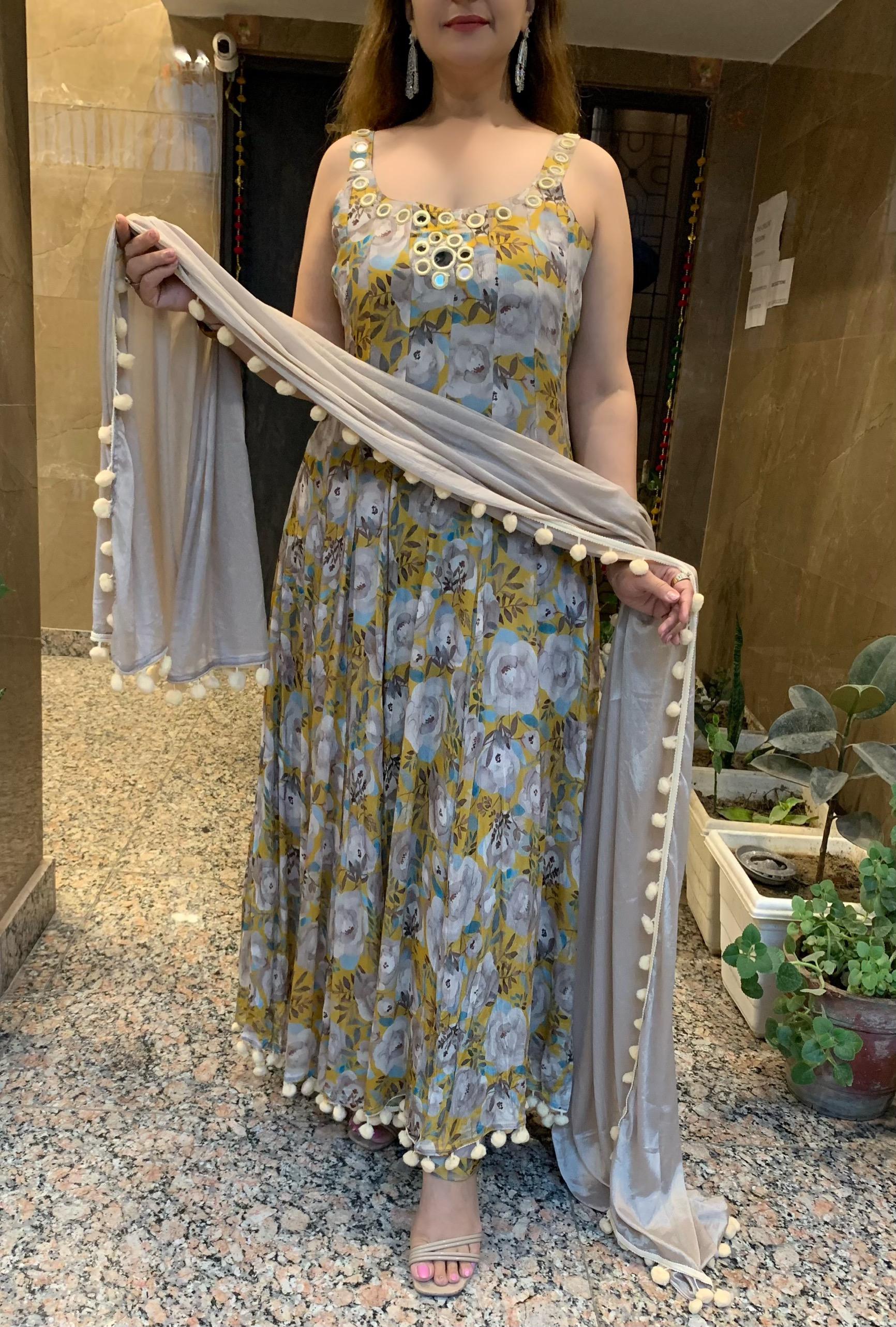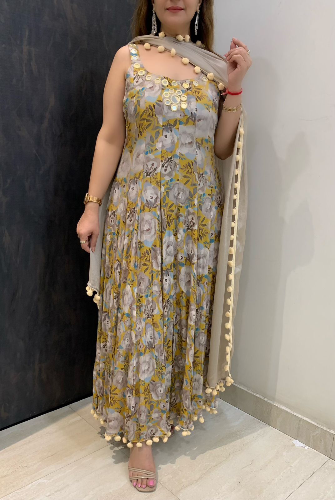 Classy Floral Print Pure Chinnon Kalidaar kurti with Real Mirror and Pompom Lace Work along with Roman Silk Pant and Chinnon Dupatta