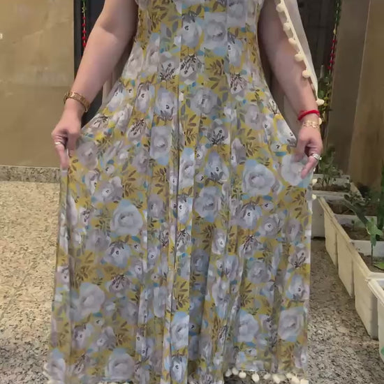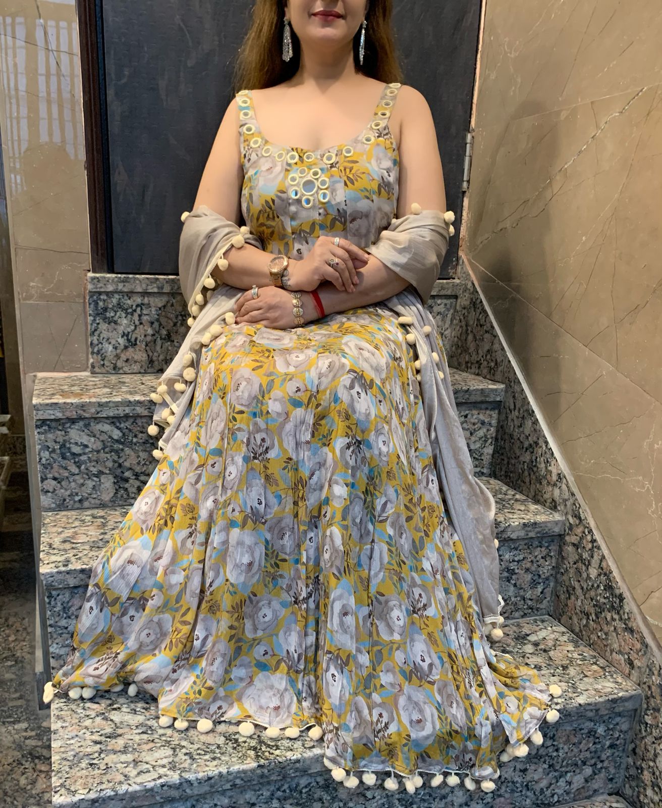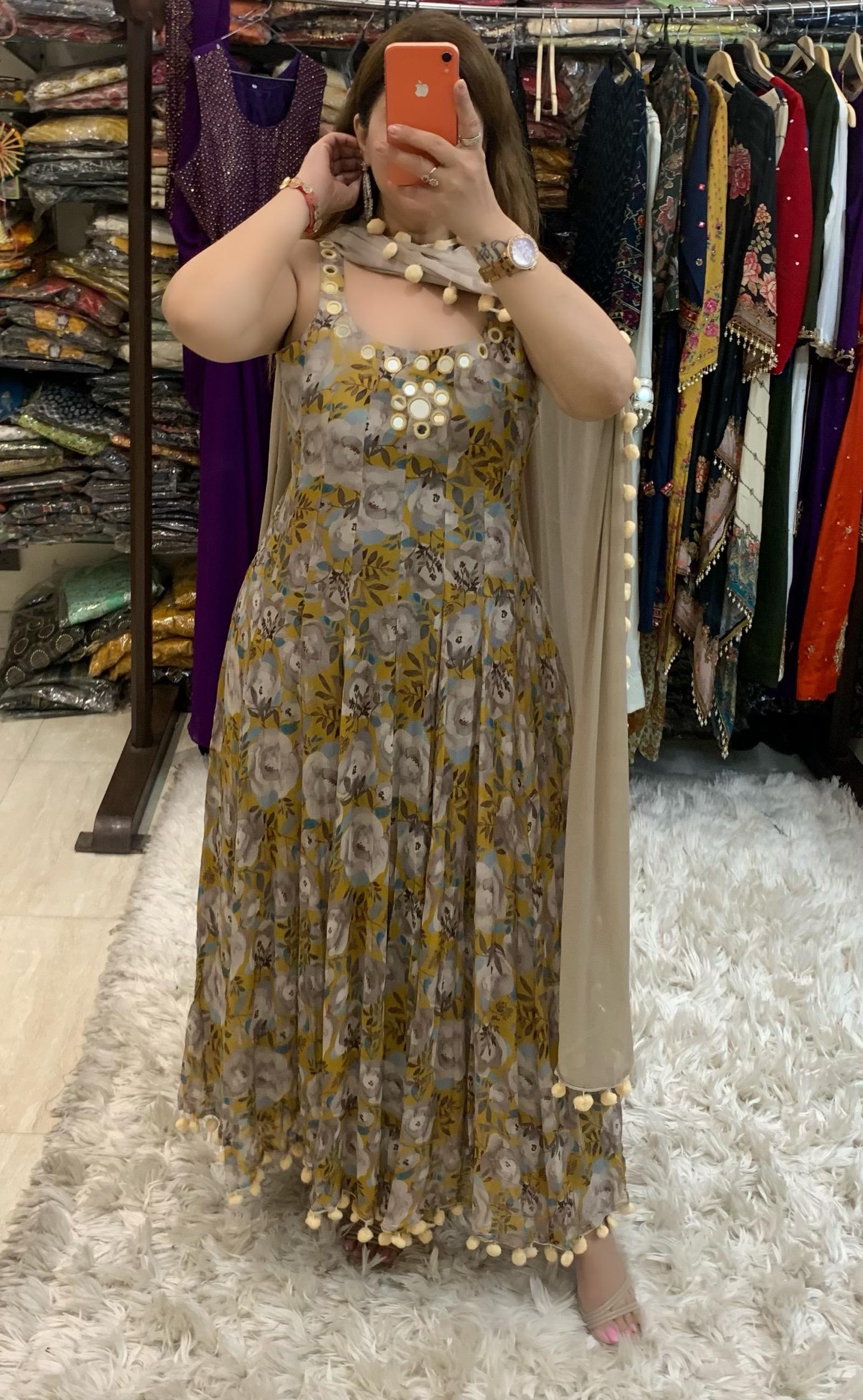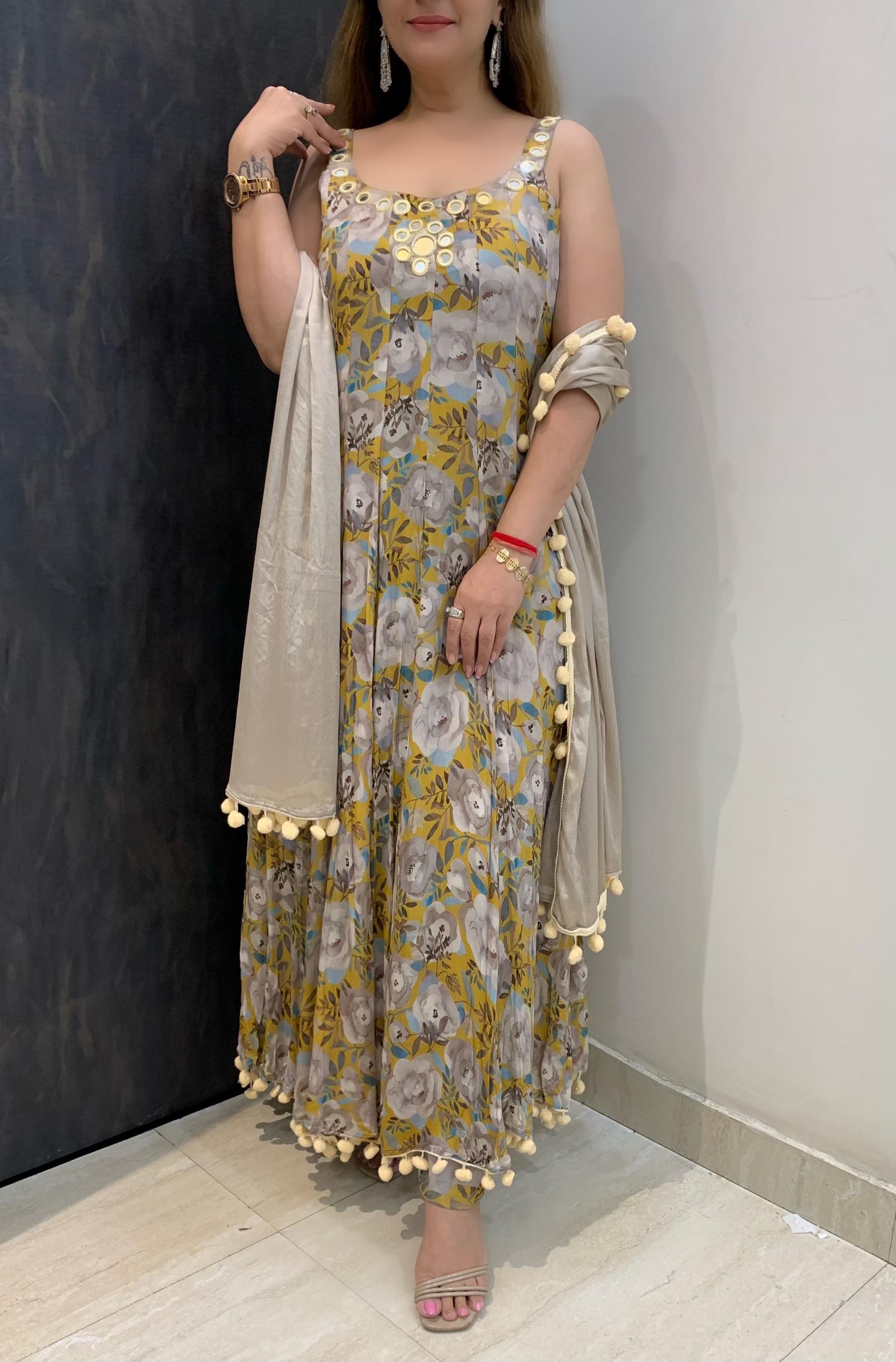Classy Floral Print Pure Chinnon Kalidaar kurti with Real Mirror and Pompom Lace Work along with Roman Silk Pant and Chinnon Dupatta