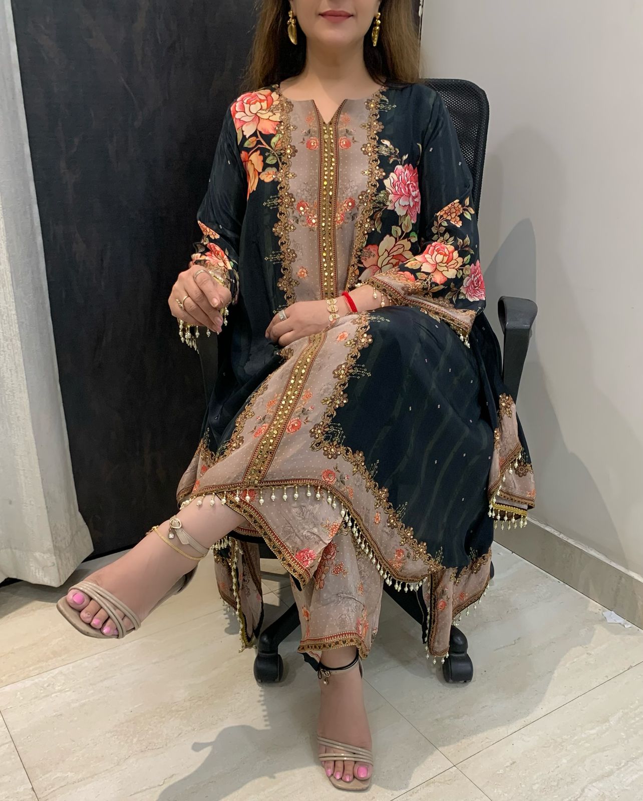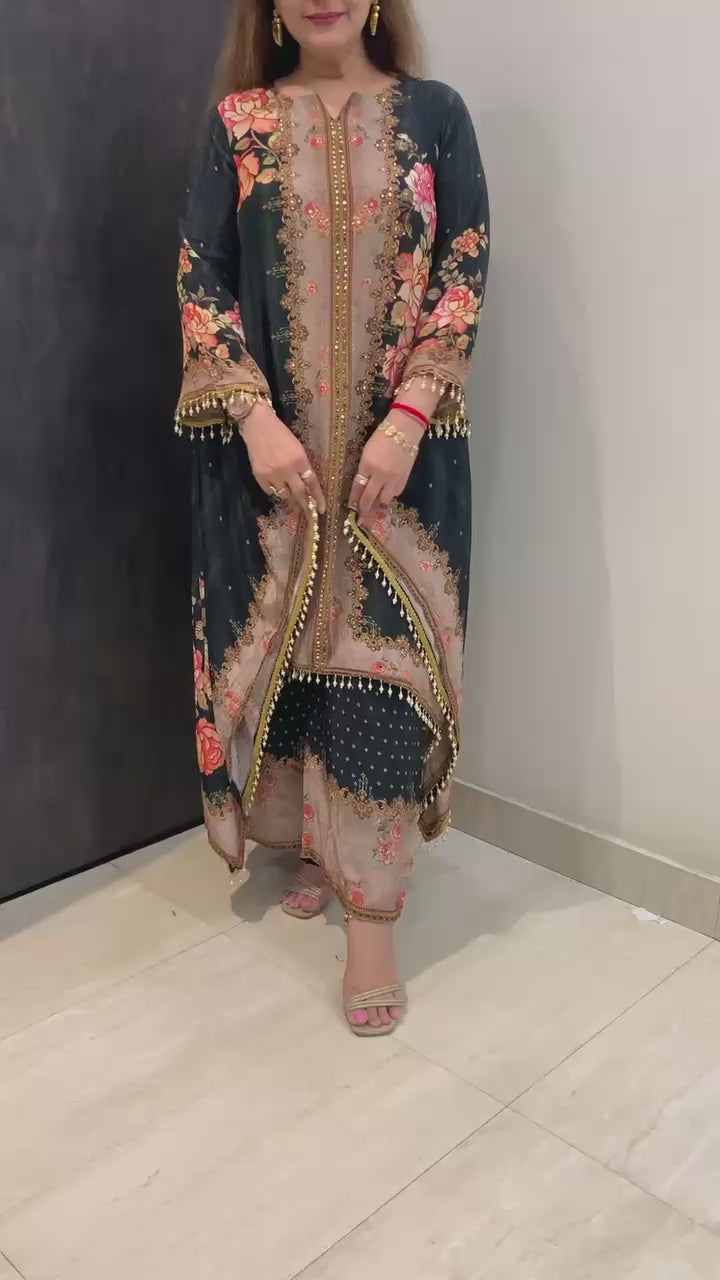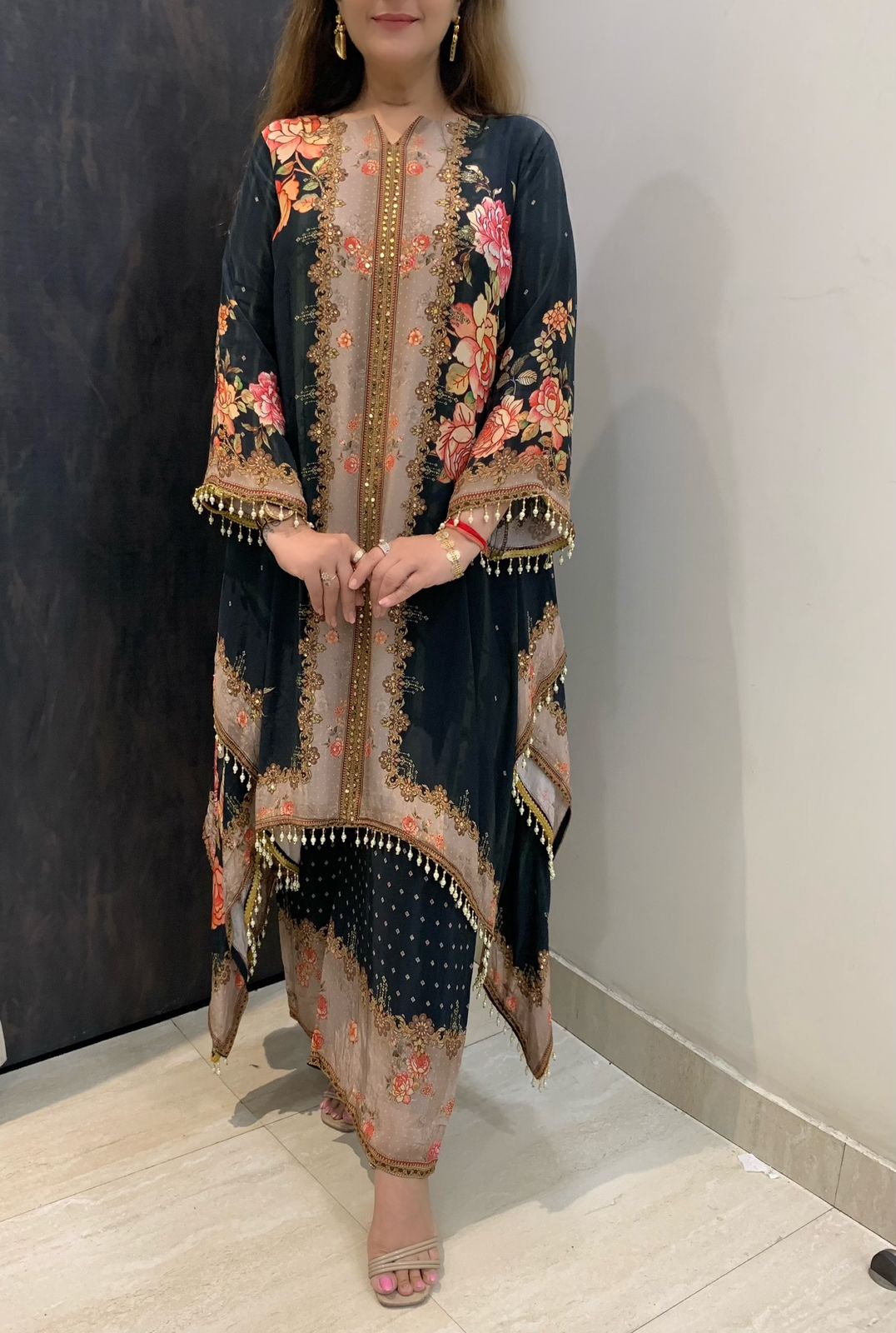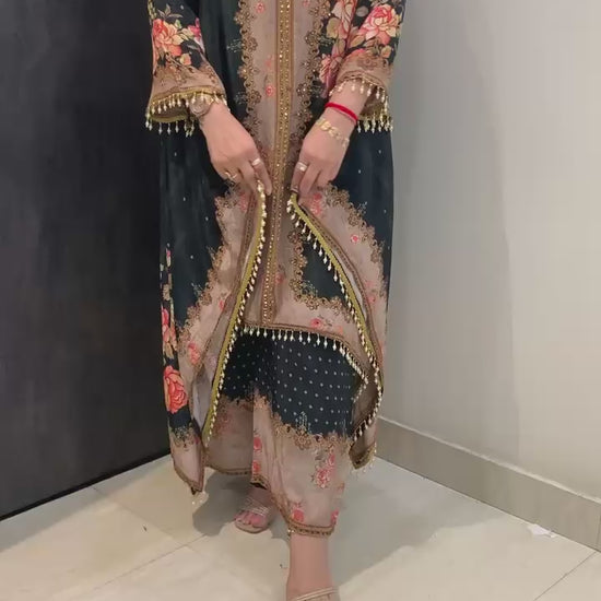 Fabulous Digital Print Pure Crepe 2 Piece Fancy Cut Kaftan Co-ord Set with Plazzo, Highlighted with Stones, Real Mirror and Bead Work