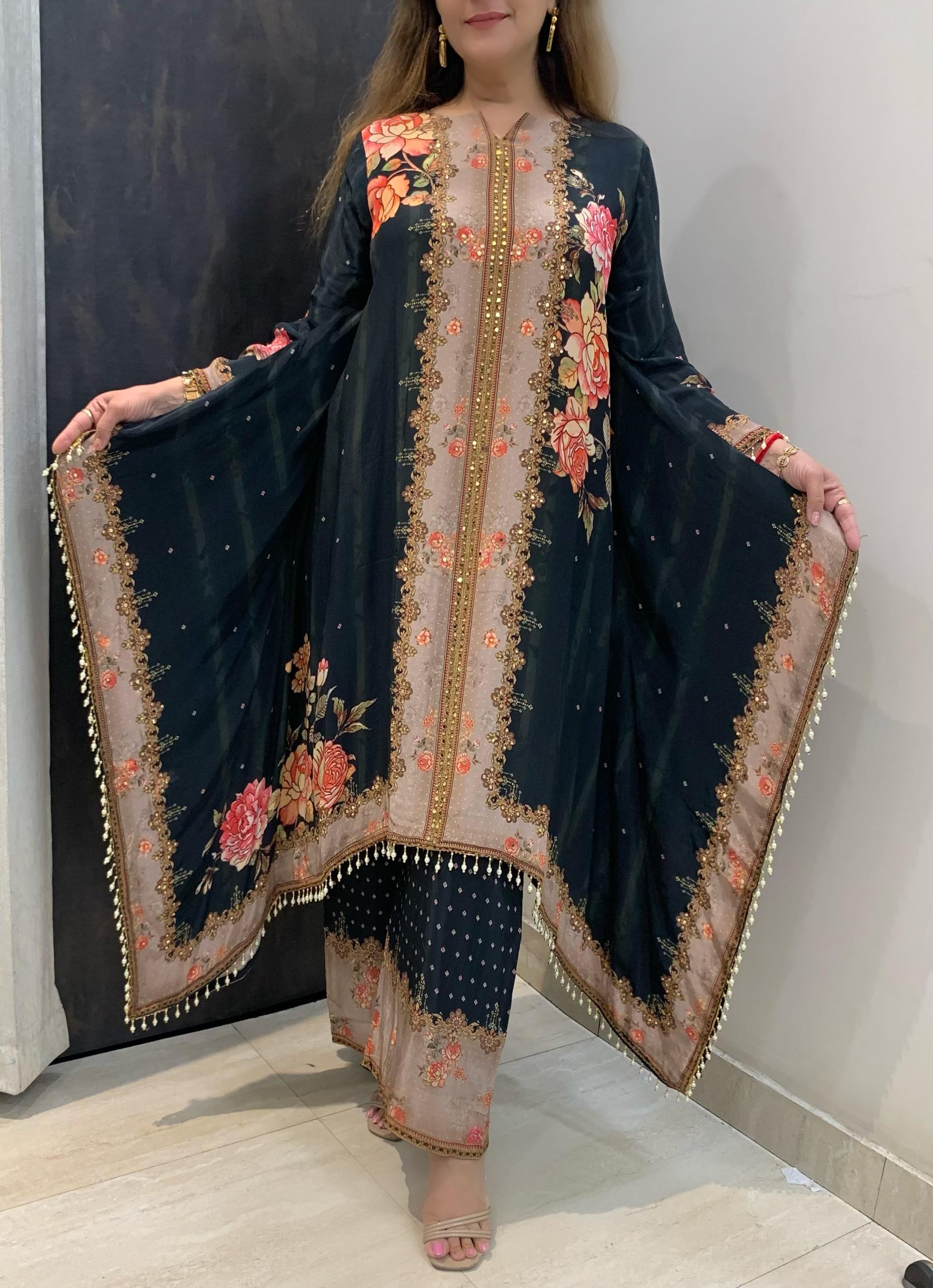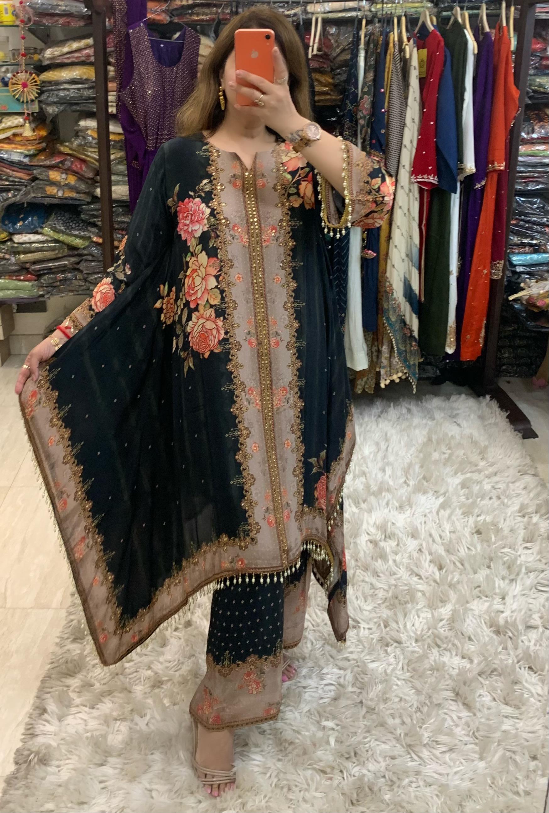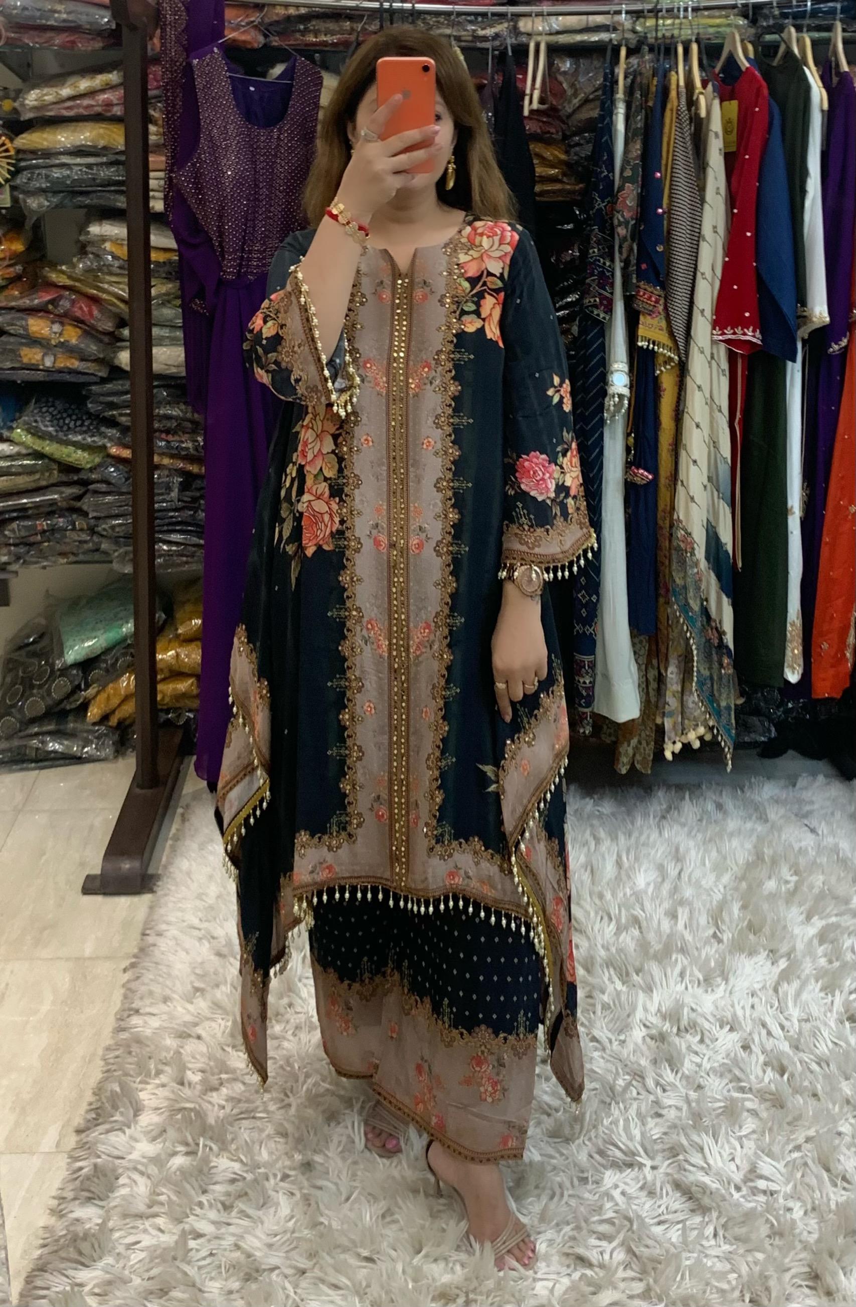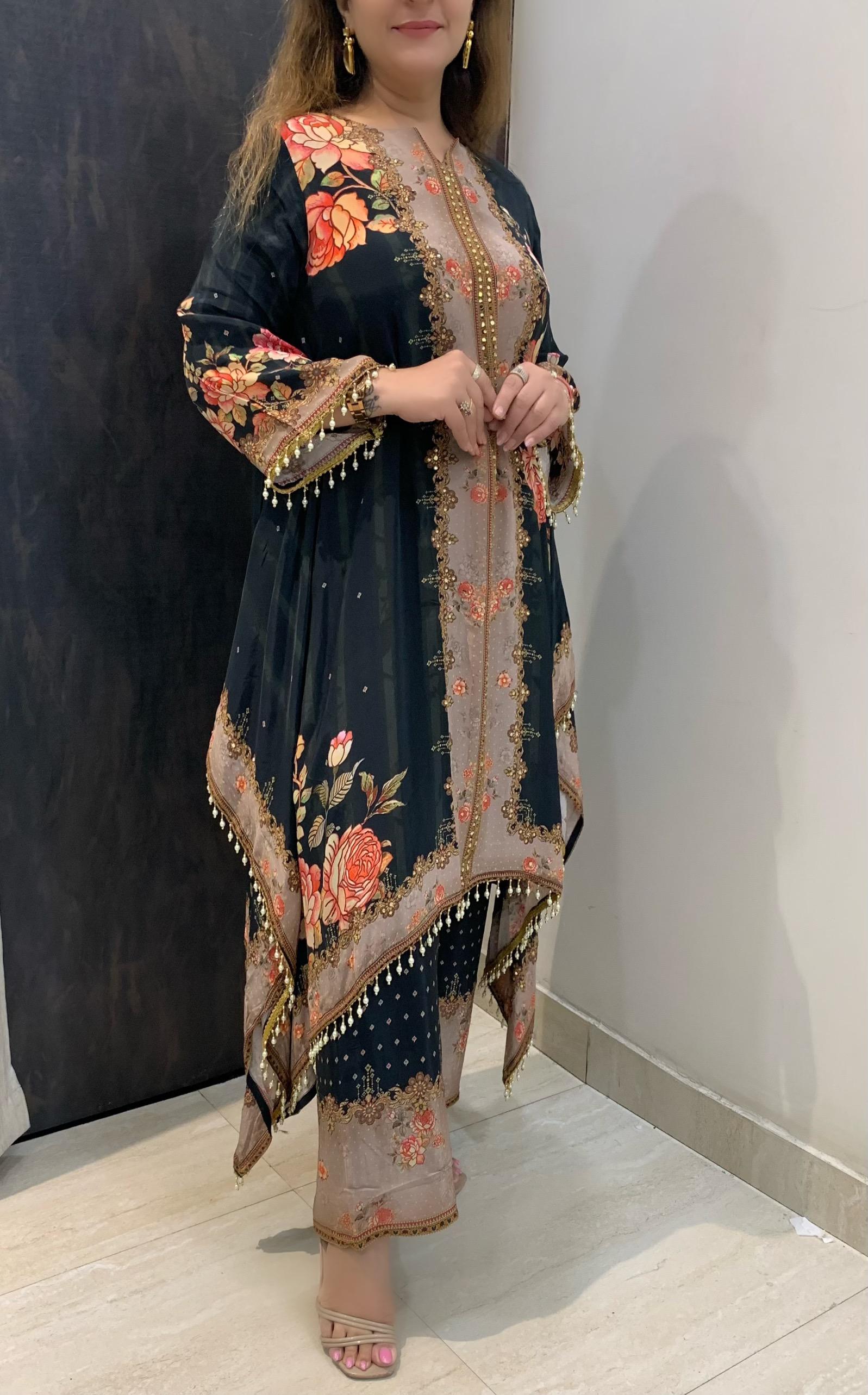 Fabulous Digital Print Pure Crepe 2 Piece Fancy Cut Kaftan Co-ord Set with Plazzo, Highlighted with Stones, Real Mirror and Bead Work