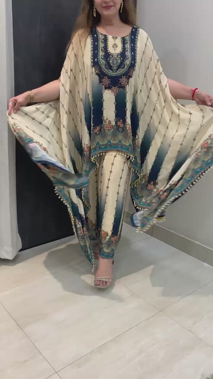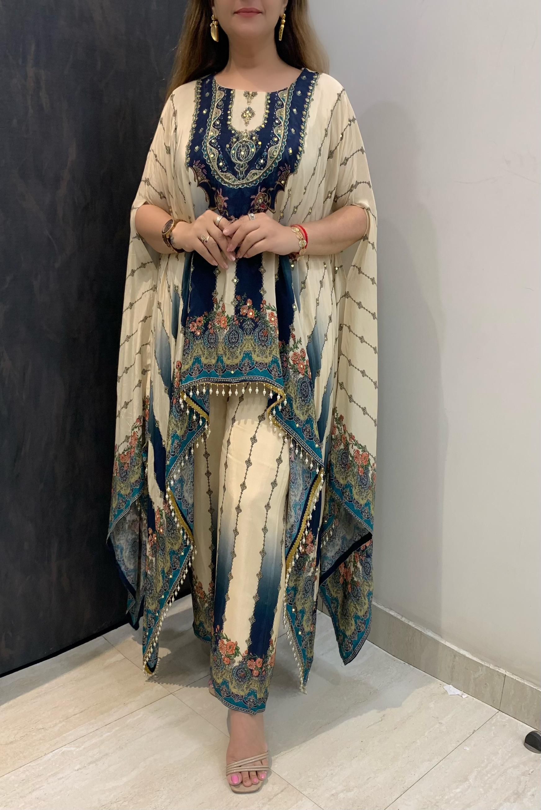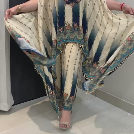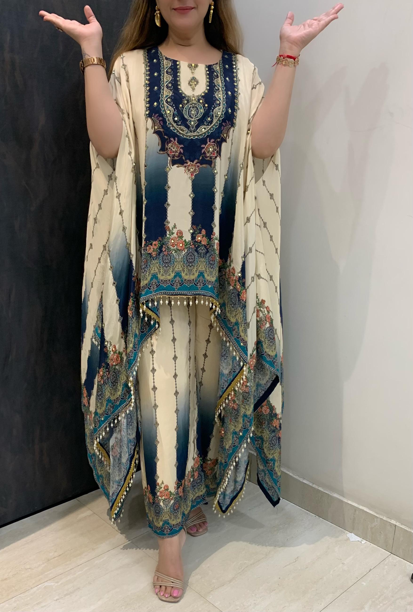 Elegant Pure Printed Crepe 2 Piece Full Lining Unique Cut Kaftan Co-ord Set Highlighted with Aari, Bead & Real Mirror Work, paired with Plazzo Pant