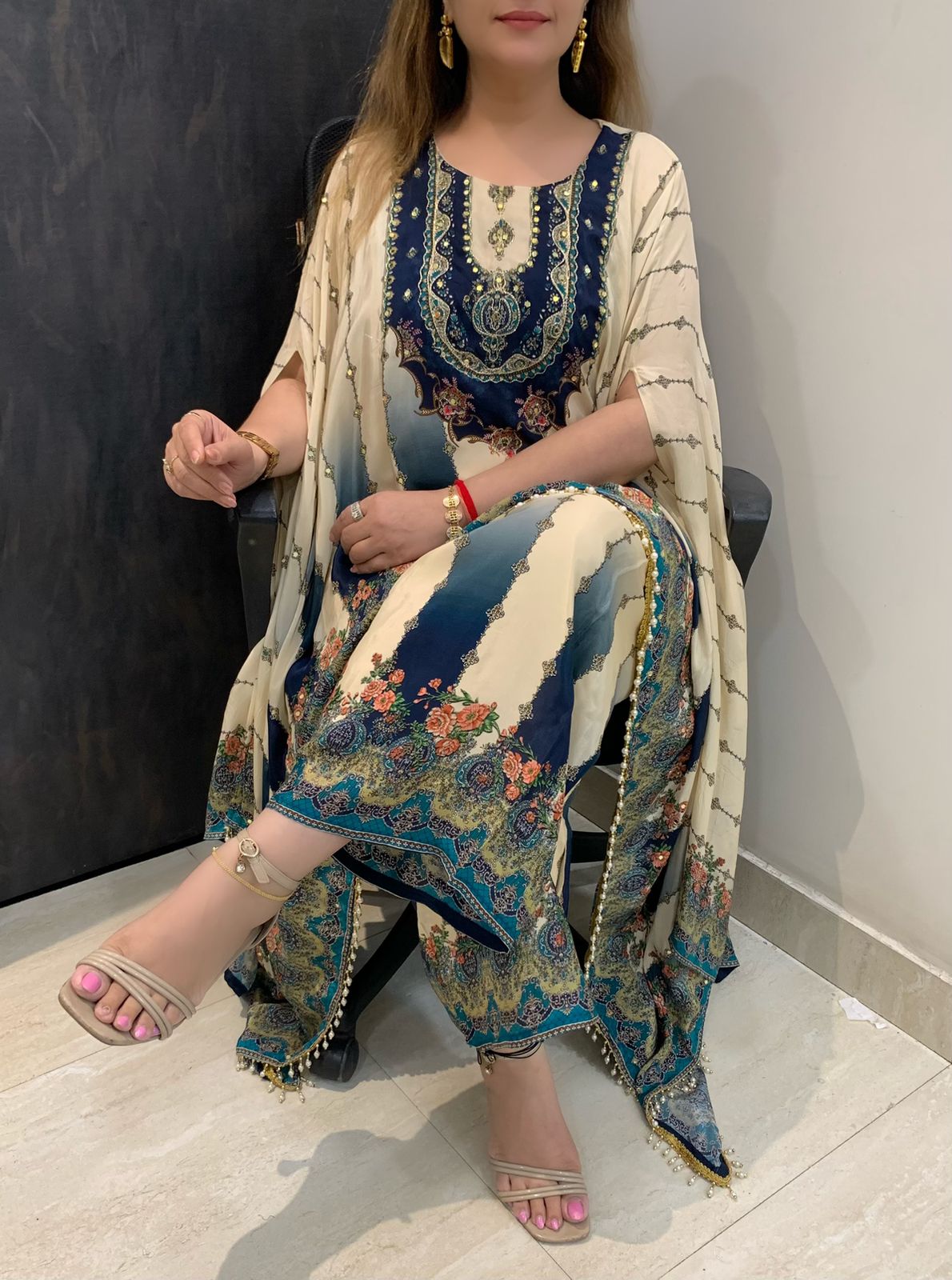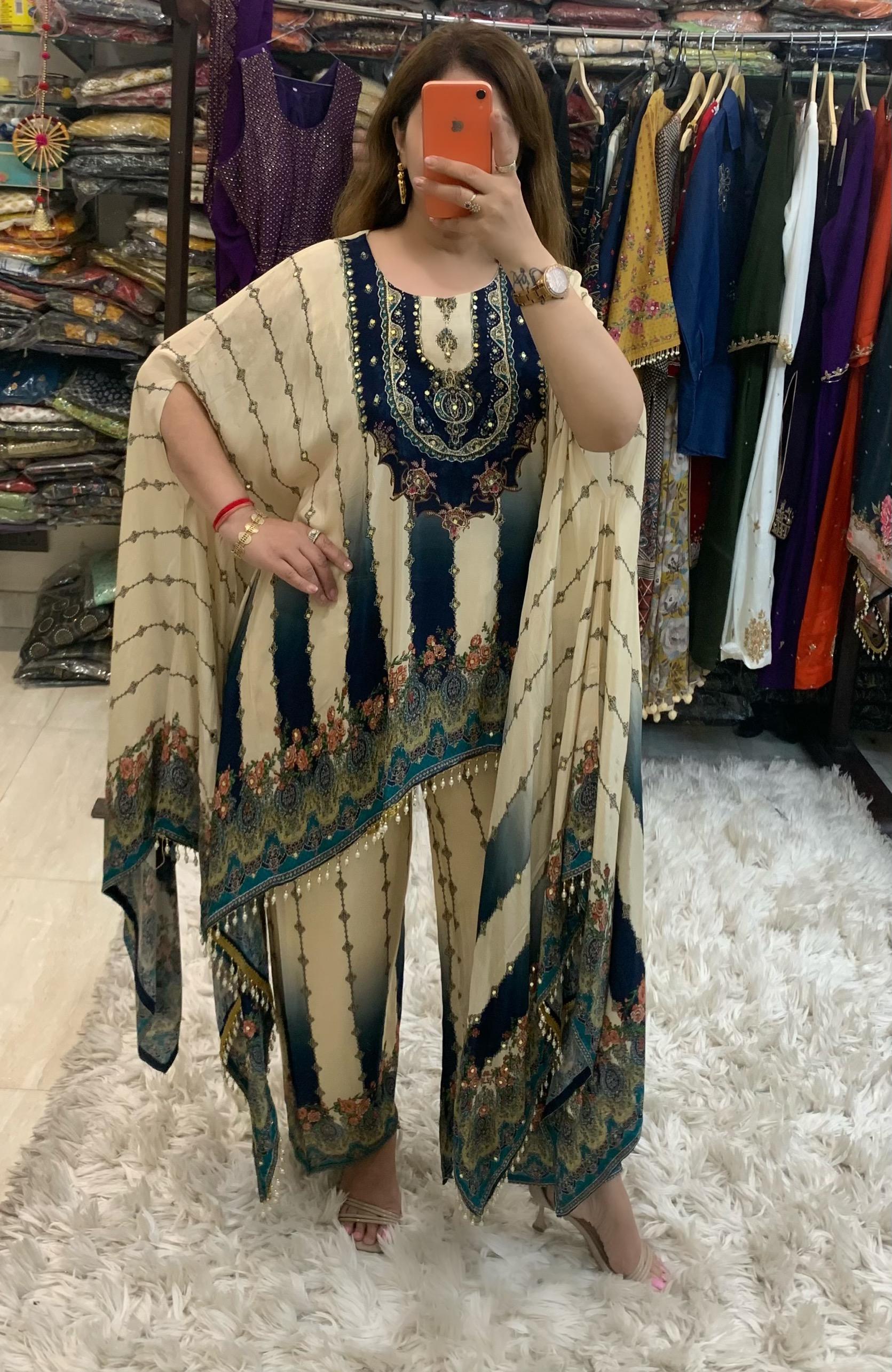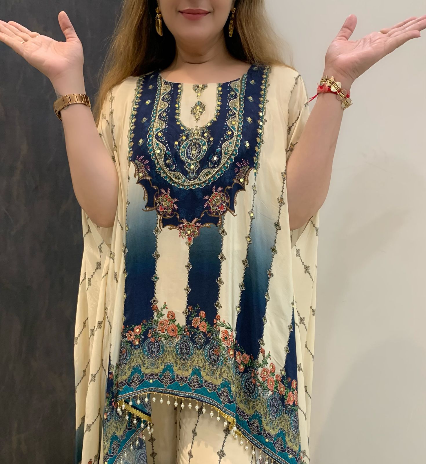 Elegant Pure Printed Crepe 2 Piece Full Lining Unique Cut Kaftan Co-ord Set Highlighted with Aari, Bead & Real Mirror Work, paired with Plazzo Pant
