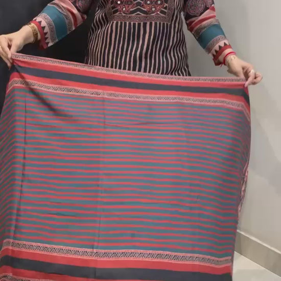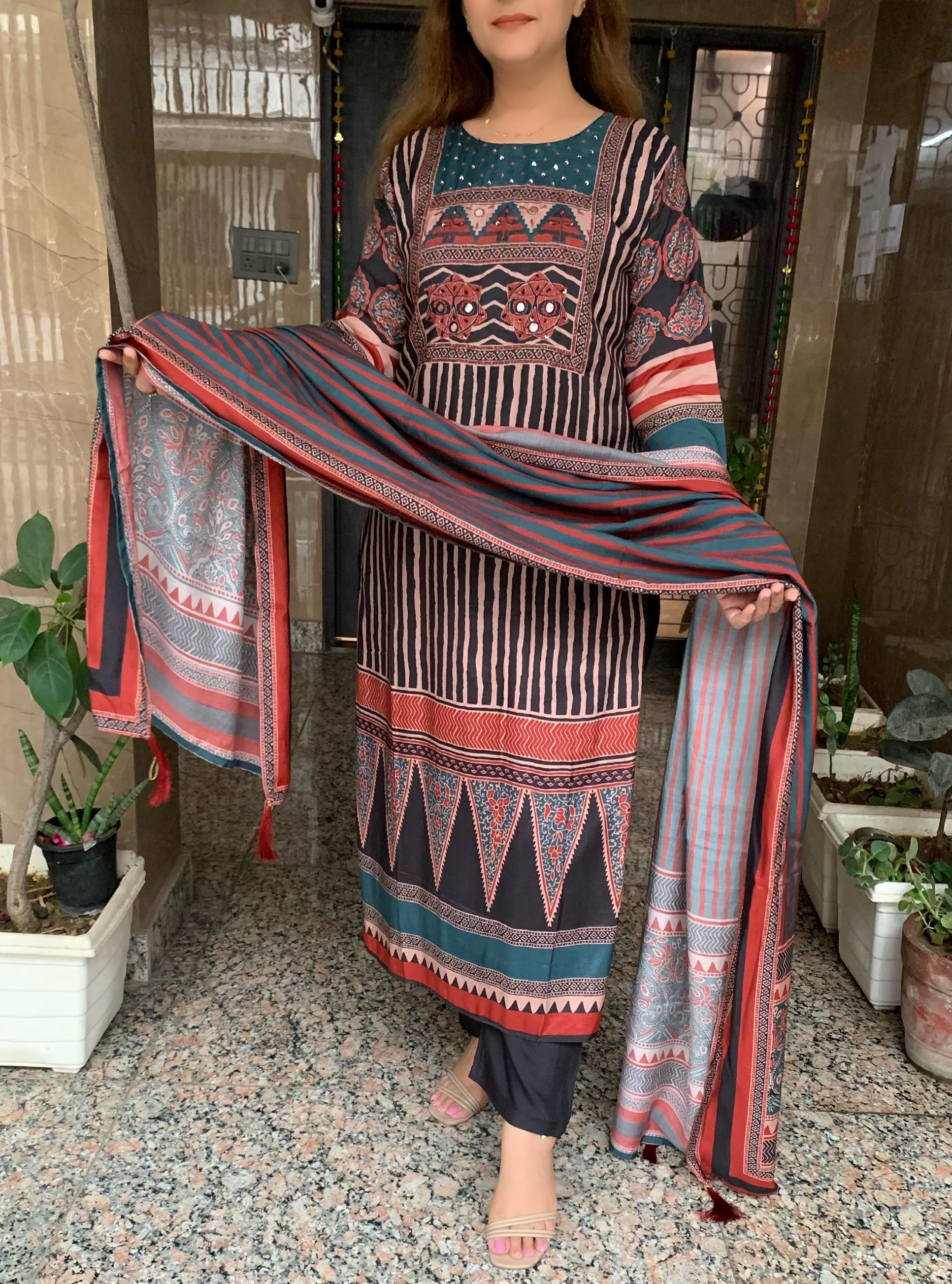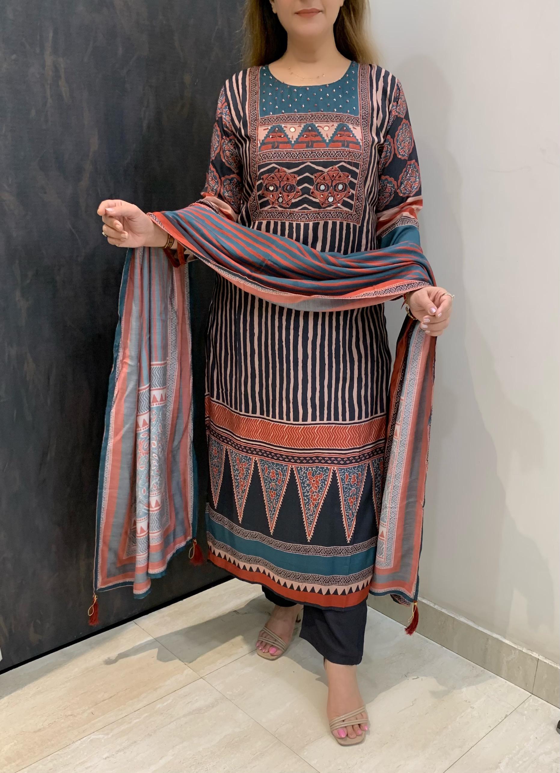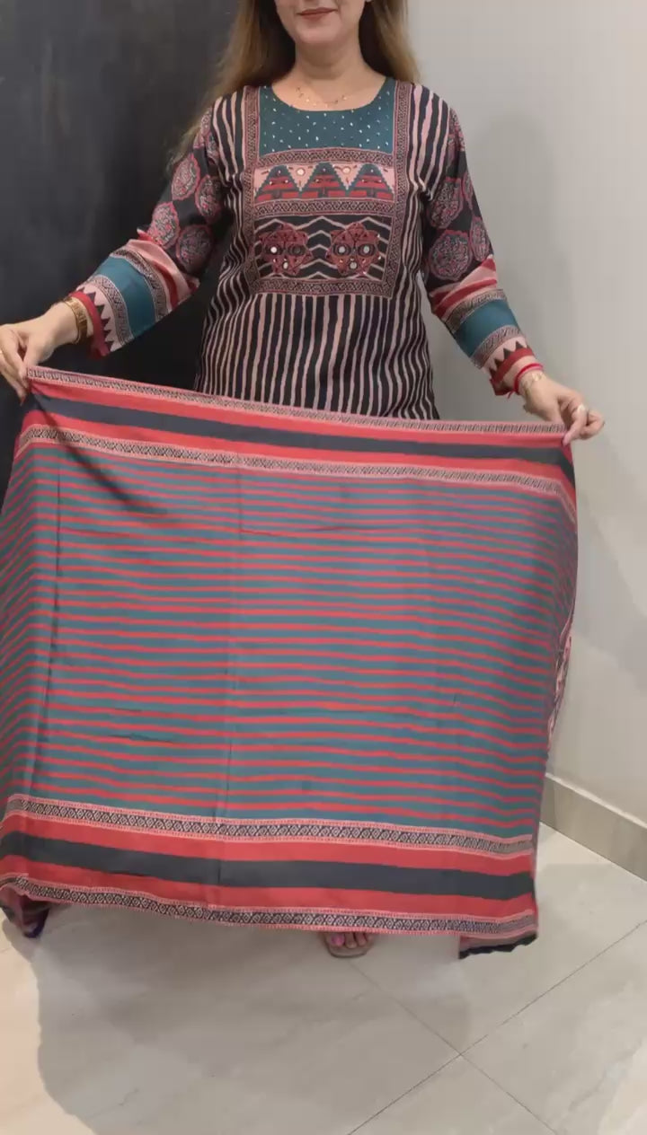 Classy Pure Soft Muslin Silk 3 piece Digital Print Lining Kurti with Fine Mirror, Thread and Sequin work along with Shantoon Pant and Pure Dupatta