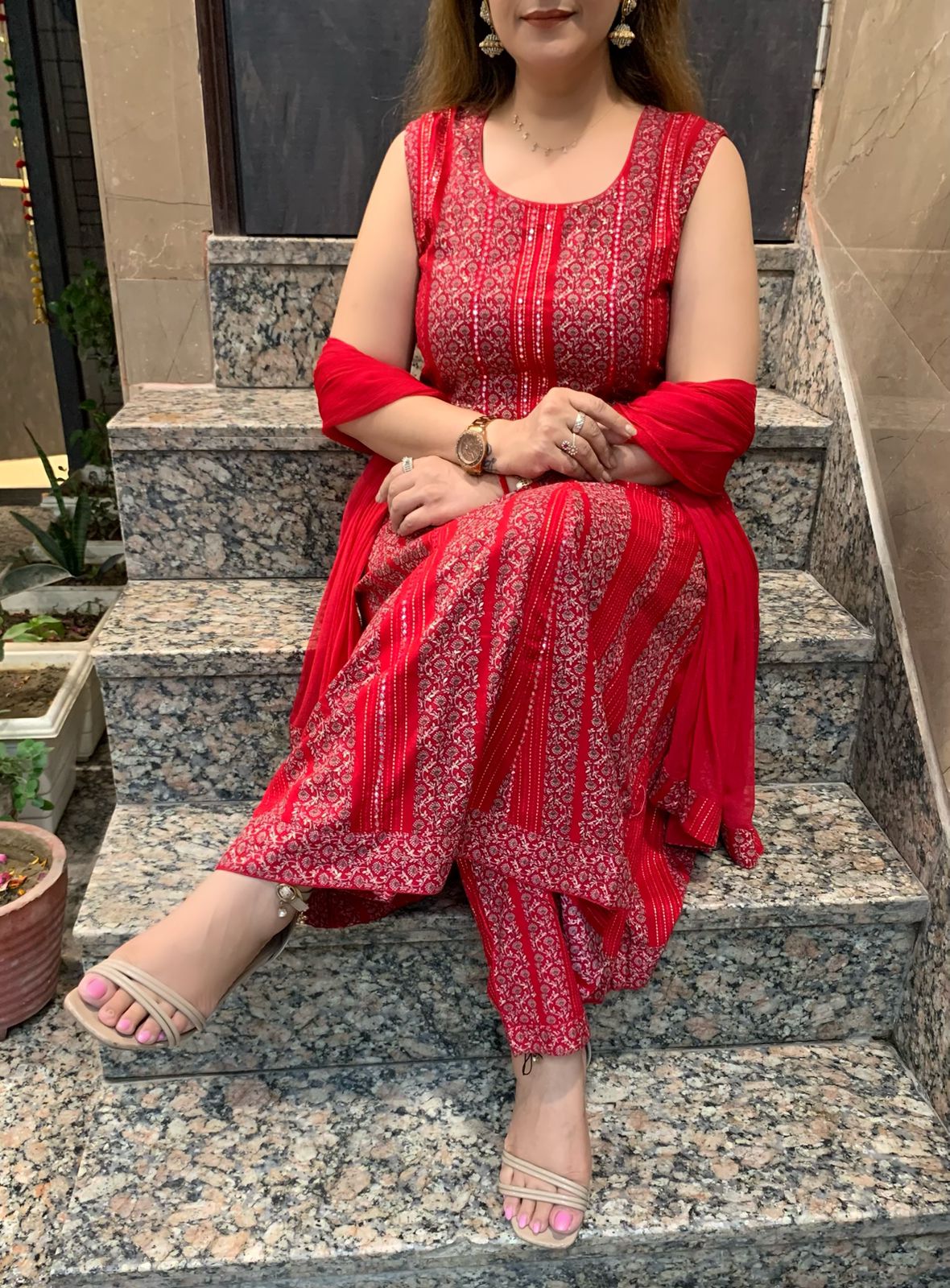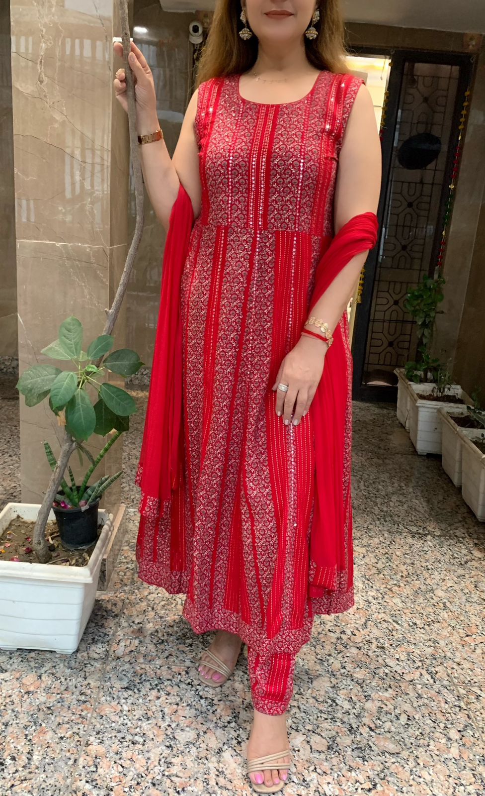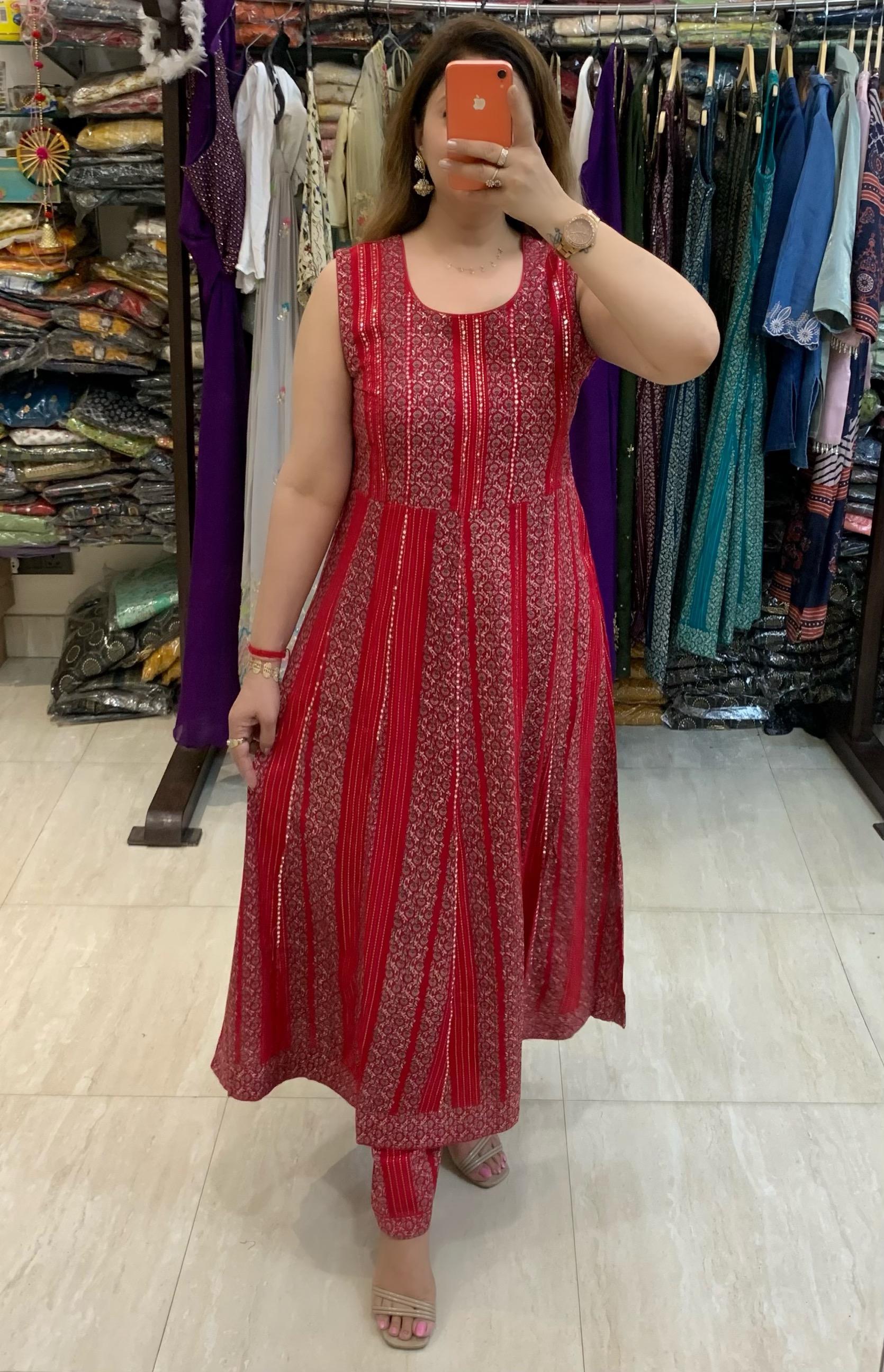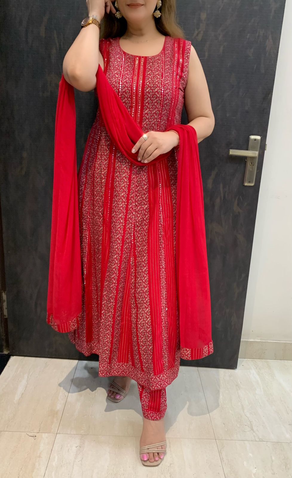 Classy Printed Rayon 3 Piece Flare Anarkali Dress with Schiffli work along with Pant and Chiffon Dupatta