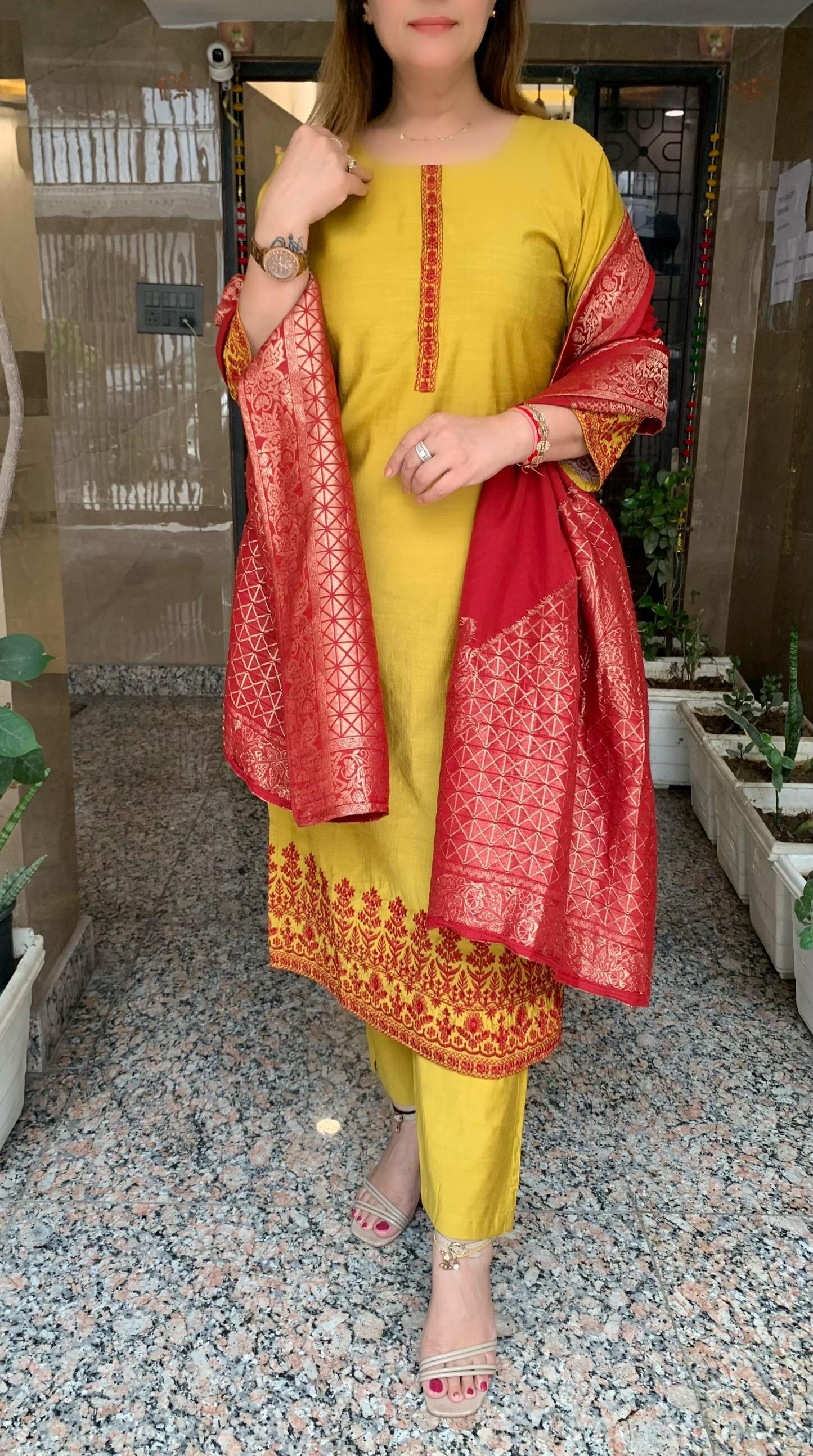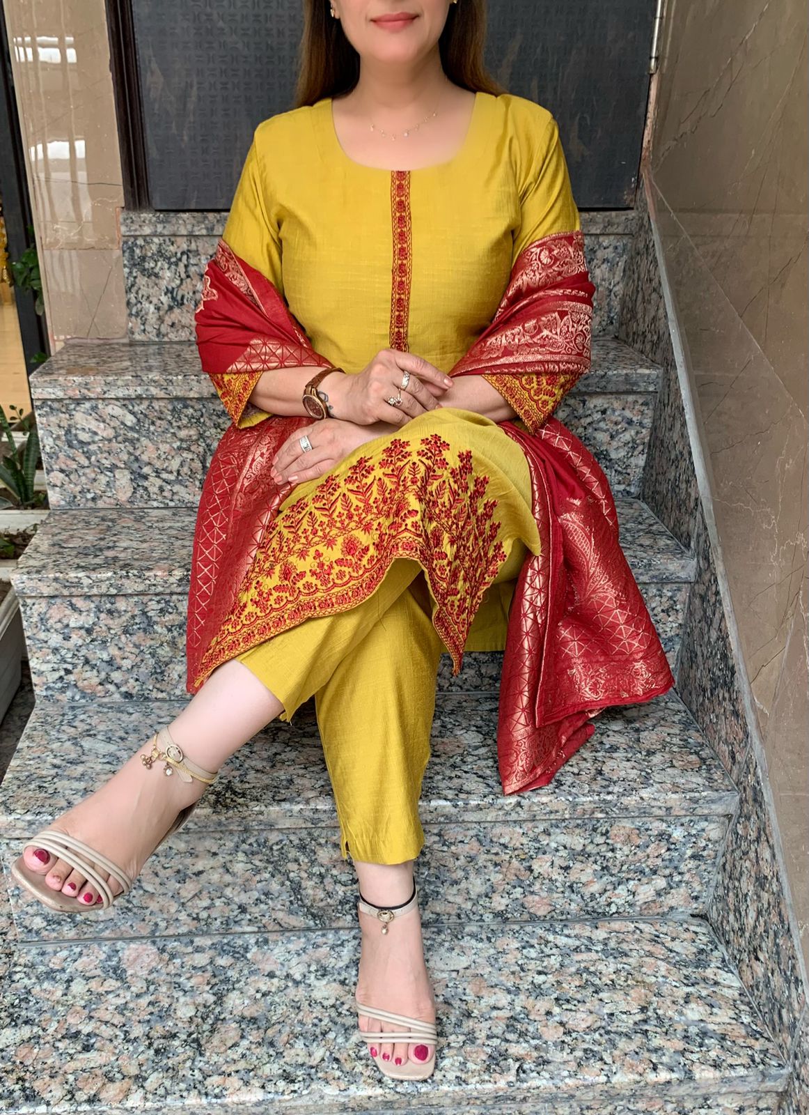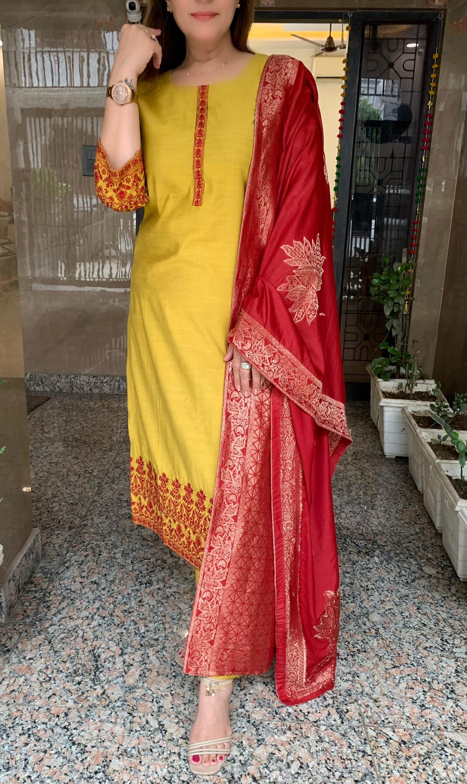 Classy 3 Piece Slub Cotton Silk Kurti Set with Fine Embroidery along with Banarsi Silk Zari Dupatta and Pant