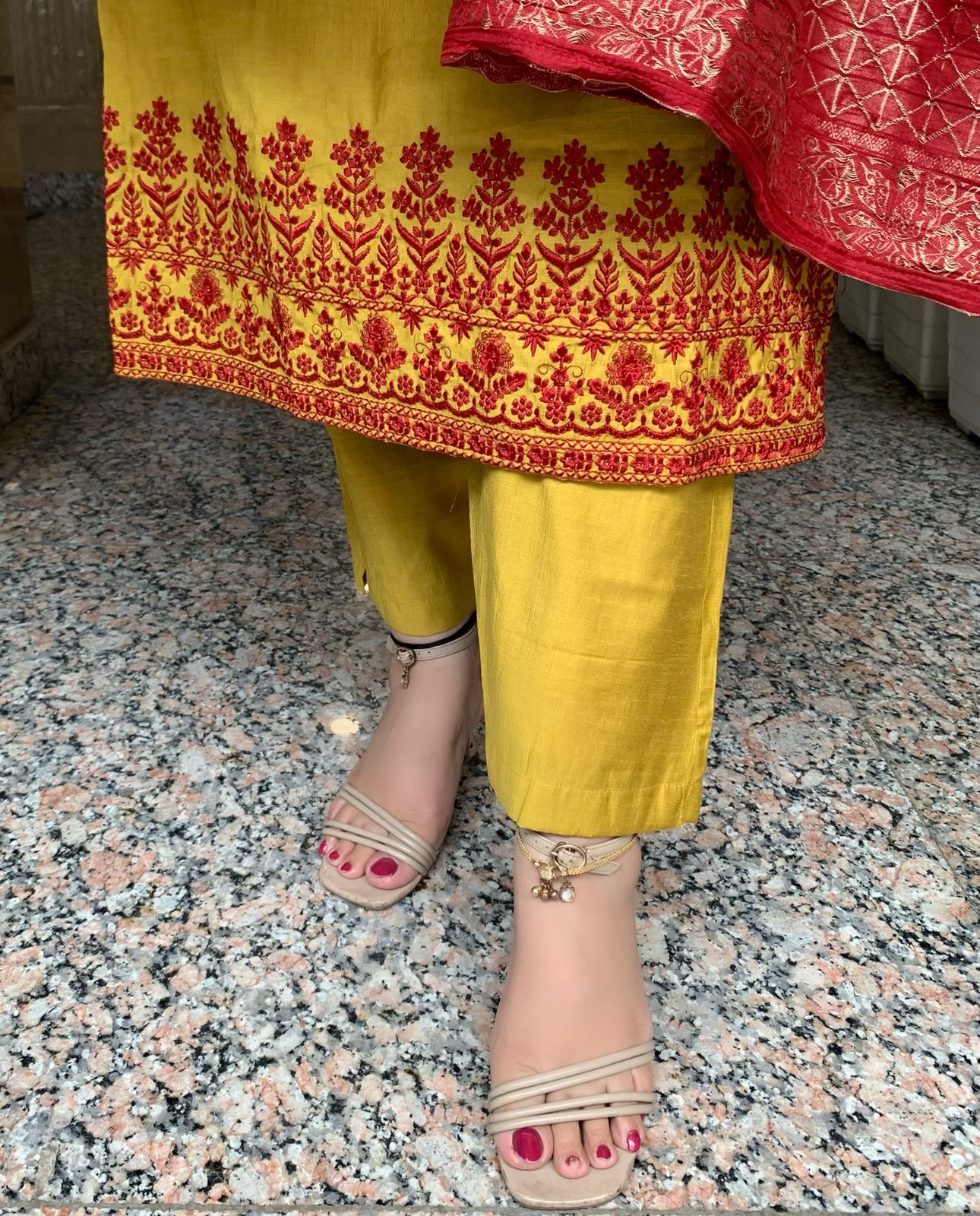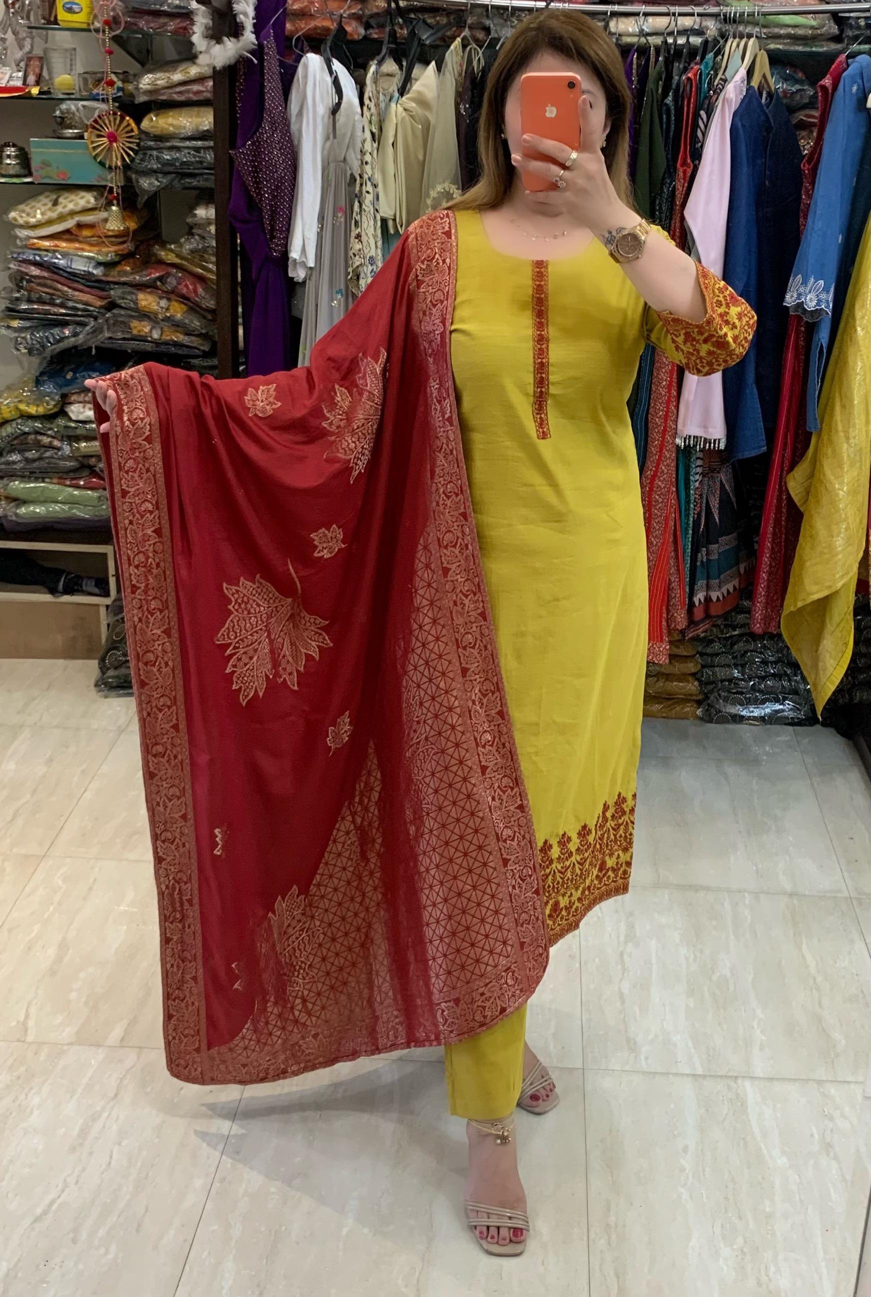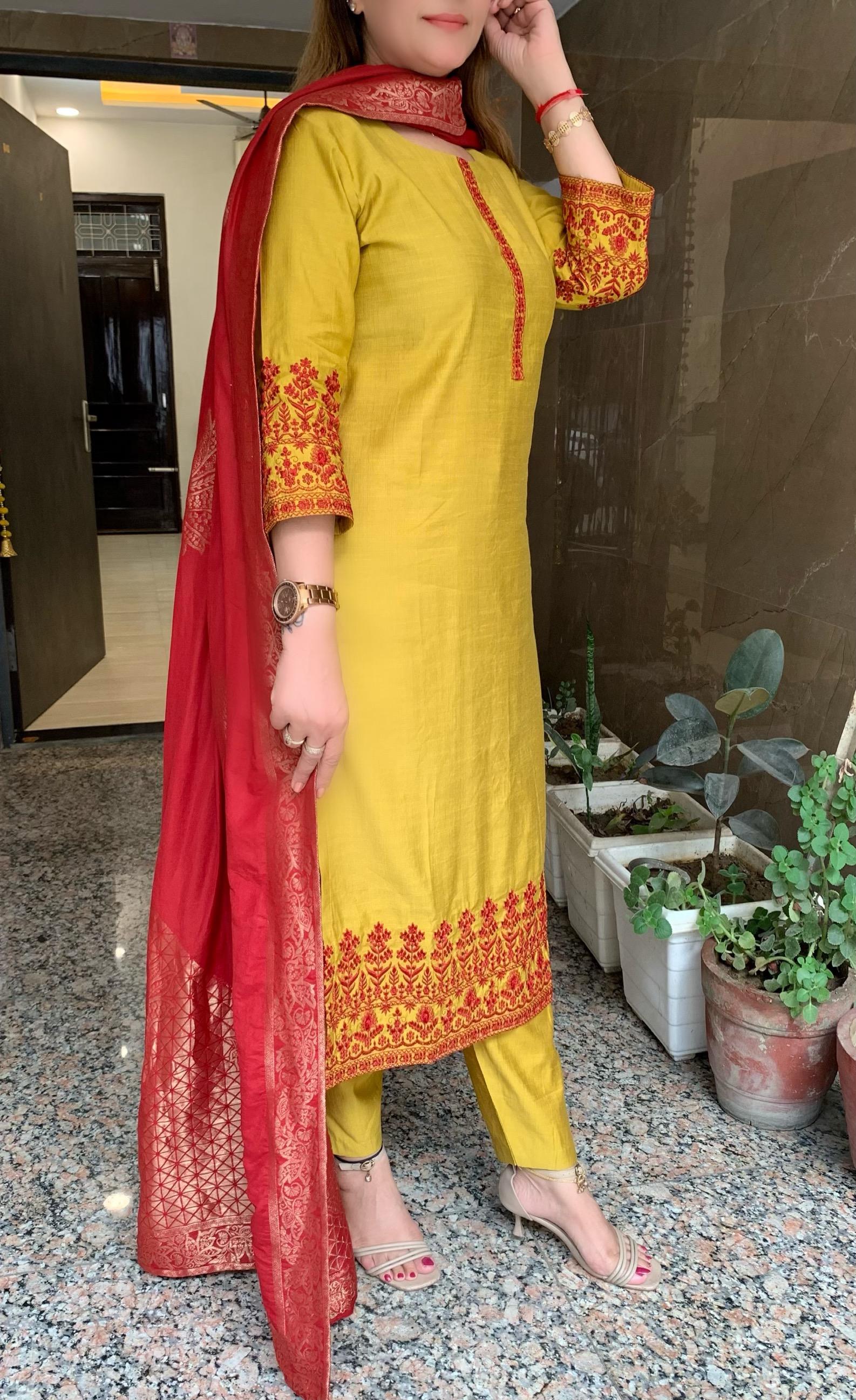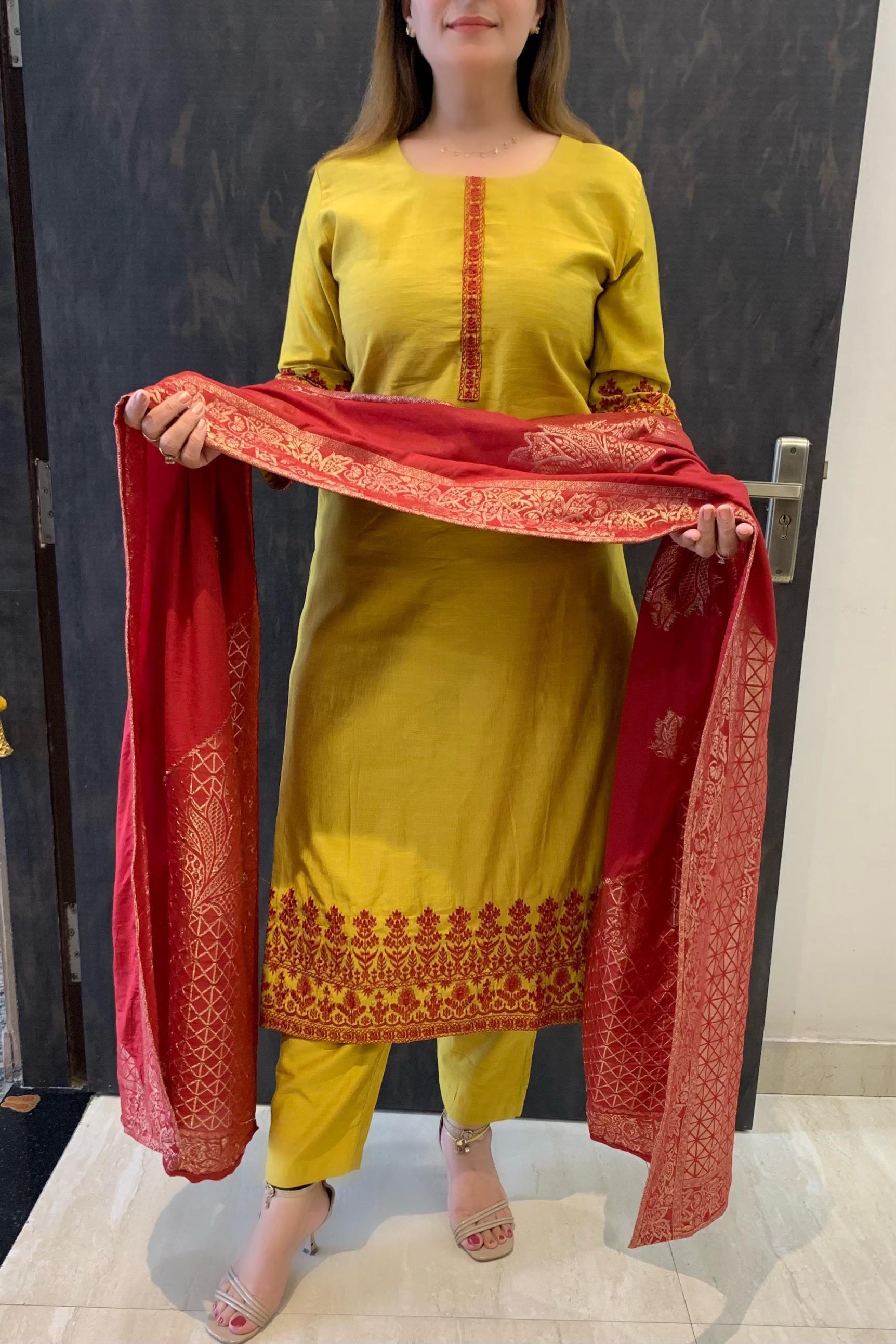 Classy 3 Piece Slub Cotton Silk Kurti Set with Fine Embroidery along with Banarsi Silk Zari Dupatta and Pant