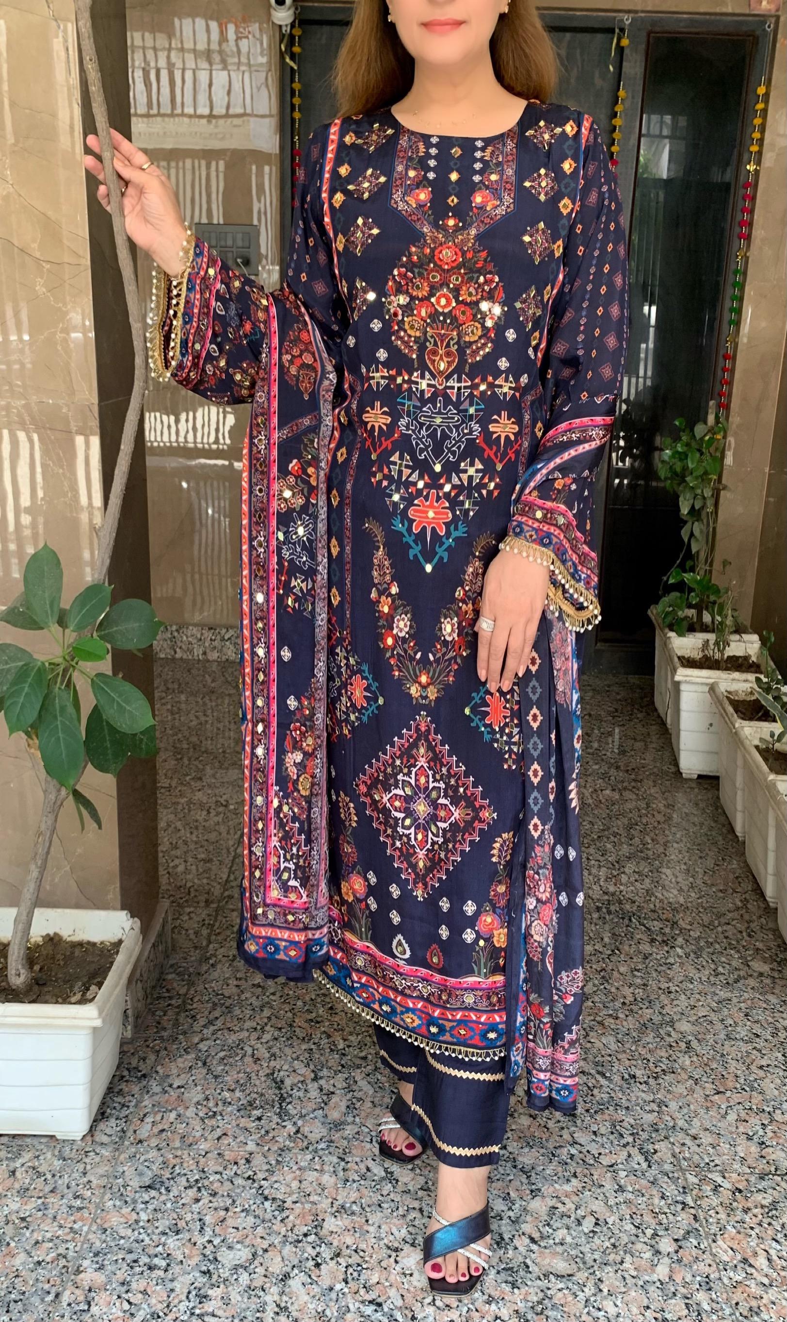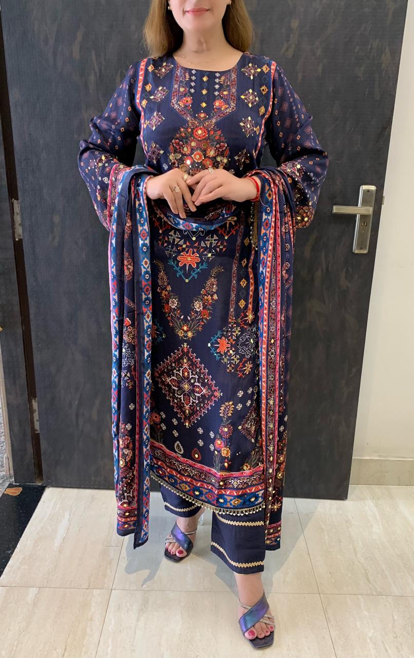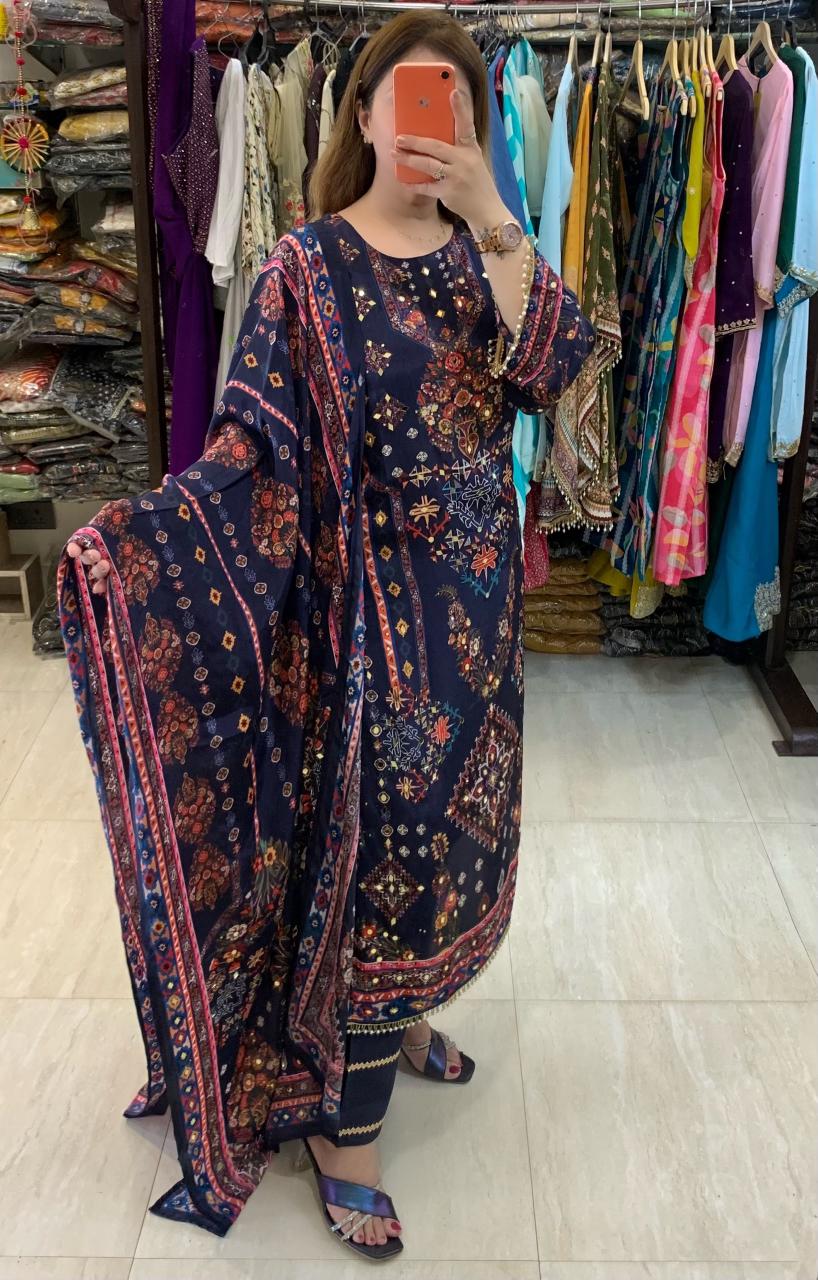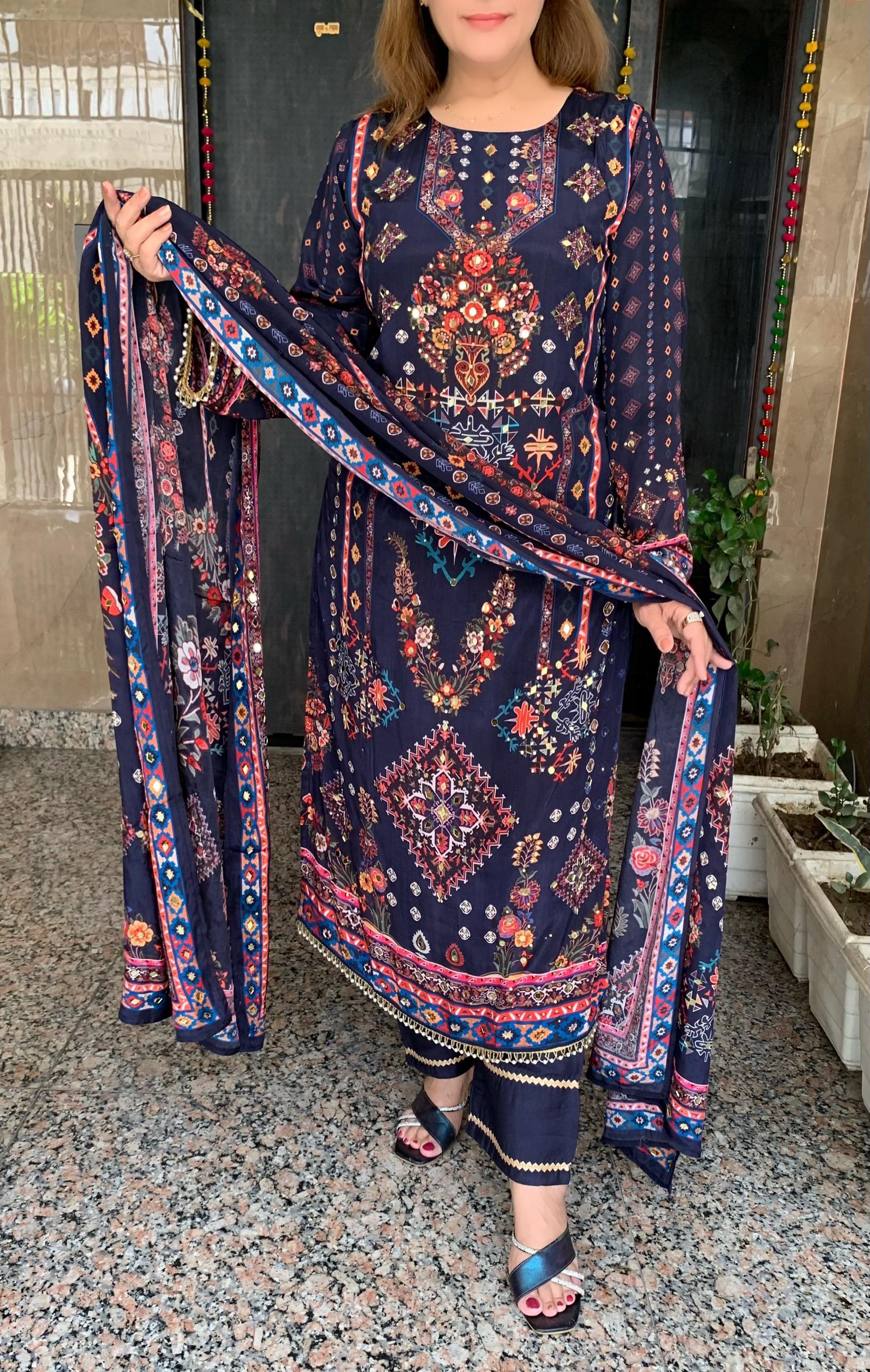 Elegant Digital Print Pure Crepe 3 piece Lining Kurti Set with Real Mirror, Stone, Pearl, Lace Work along with Cotton Corduroy Pant and Dupatta