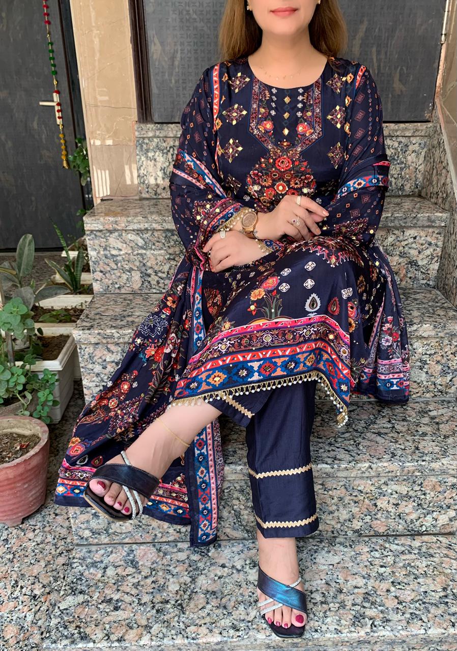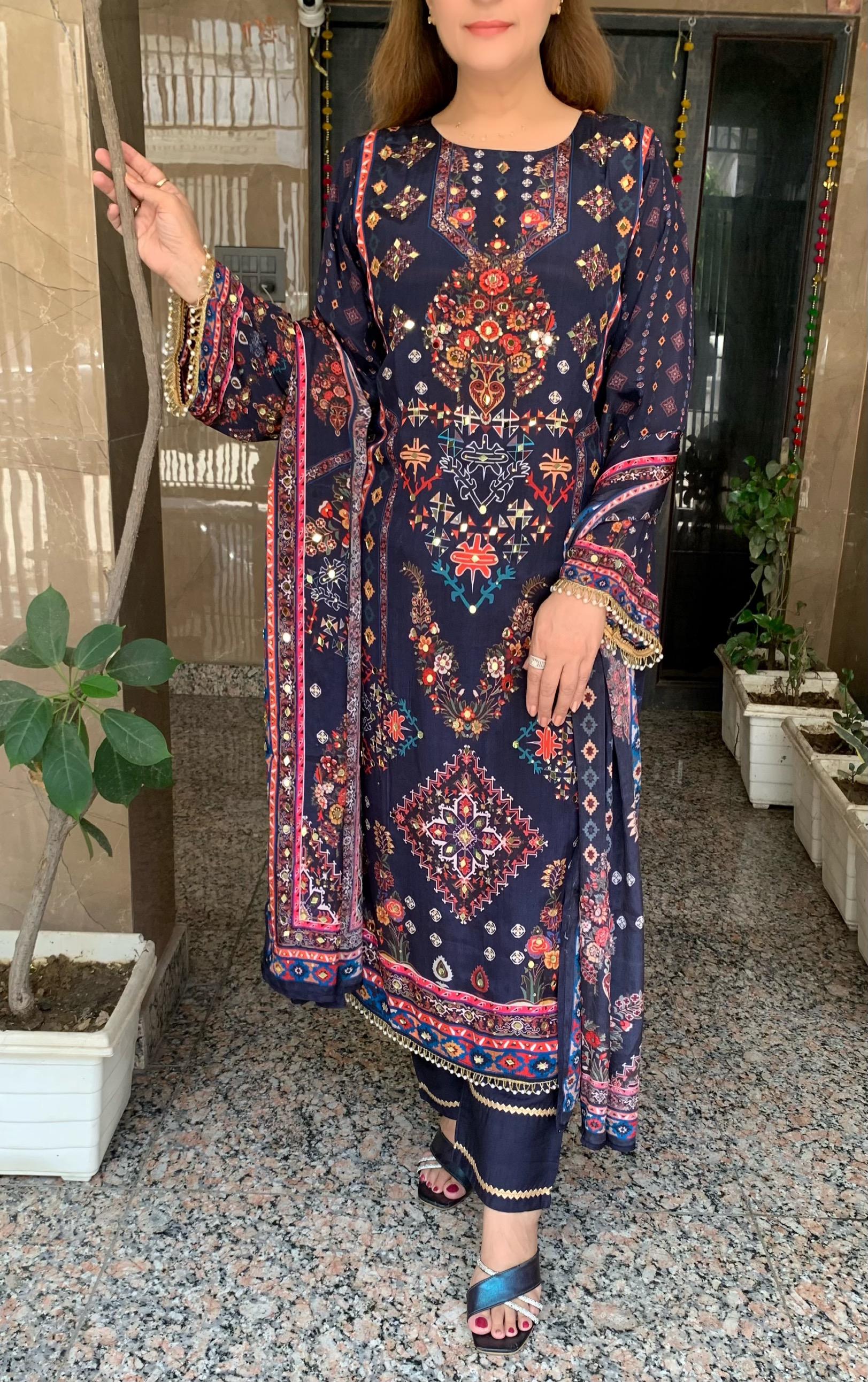 Elegant Digital Print Pure Crepe 3 piece Lining Kurti Set with Real Mirror, Stone & Pearl, Lace Work along with Cotton Corduroy Pant and Dupatta