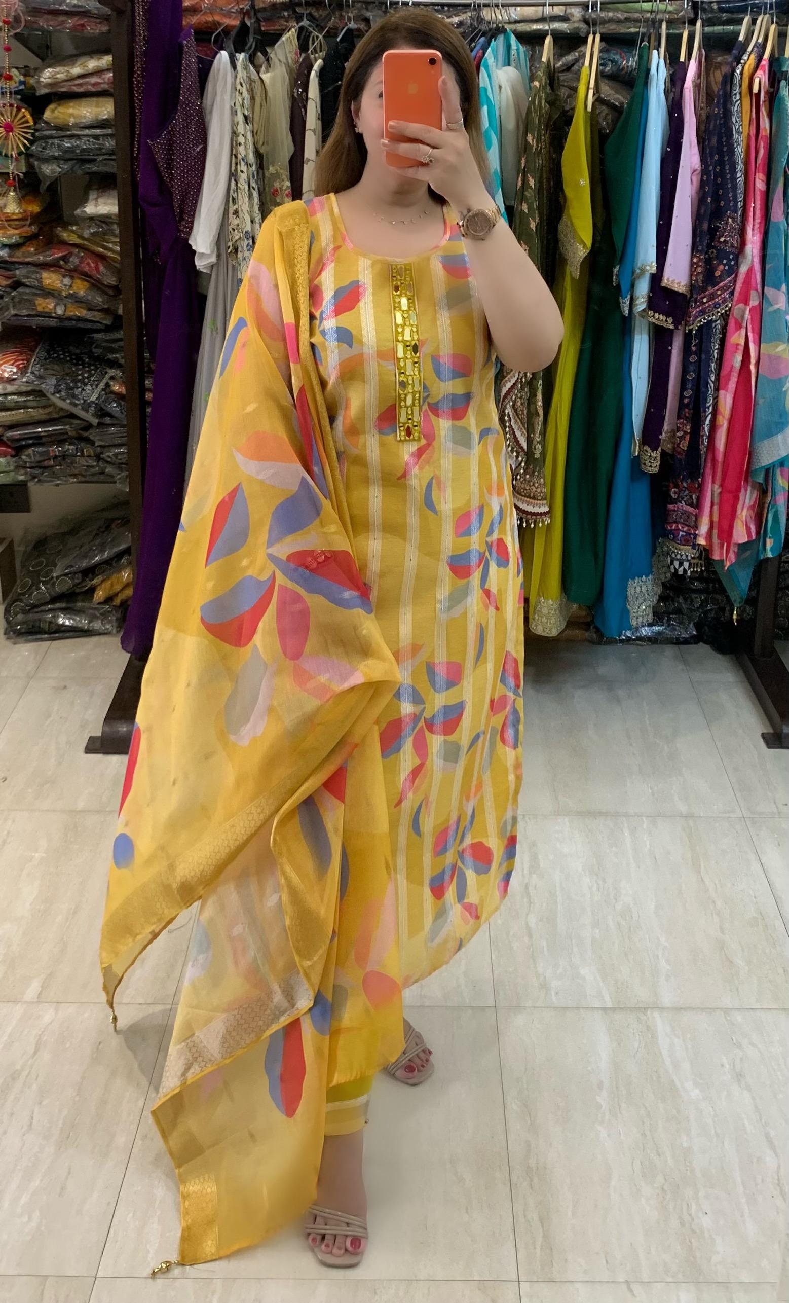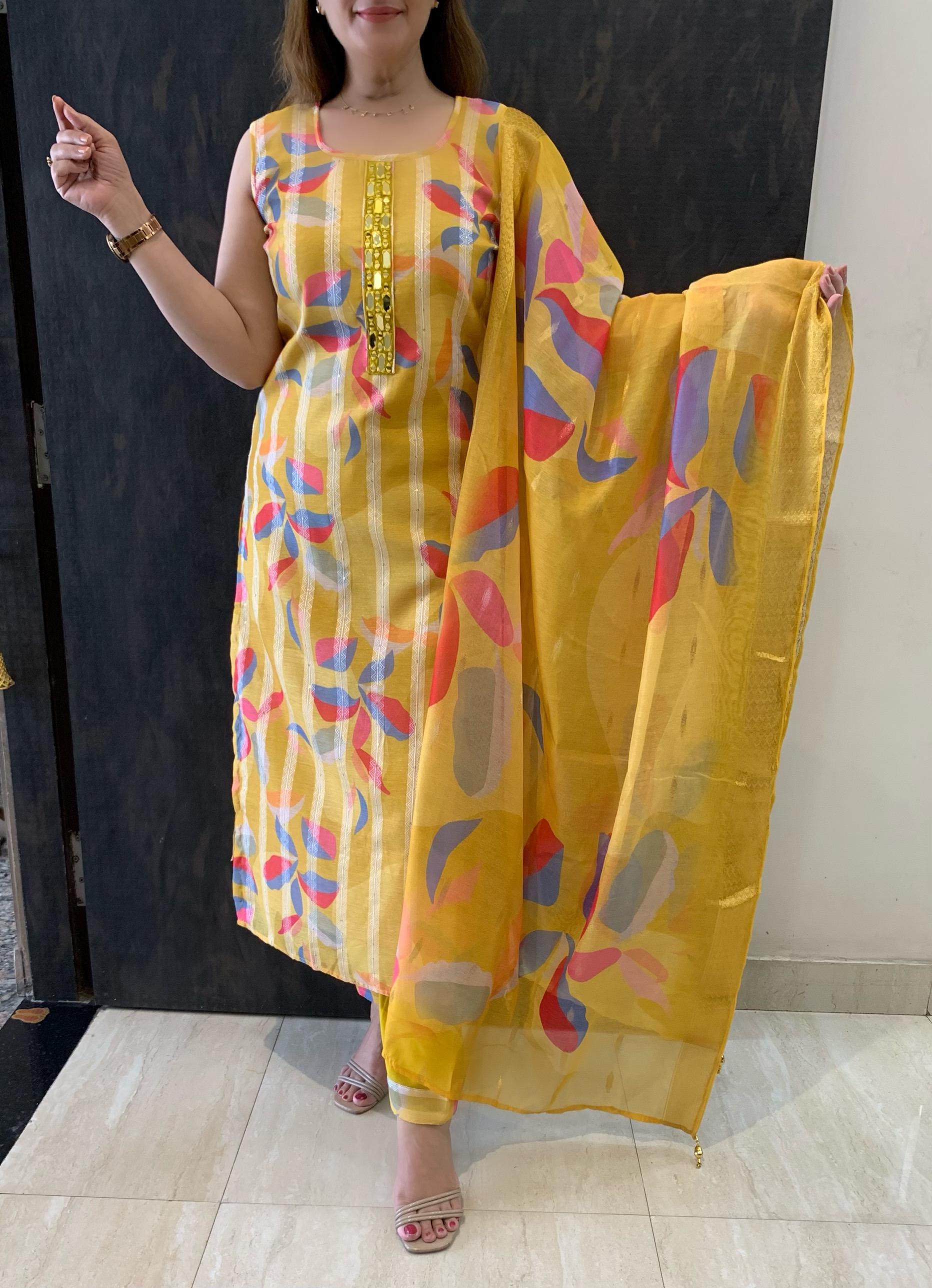 Beautiful Printed Cotton Chanderi 3 piece Self Weaving & Lining Kurta with Real Mirror Hand Work along with Cotton Silk Pant and Dupatta