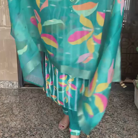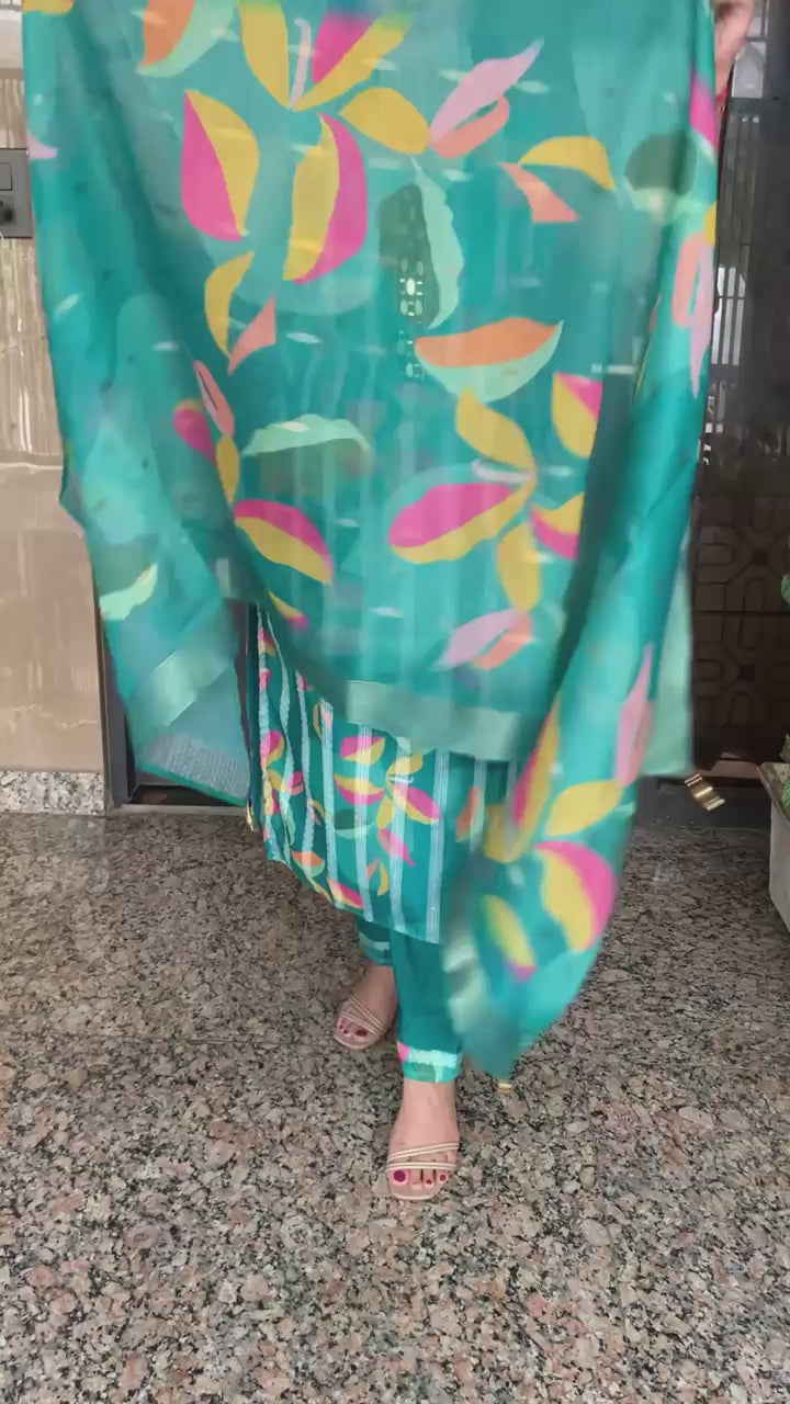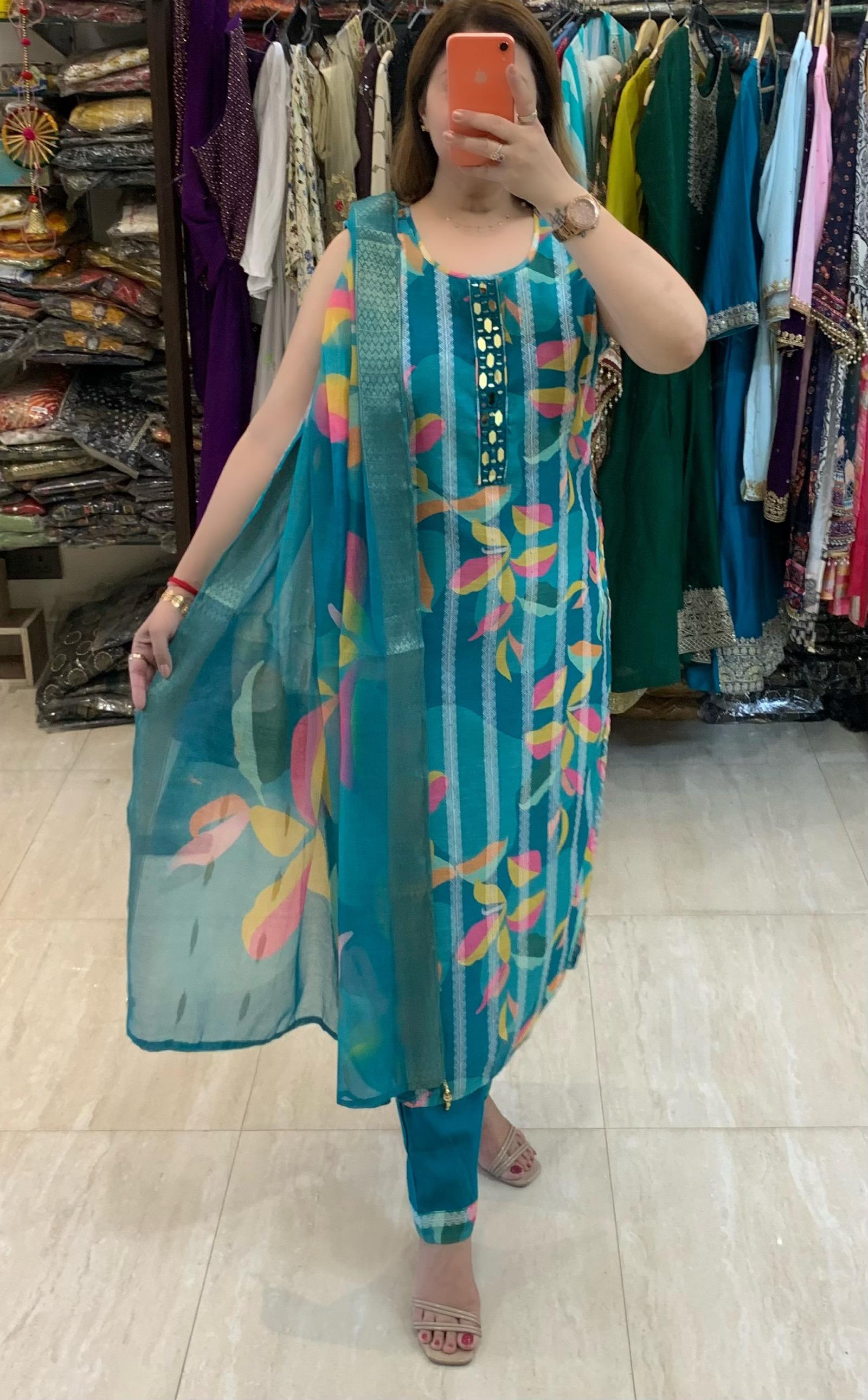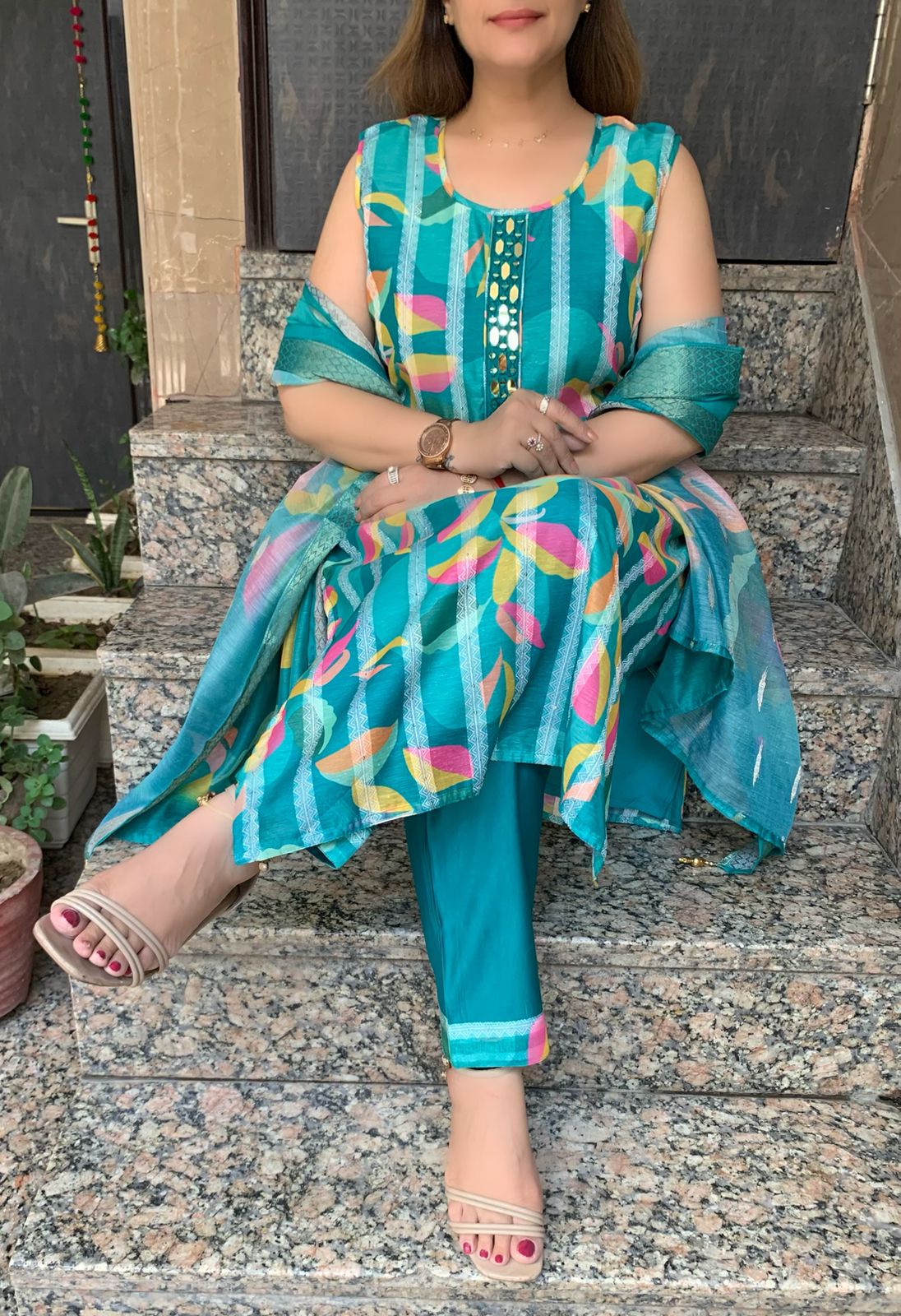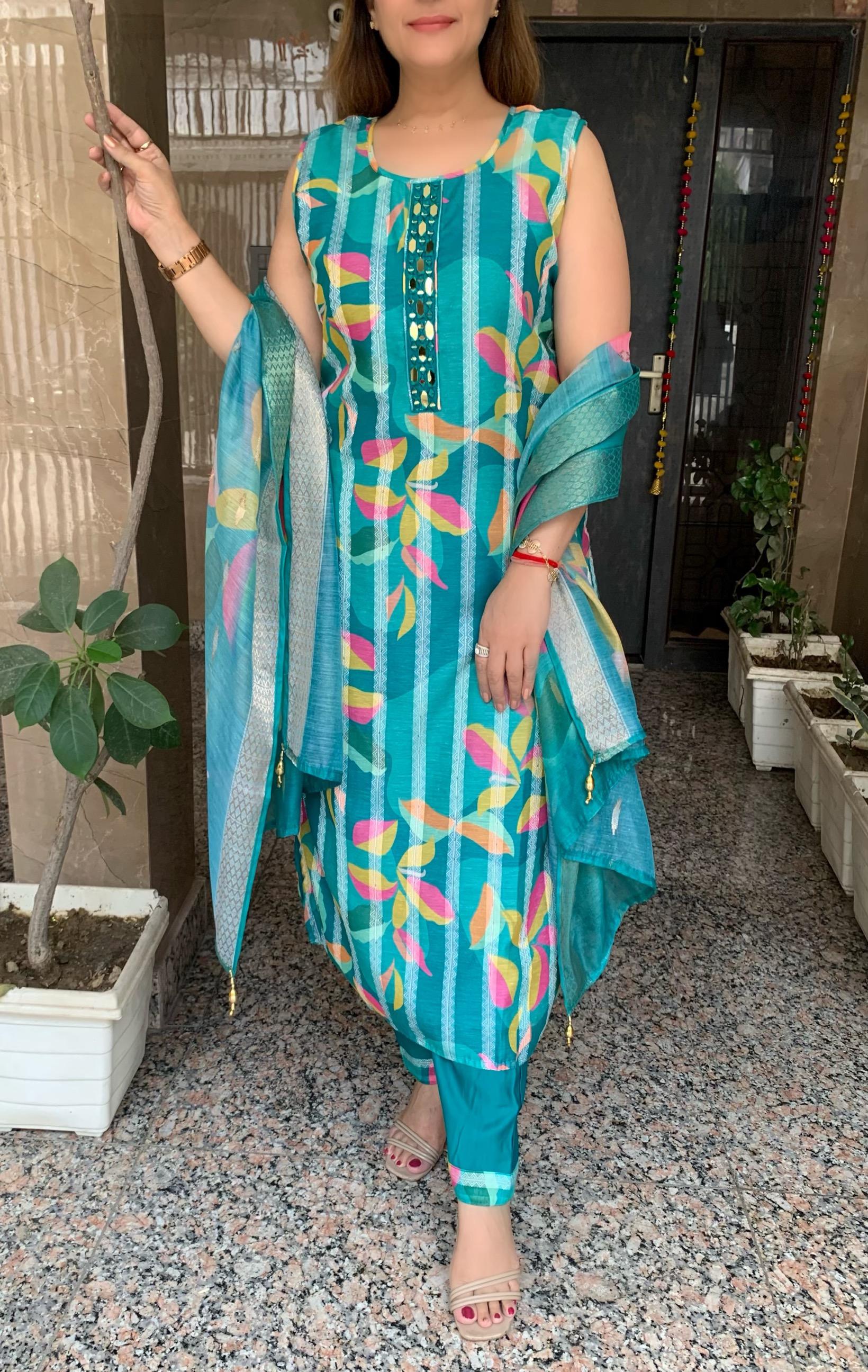 Beautiful Printed Cotton Chanderi 3 piece Self Weaving & Lining Kurta with Real Mirror Hand Work along with Cotton Silk Pant and Dupatta