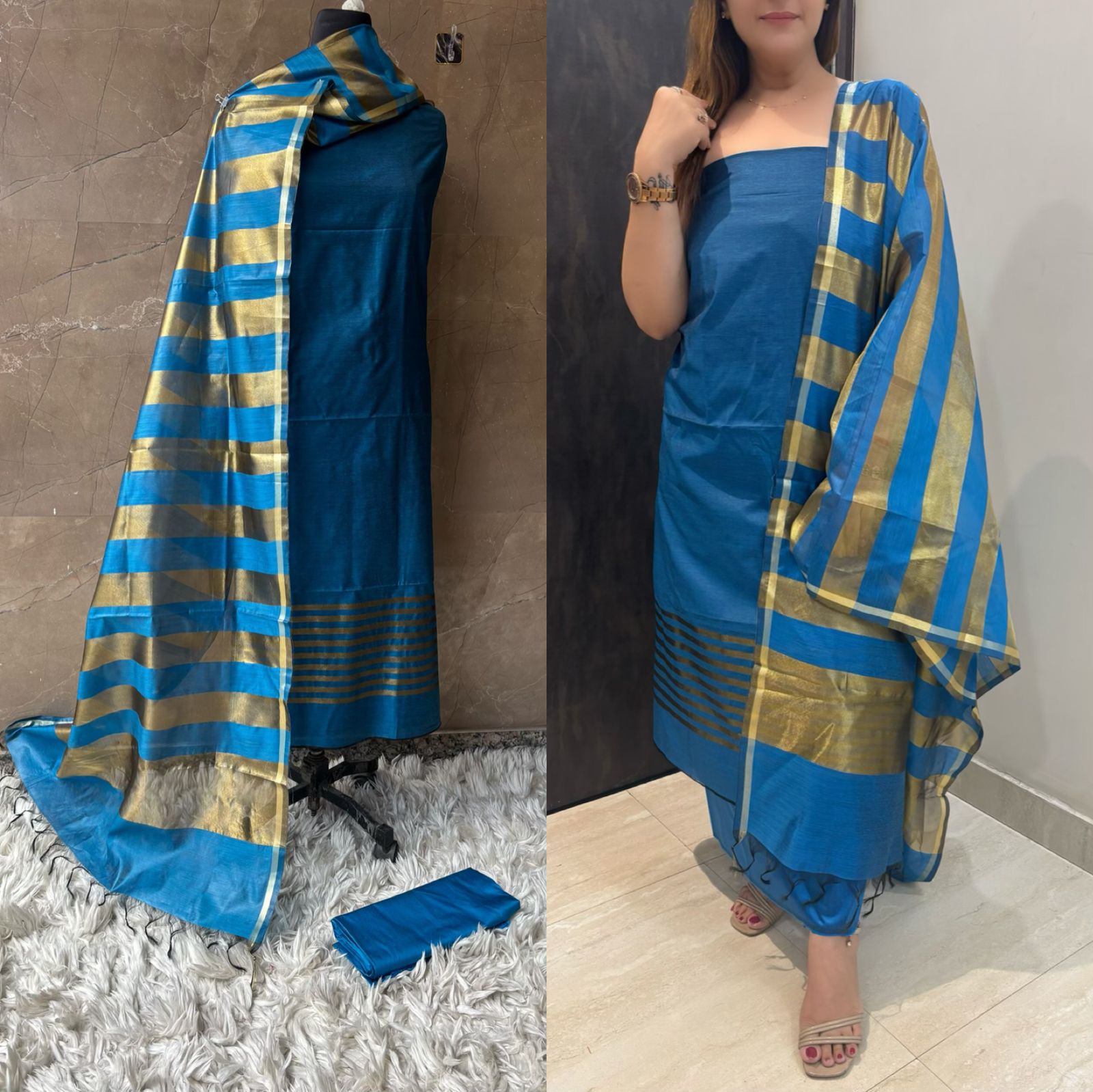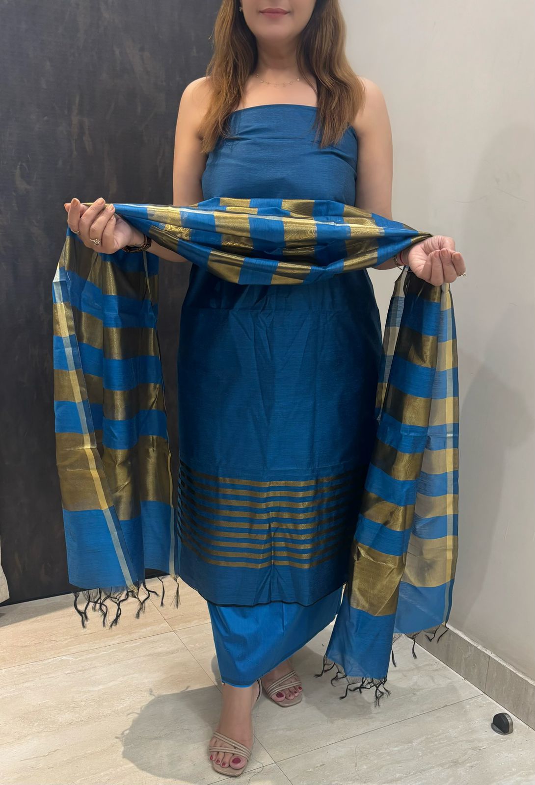 Pure Banarasi Cotton Silk Suit With Banarasi Silk Dupatta Multi Stripes (Kanjivaraam Look) with South Silk Bottom