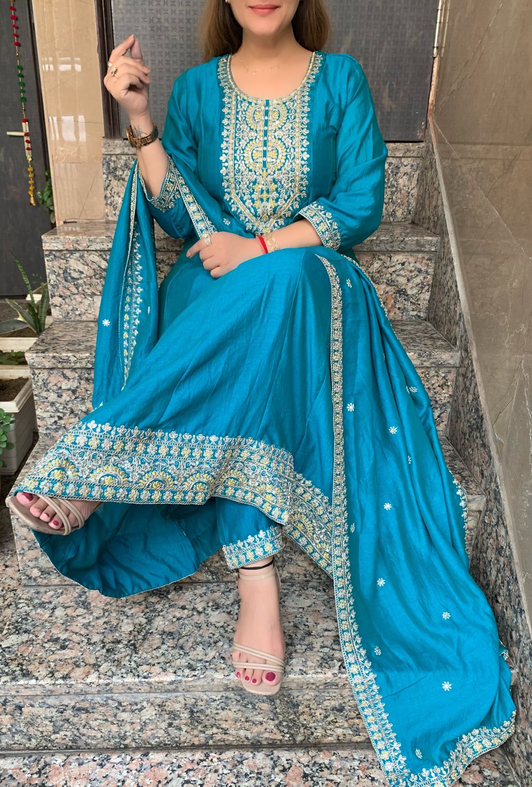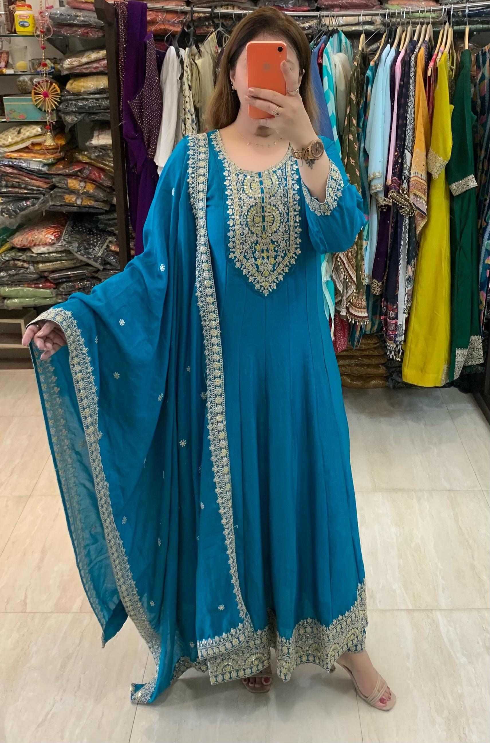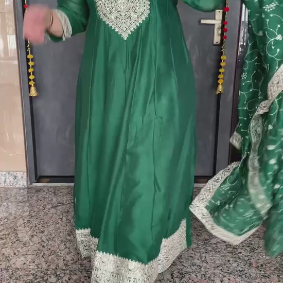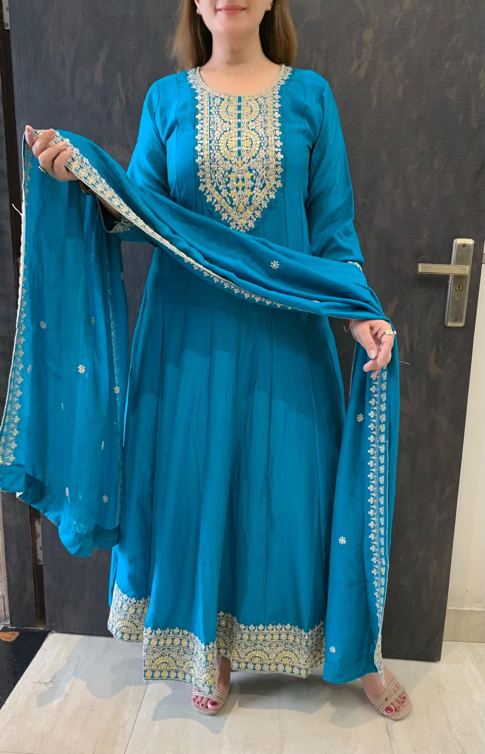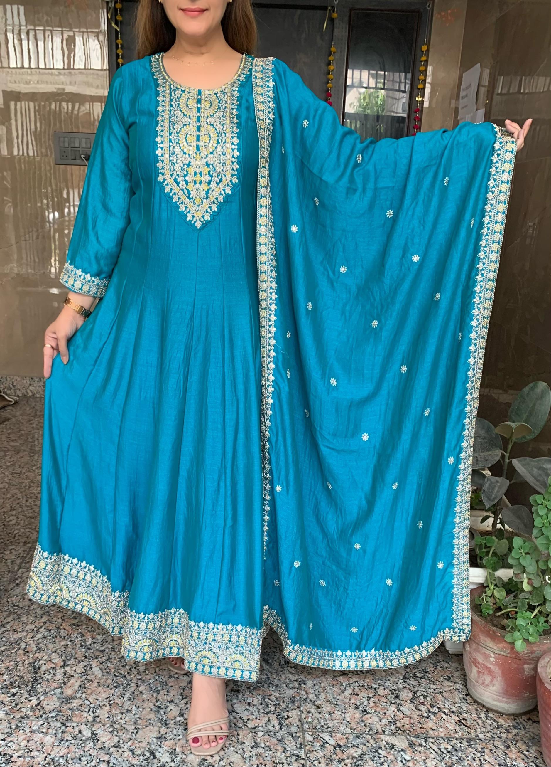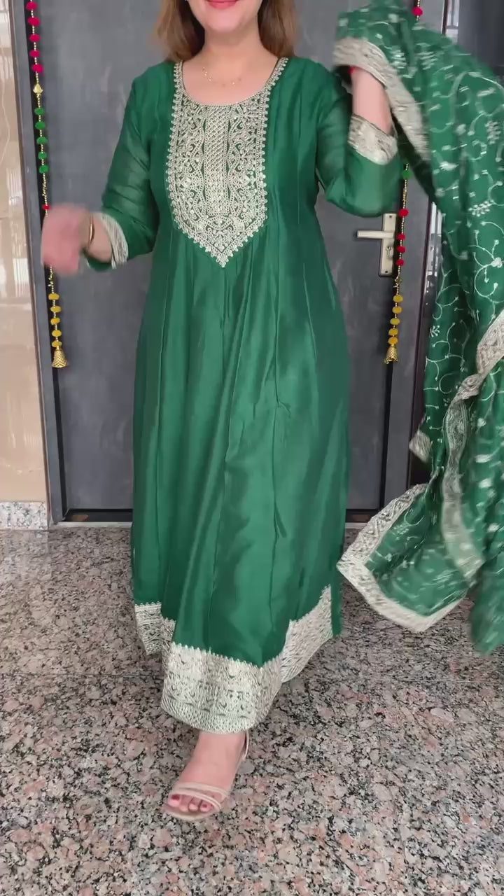 Elegant Vichitra Silk 3 Piece Full Lining Anarkali Flare Kurti Set with Beautiful Thread Cord Embroidery along with Pant and Dupatta