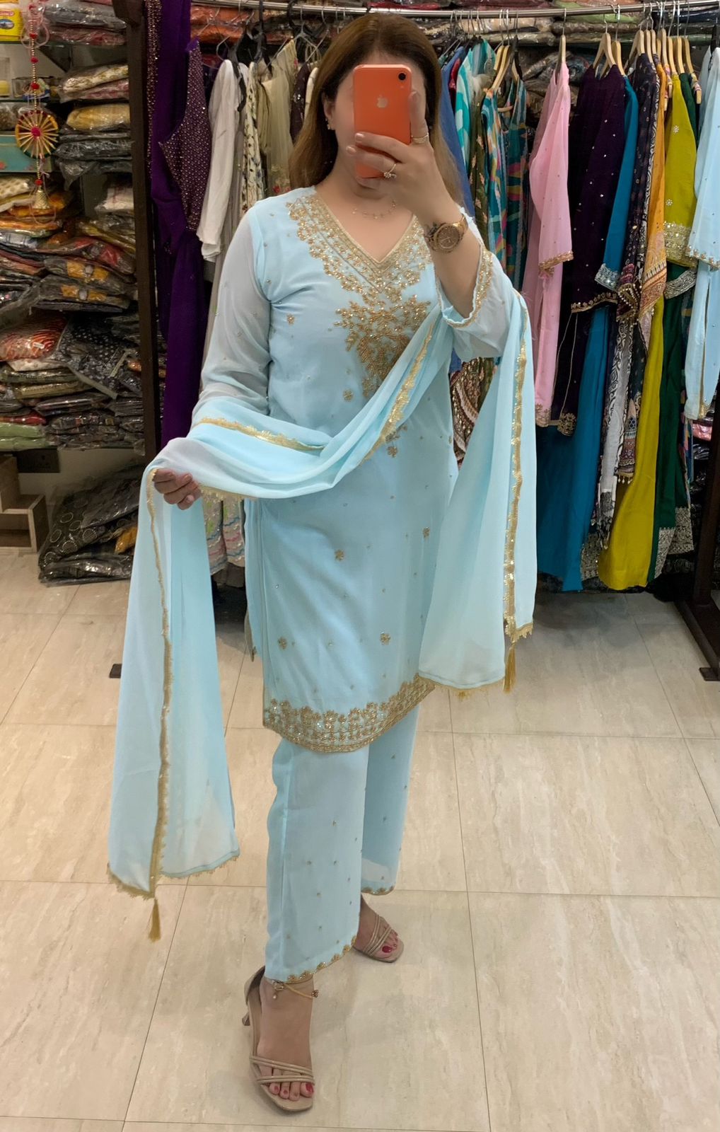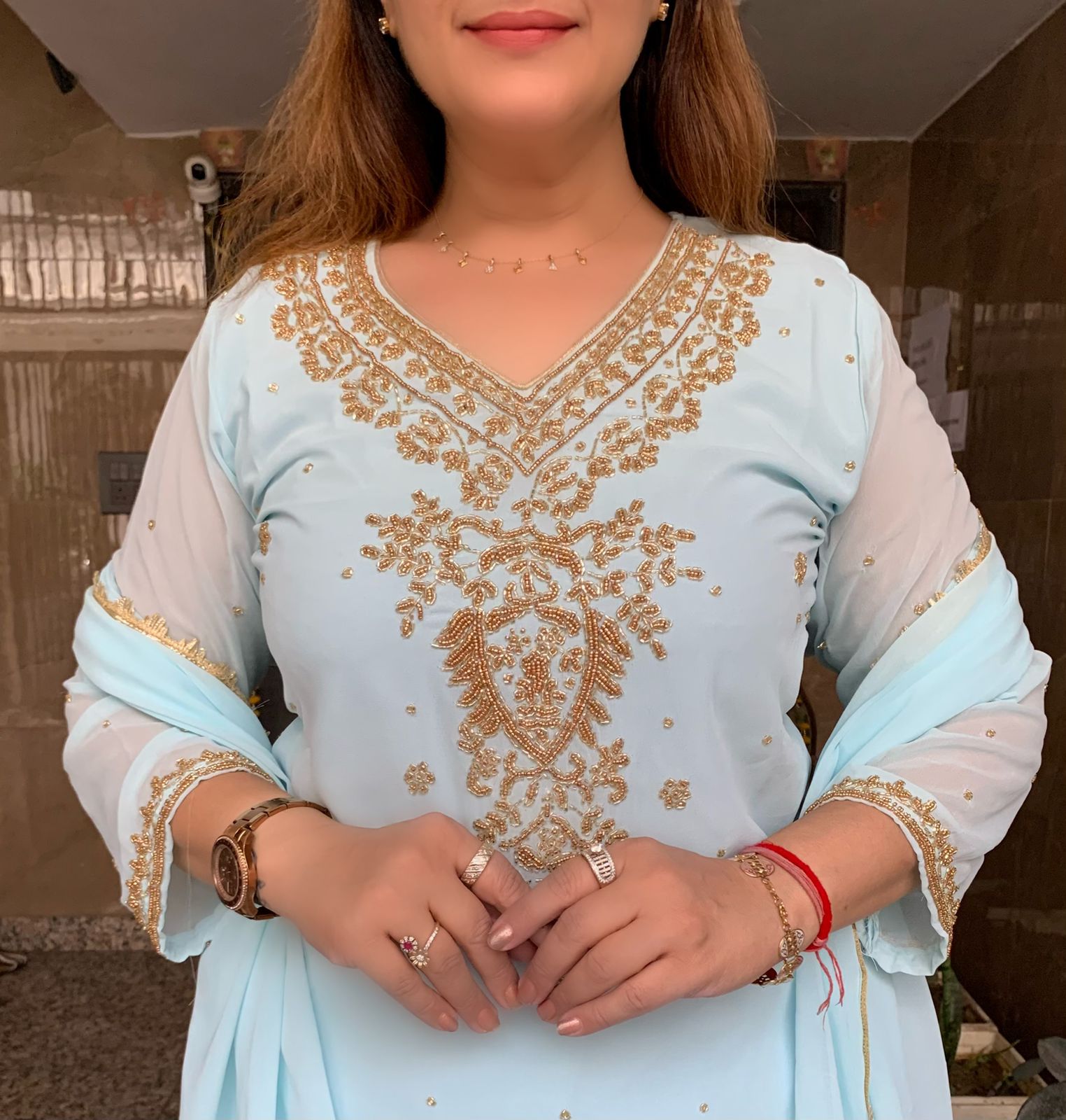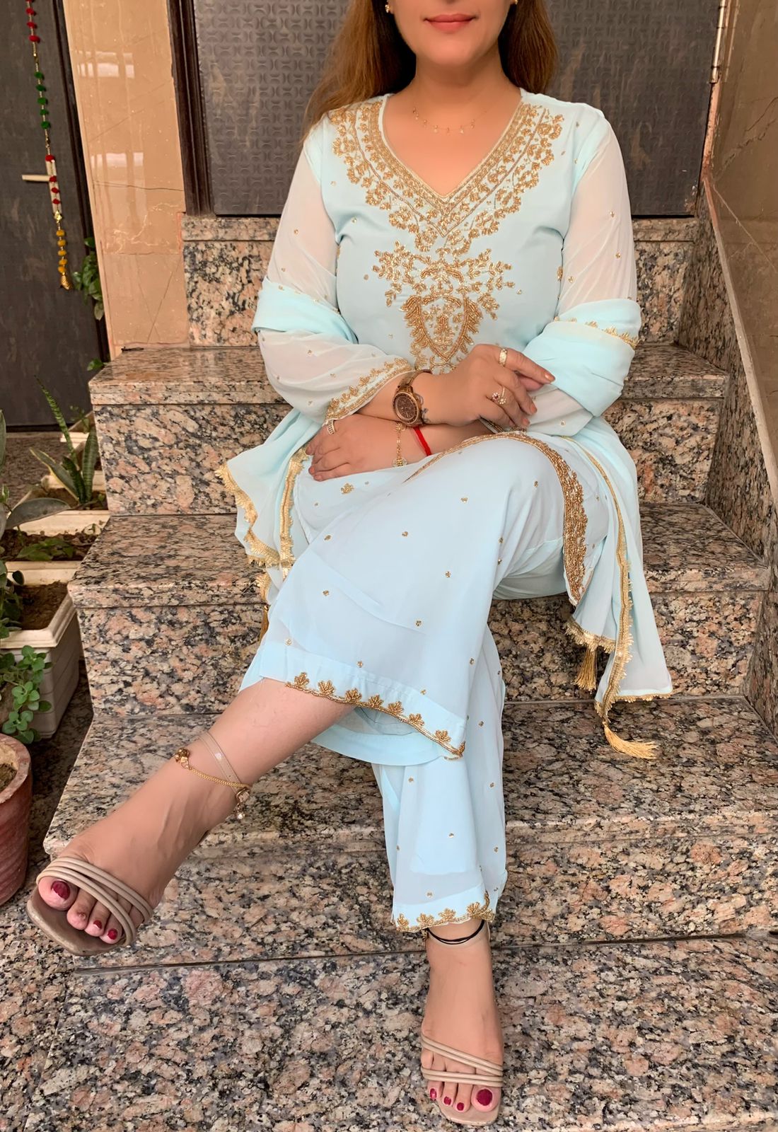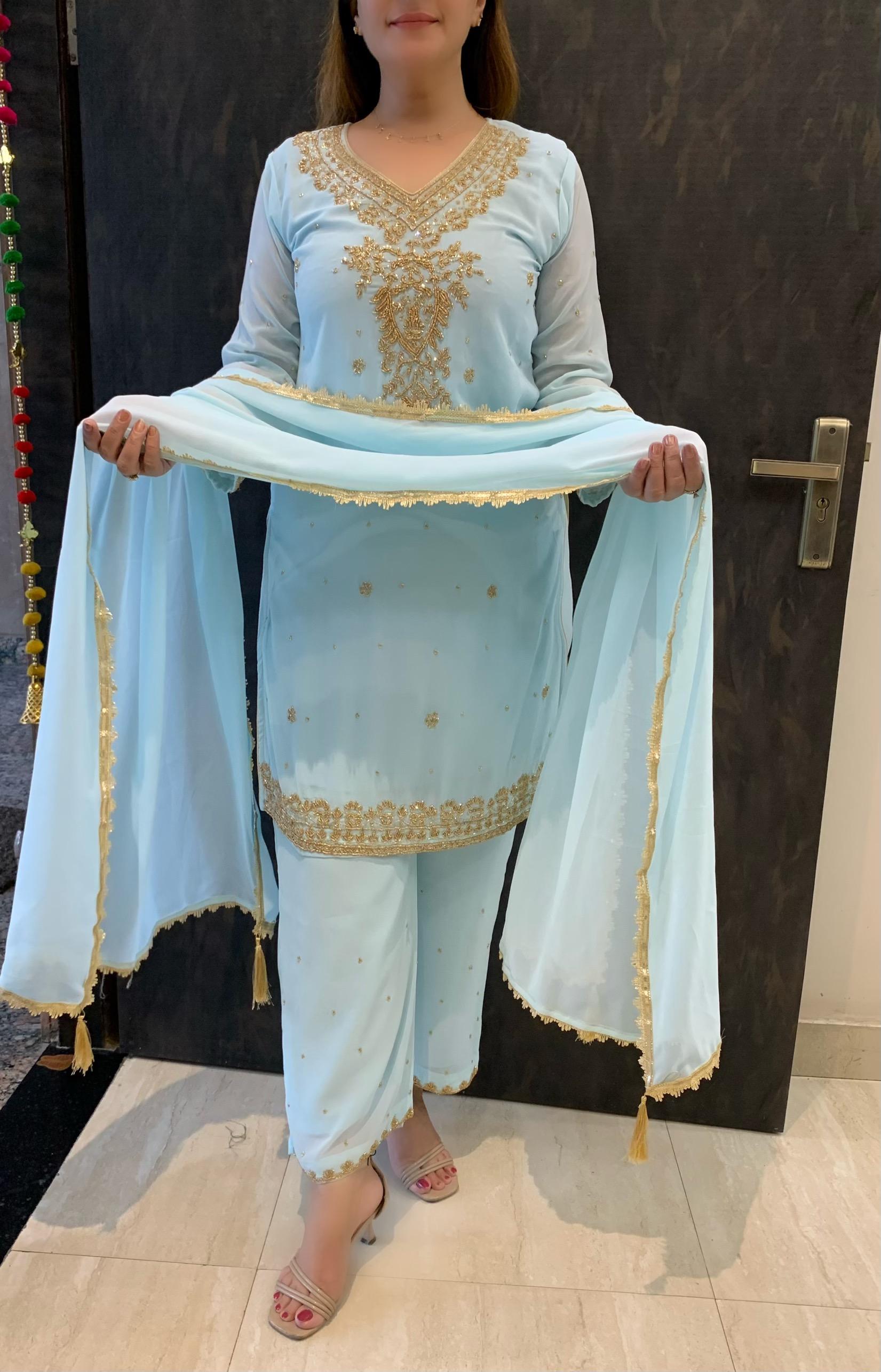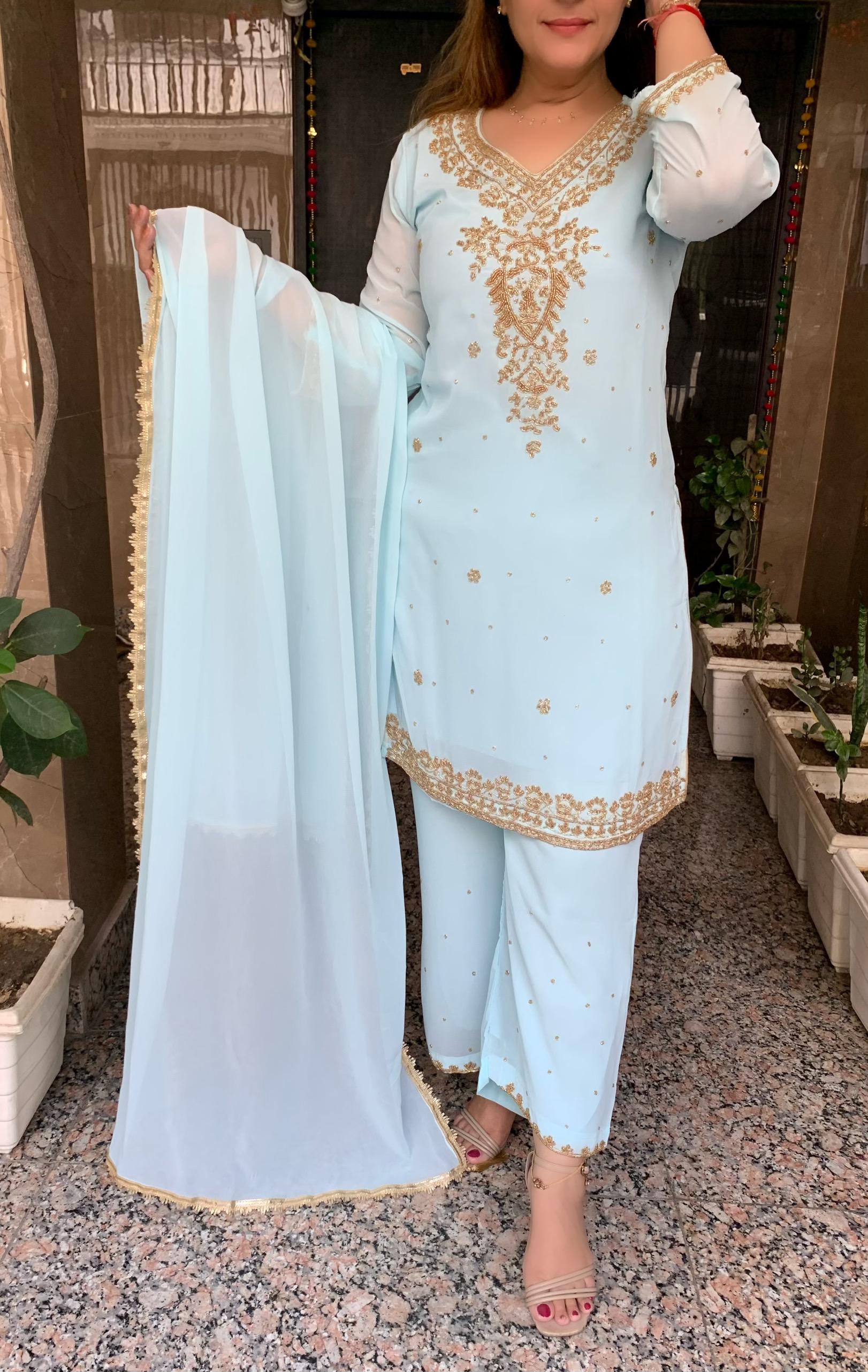 Classy Georgette 3 piece Full Lining Kurti Plazzo and Dupatta Set with Fine Beads, Real Mirror and Cutdana Hand Work