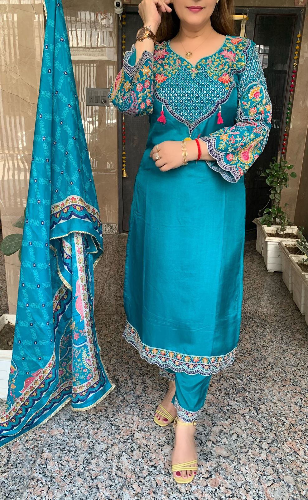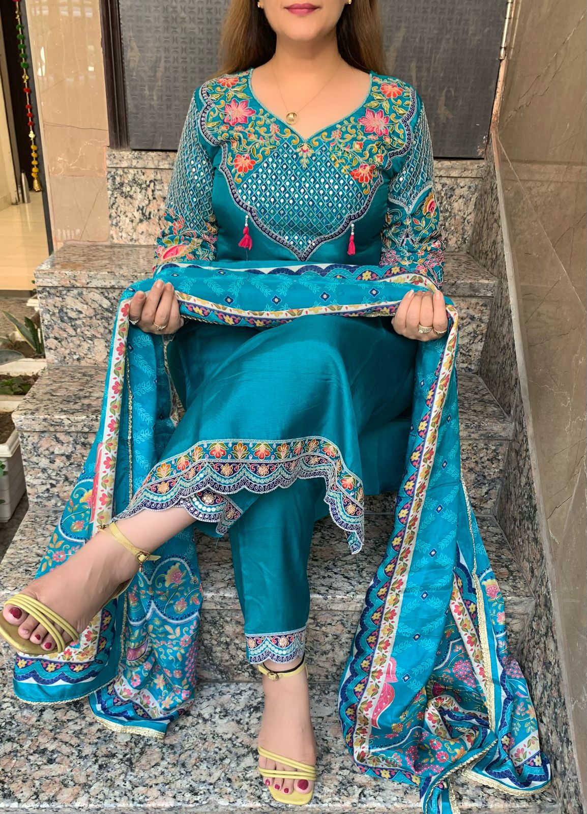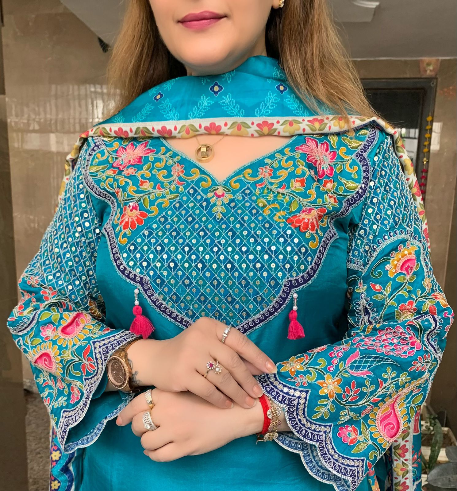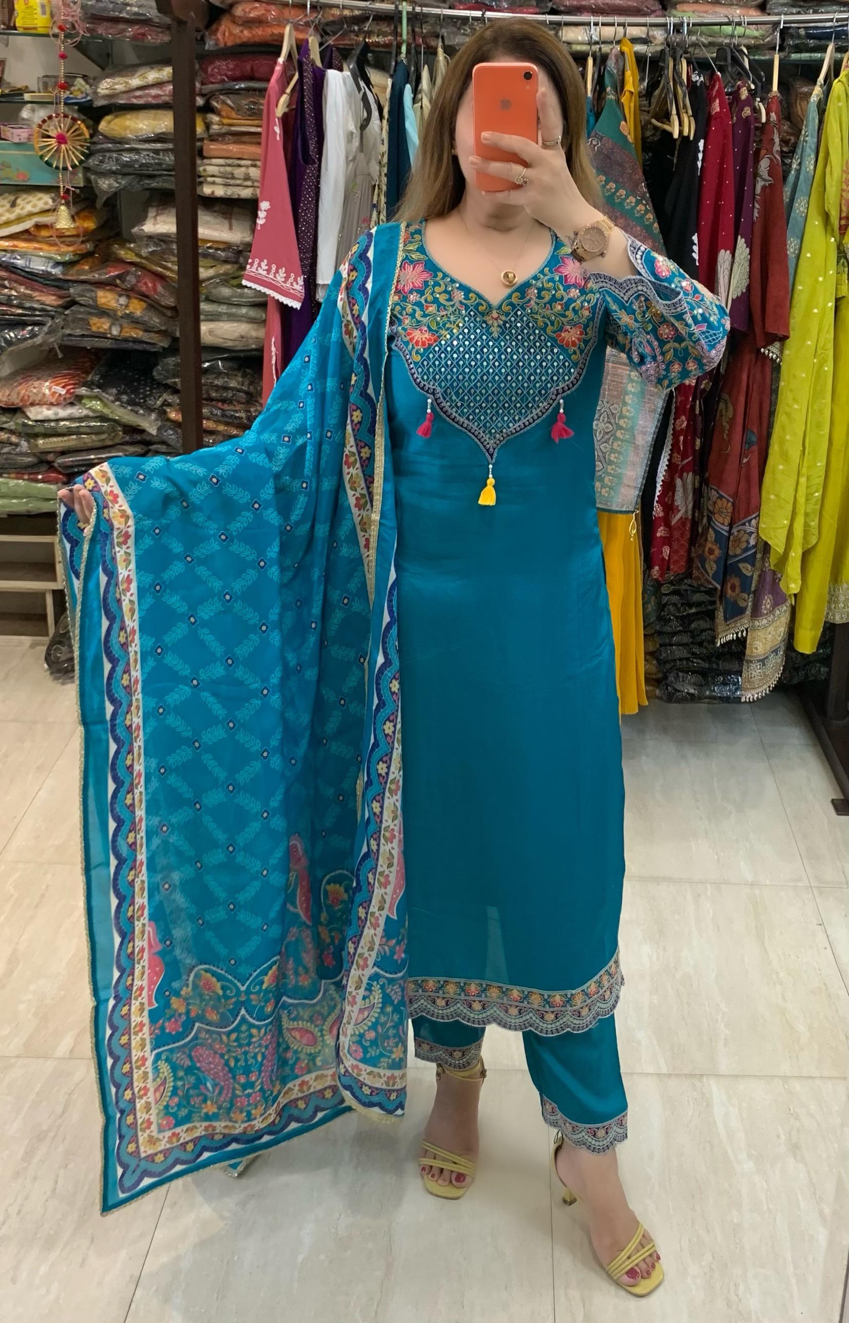 Classy 3 Piece Pure Silk Lining Kurti with Heavy Zari Sequin Thread Embroidery with Scalping along with Pant and Printed Dupatta