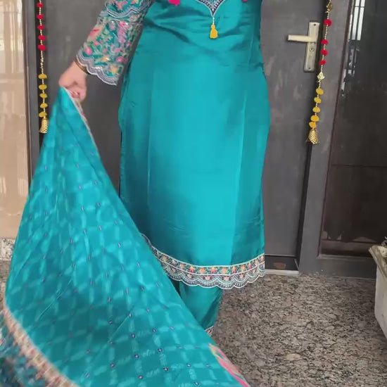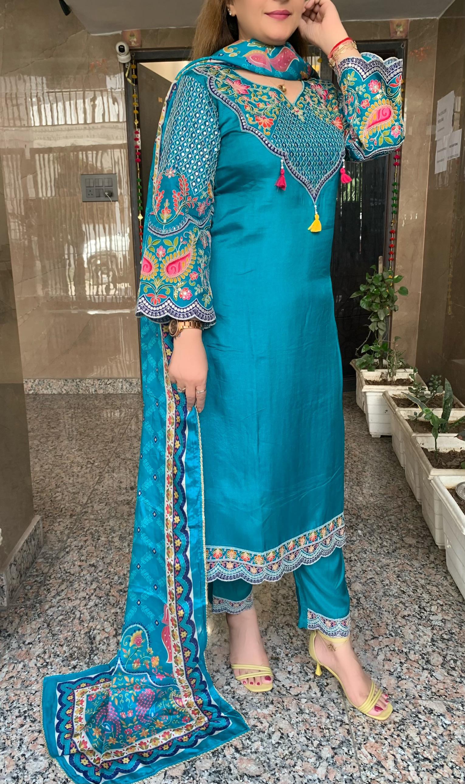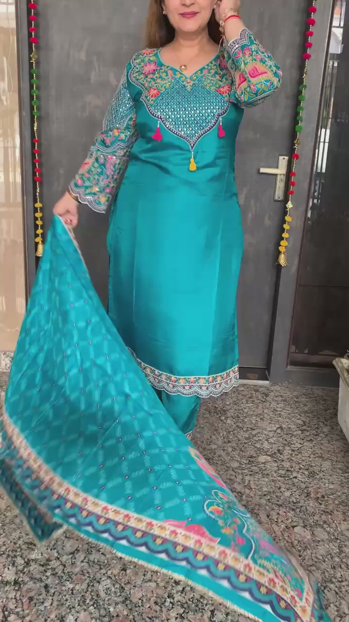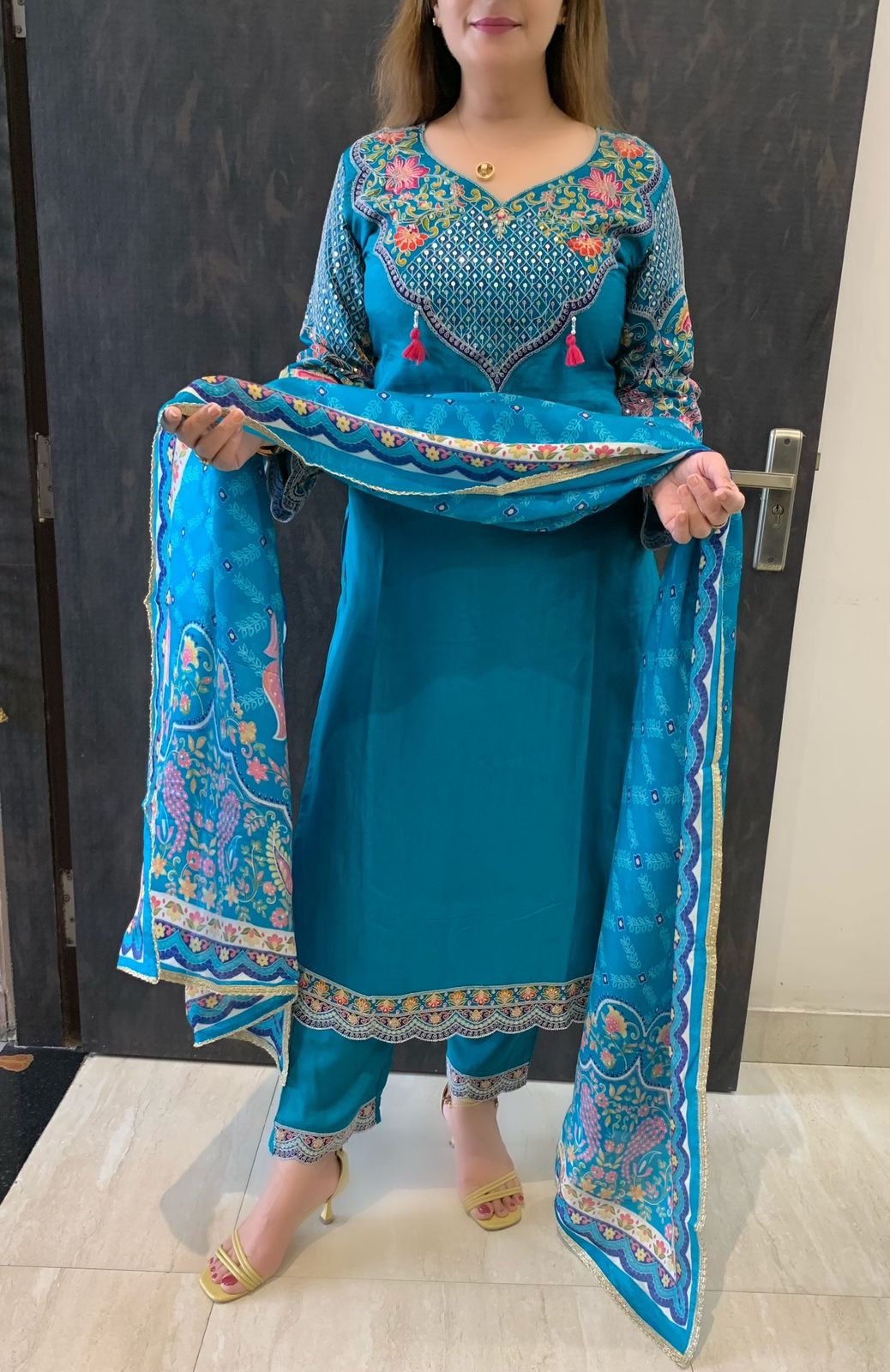 Classy 3 Piece Pure Silk Lining Kurti with Heavy Zari Sequin Thread Embroidery with Scalping along with Pant and Printed Dupatta