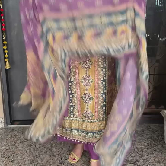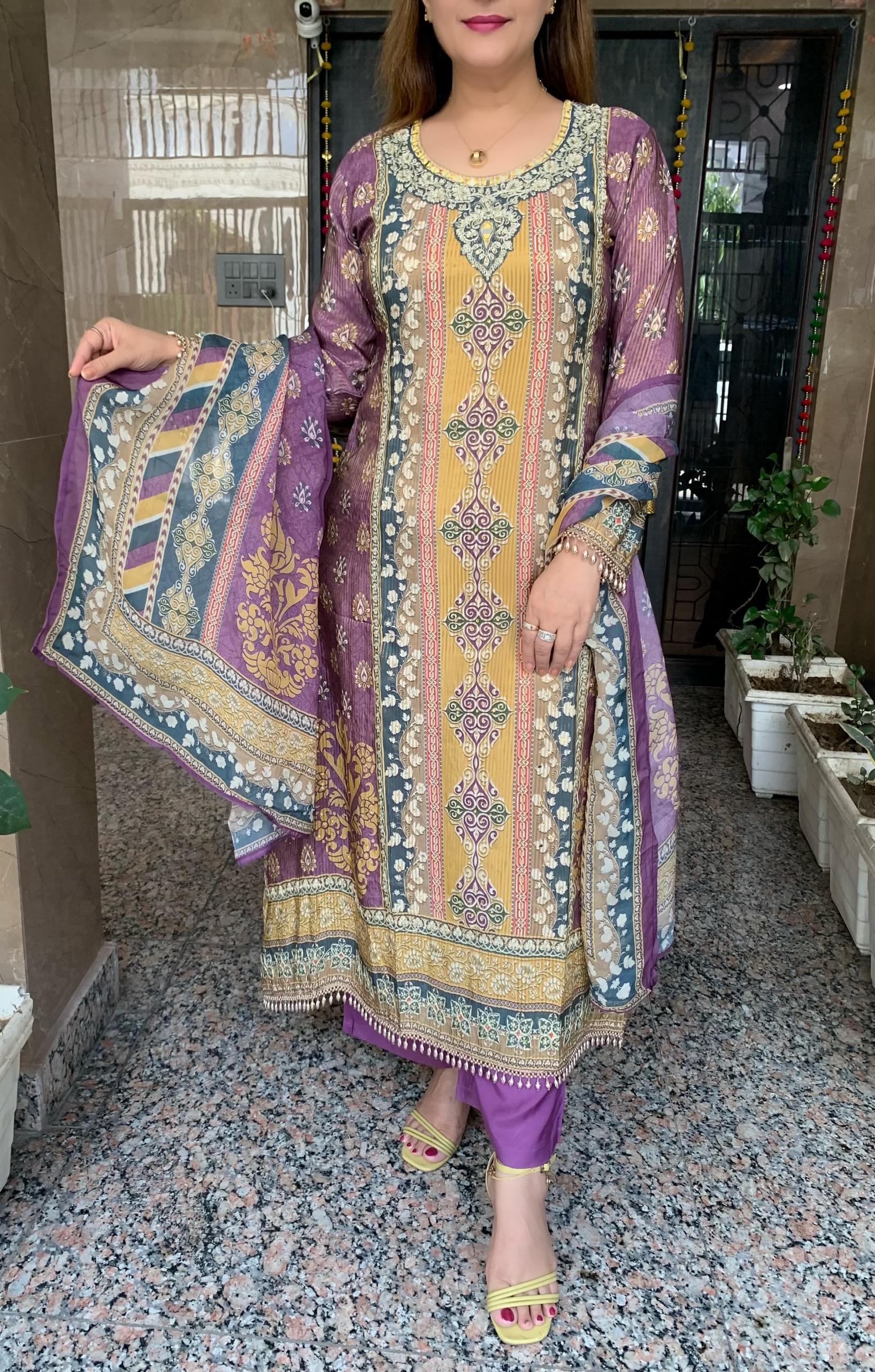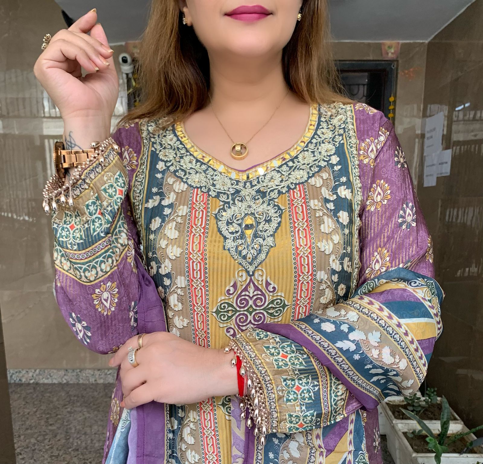 Elegant Printed 3 Piece Shimmer Muslin Fancy C Cut Kurti Set with Zari Dori and Bead Lace work along with Plazzo Pant and Printed Organza Dupatta