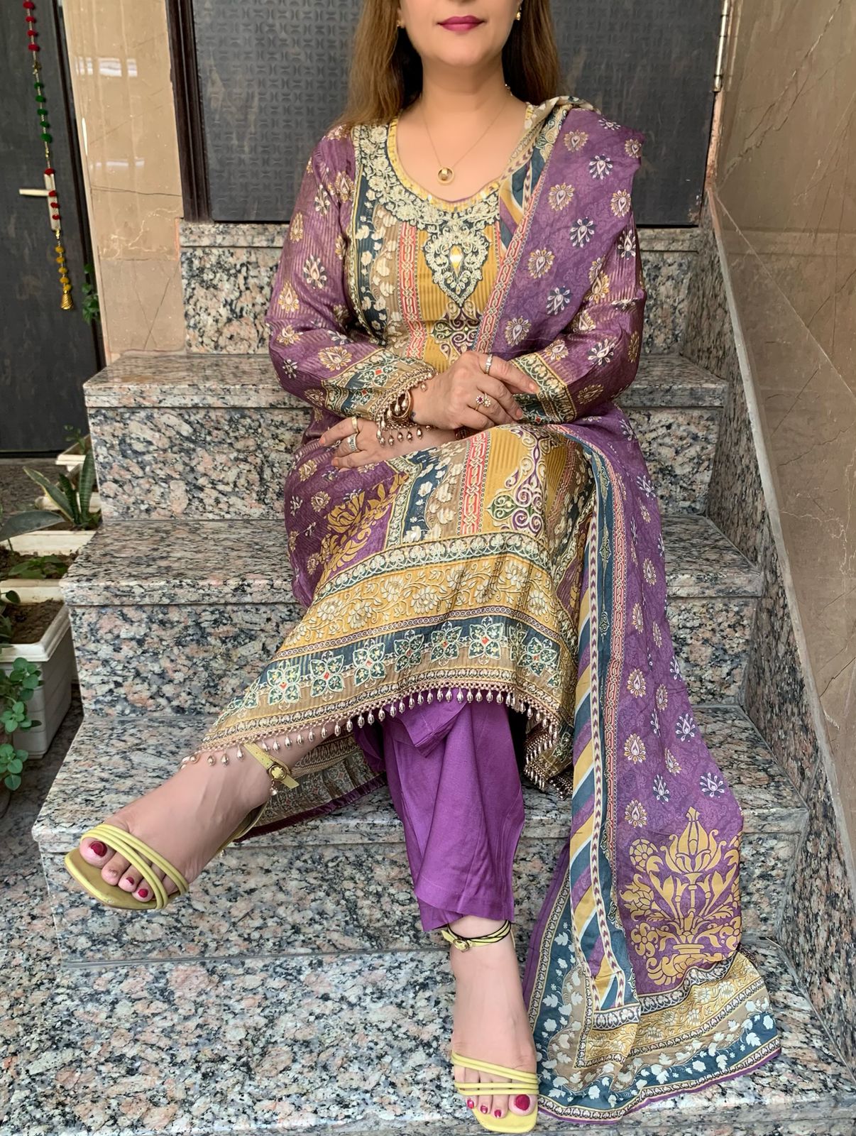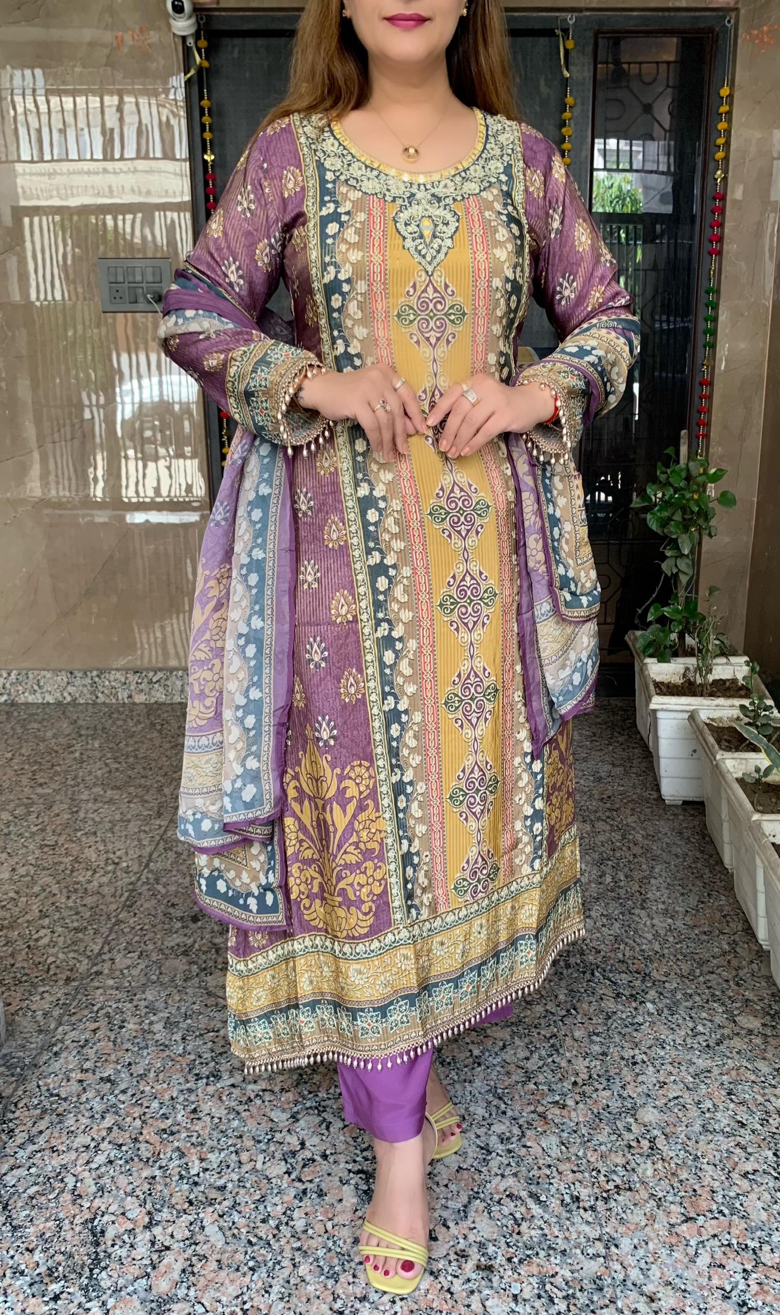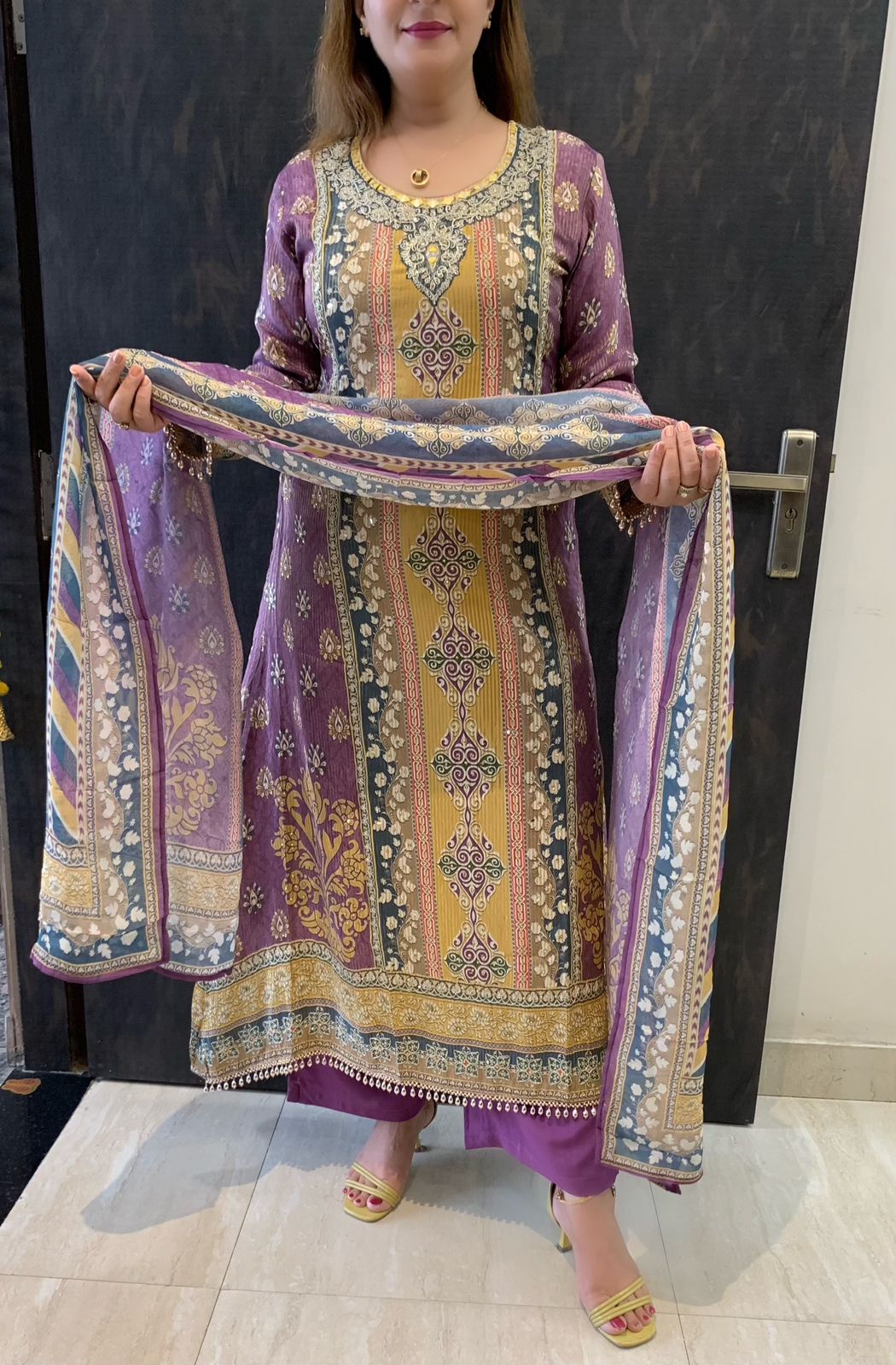 Elegant Printed 3 Piece Shimmer Muslin Fancy C Cut Kurti Set with Zari Dori and Bead Lace work along with Plazzo Pant and Printed Organza Dupatta
