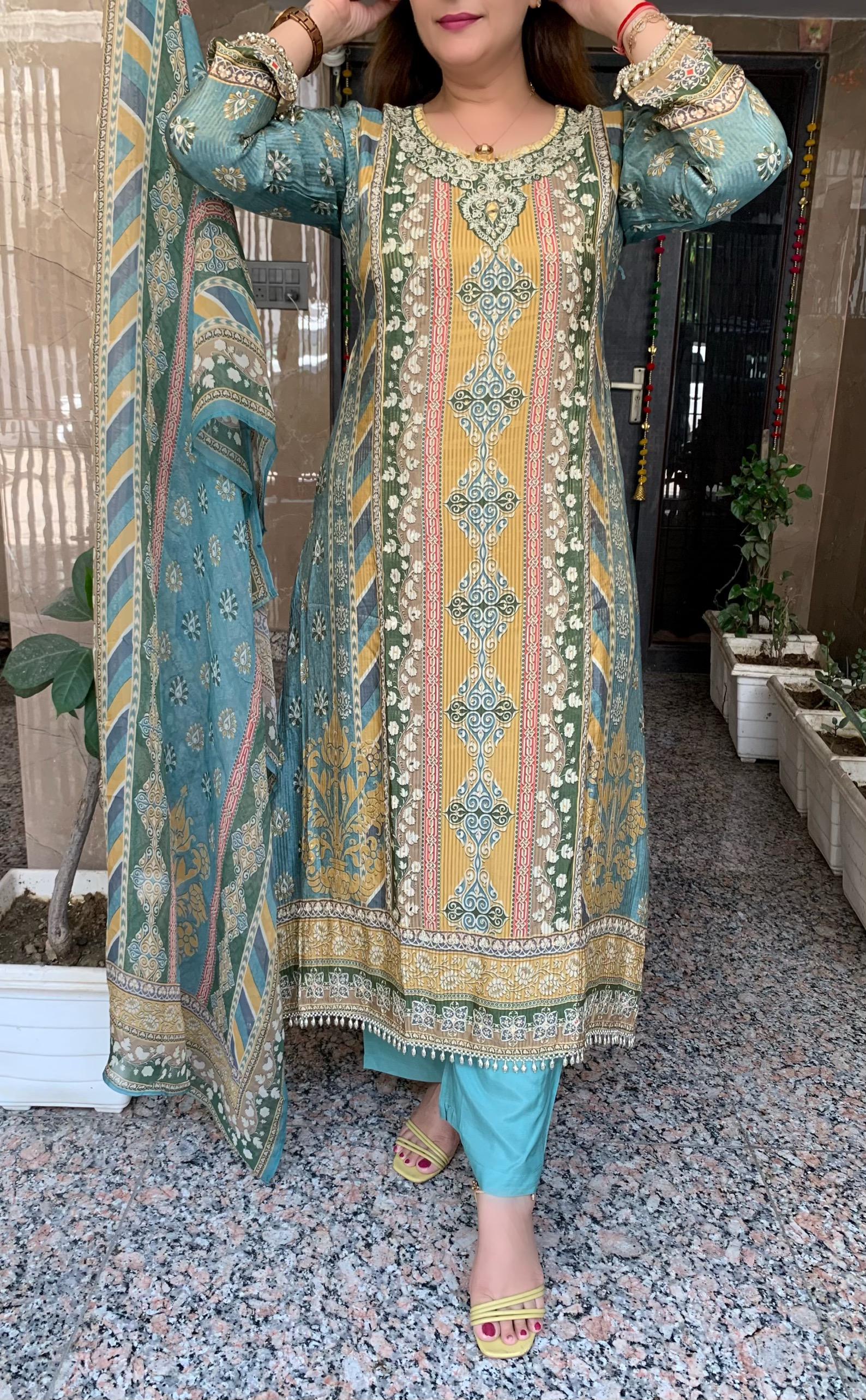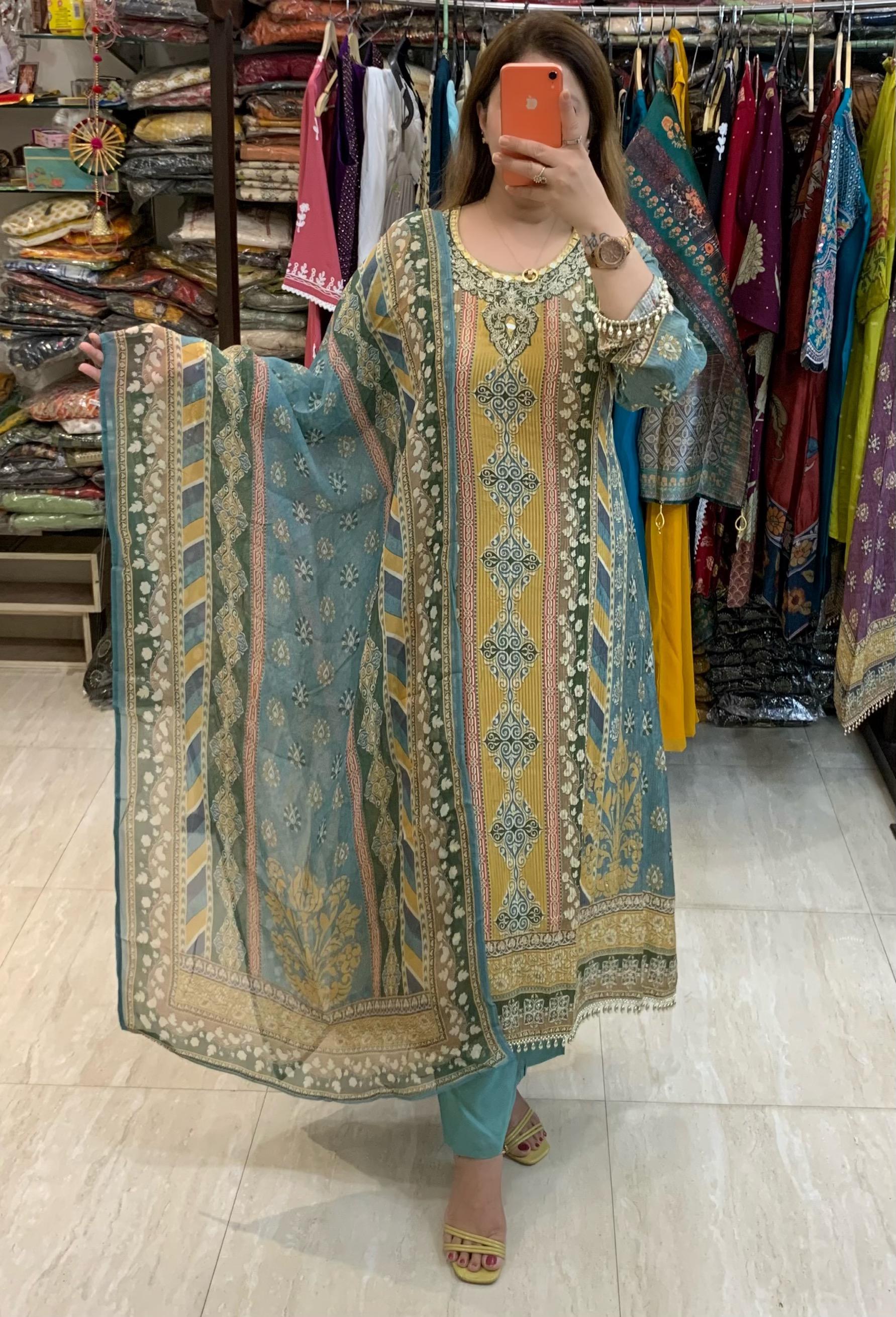 Elegant Printed 3 Piece Shimmer Muslin Fancy C Cut Kurti Set with Zari Dori and Bead Lace work along with Plazzo Pant and Printed Organza Dupatta