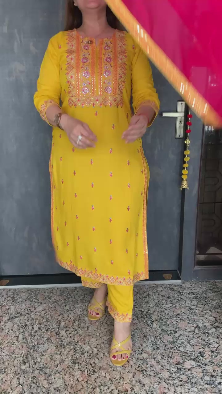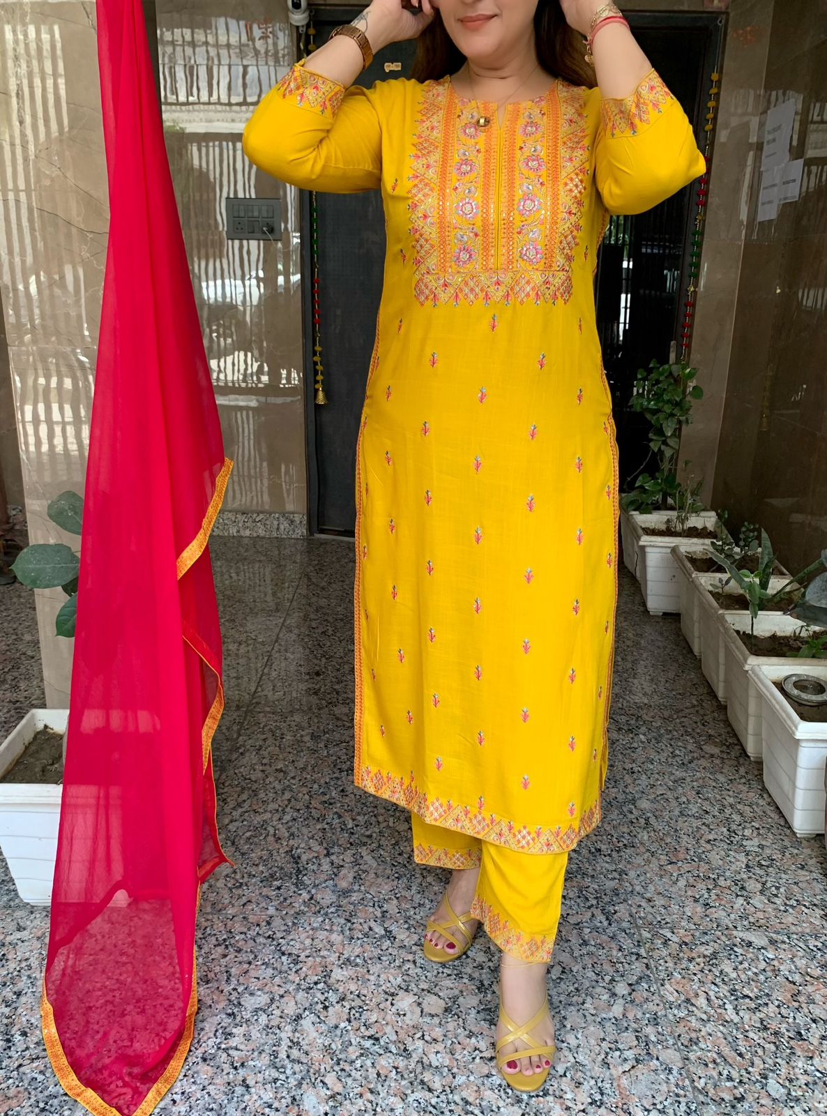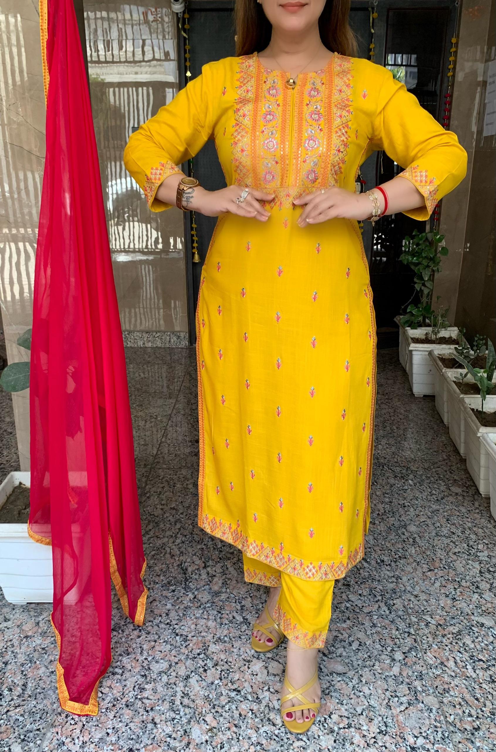 Elegant slub rayon 3 piece kurti set with fine embroidery on yoke along with pant and chiffon dupatta