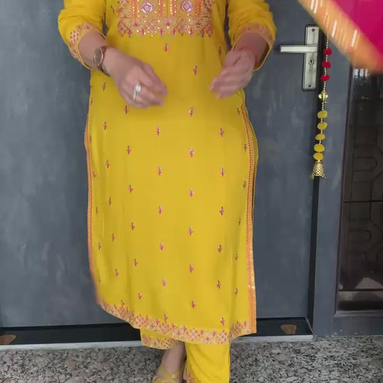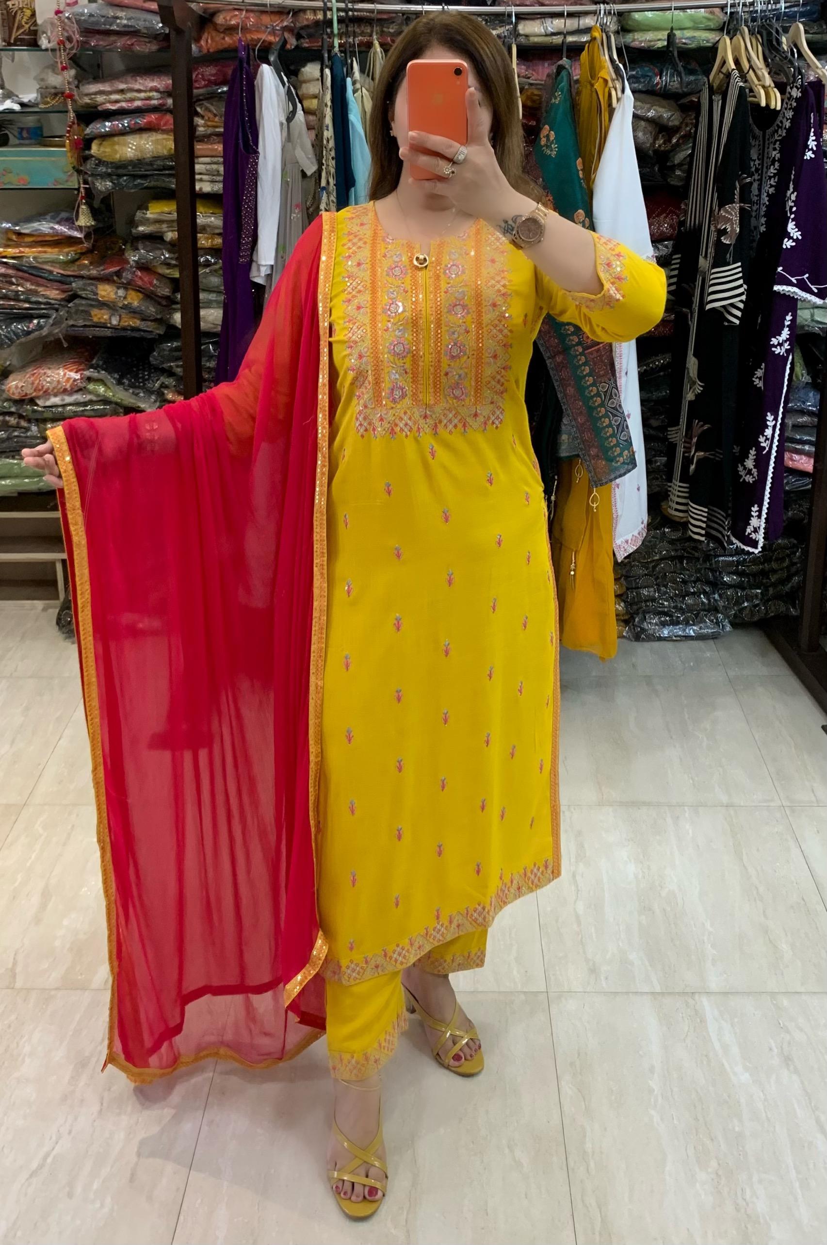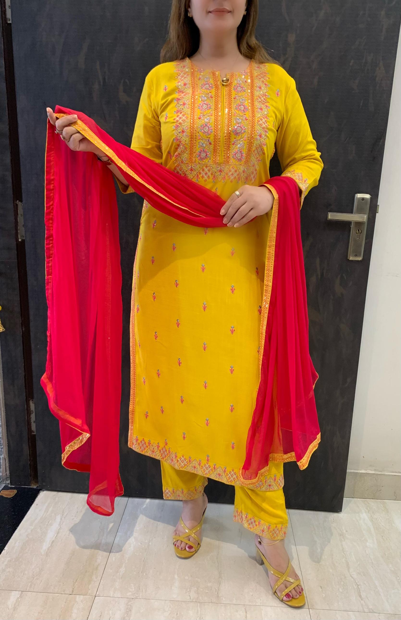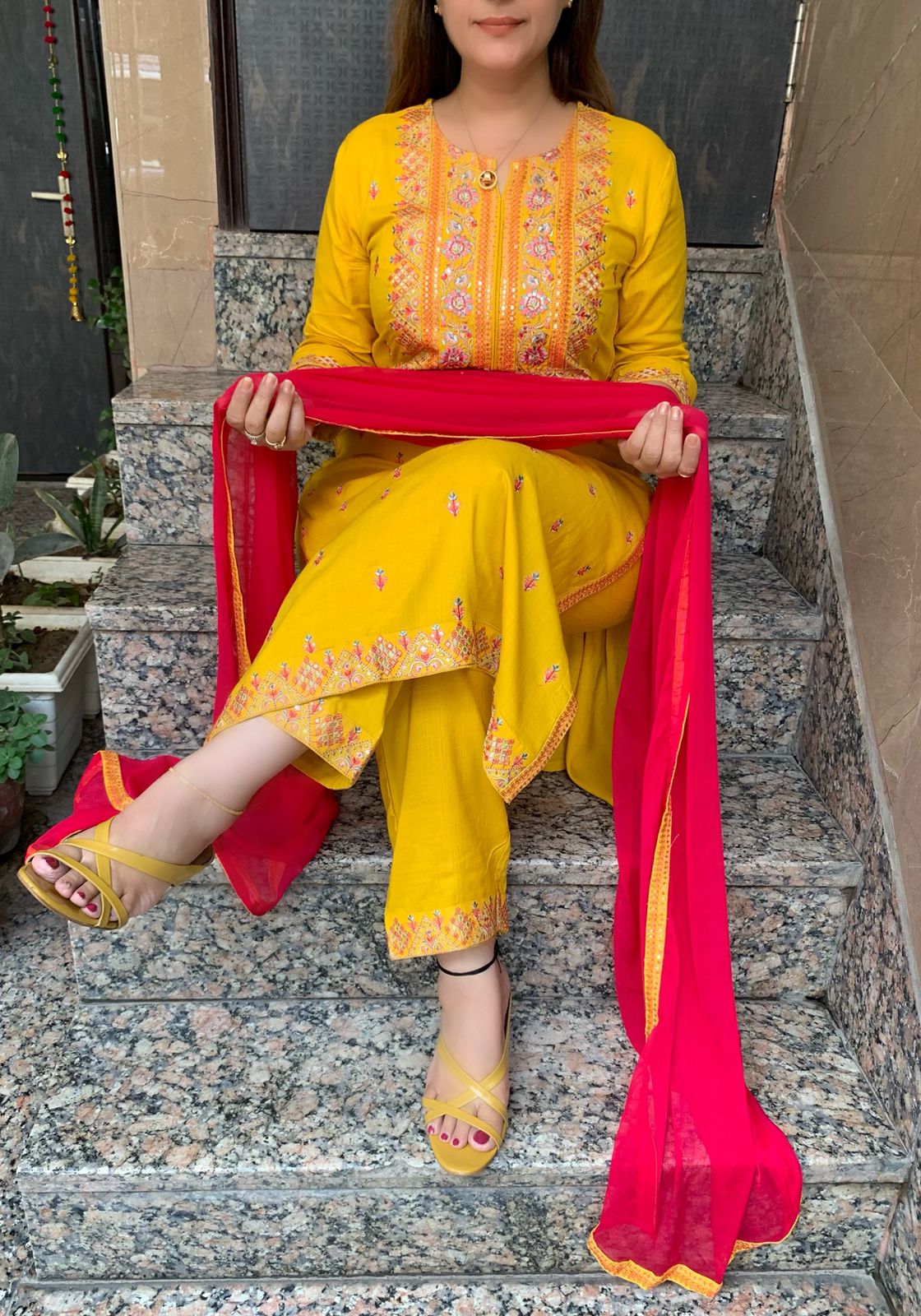 Elegant slub rayon 3 piece kurti set with fine embroidery on yoke along with pant and chiffon dupatta