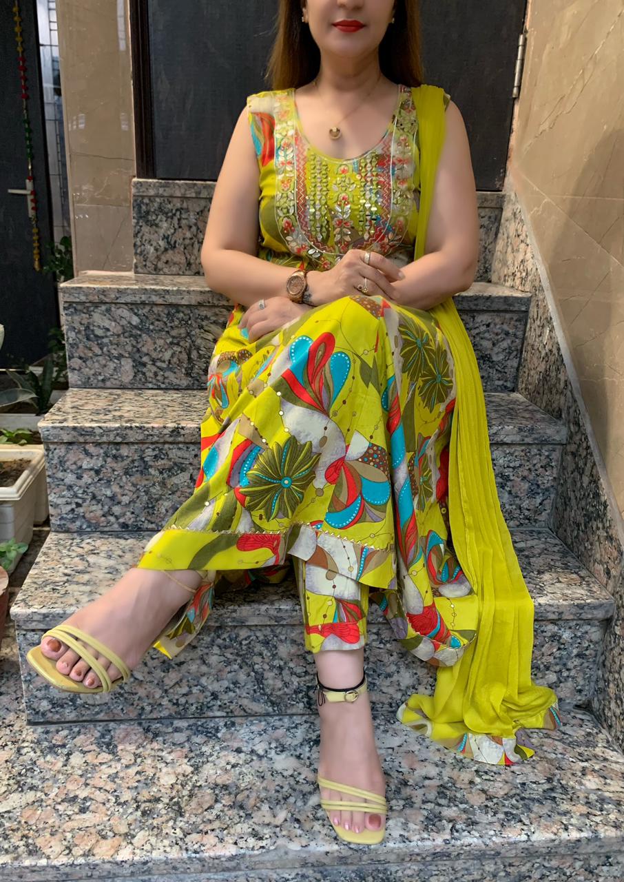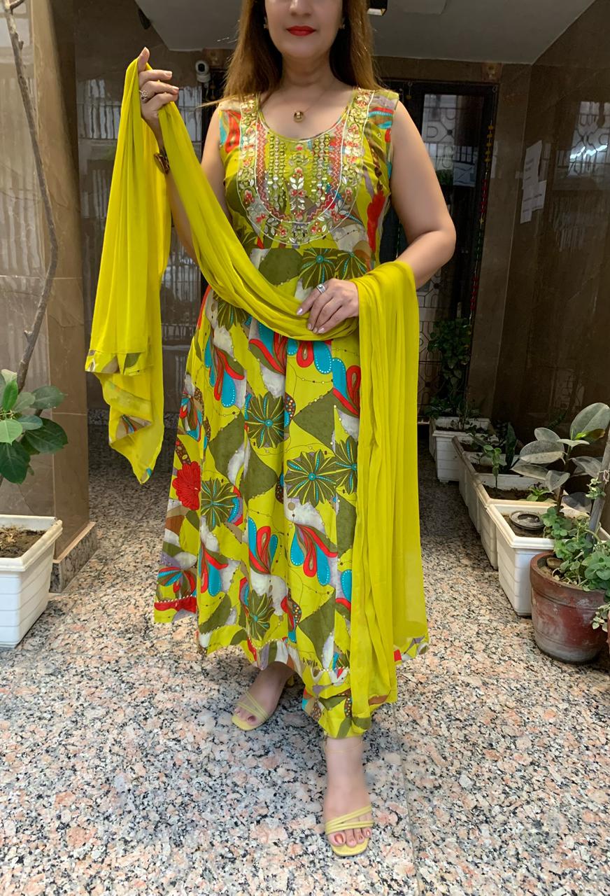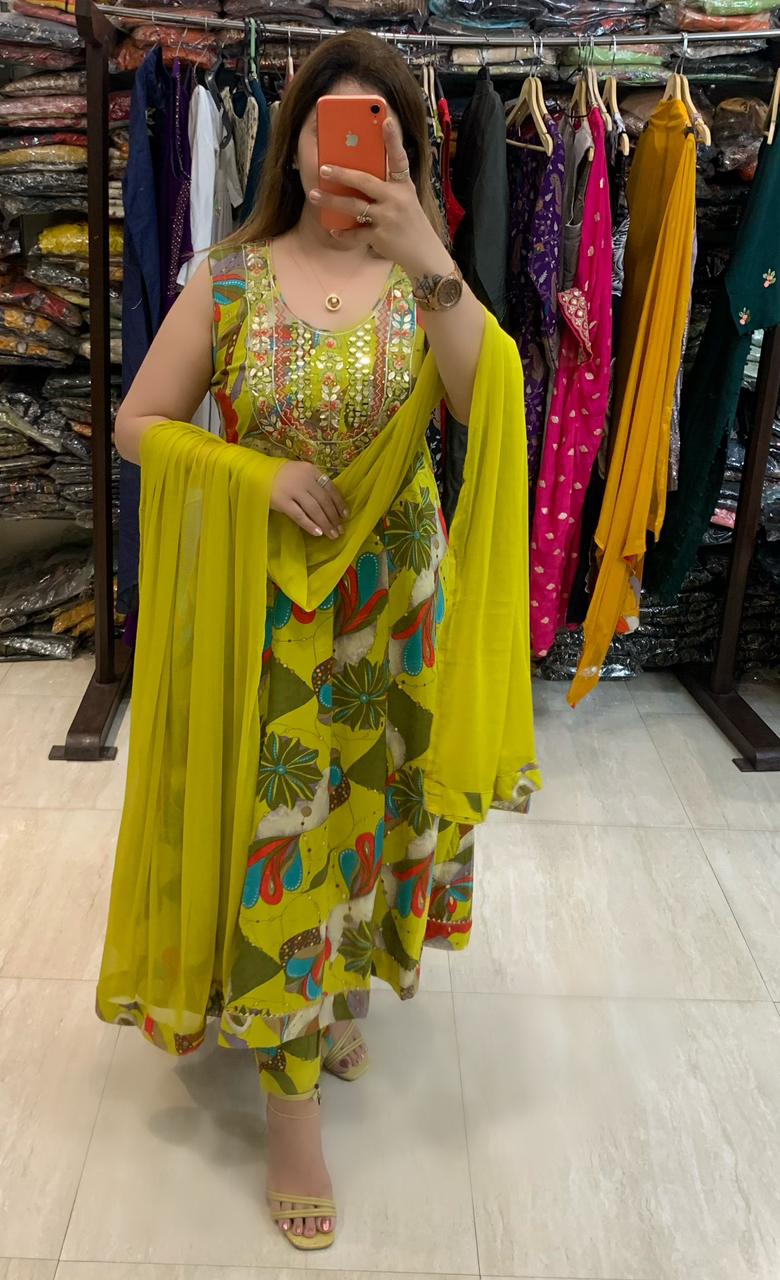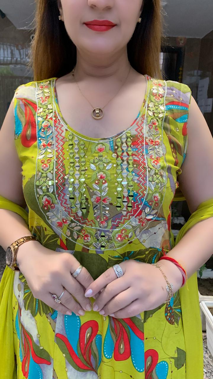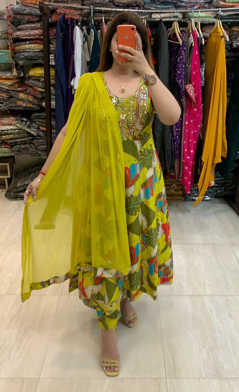 Beautiful Printed 3 piece Choli Anarkali Flare kurti with Pure Leather and Real Mirror Hand Work along with Pant and Chiffon Dupatta