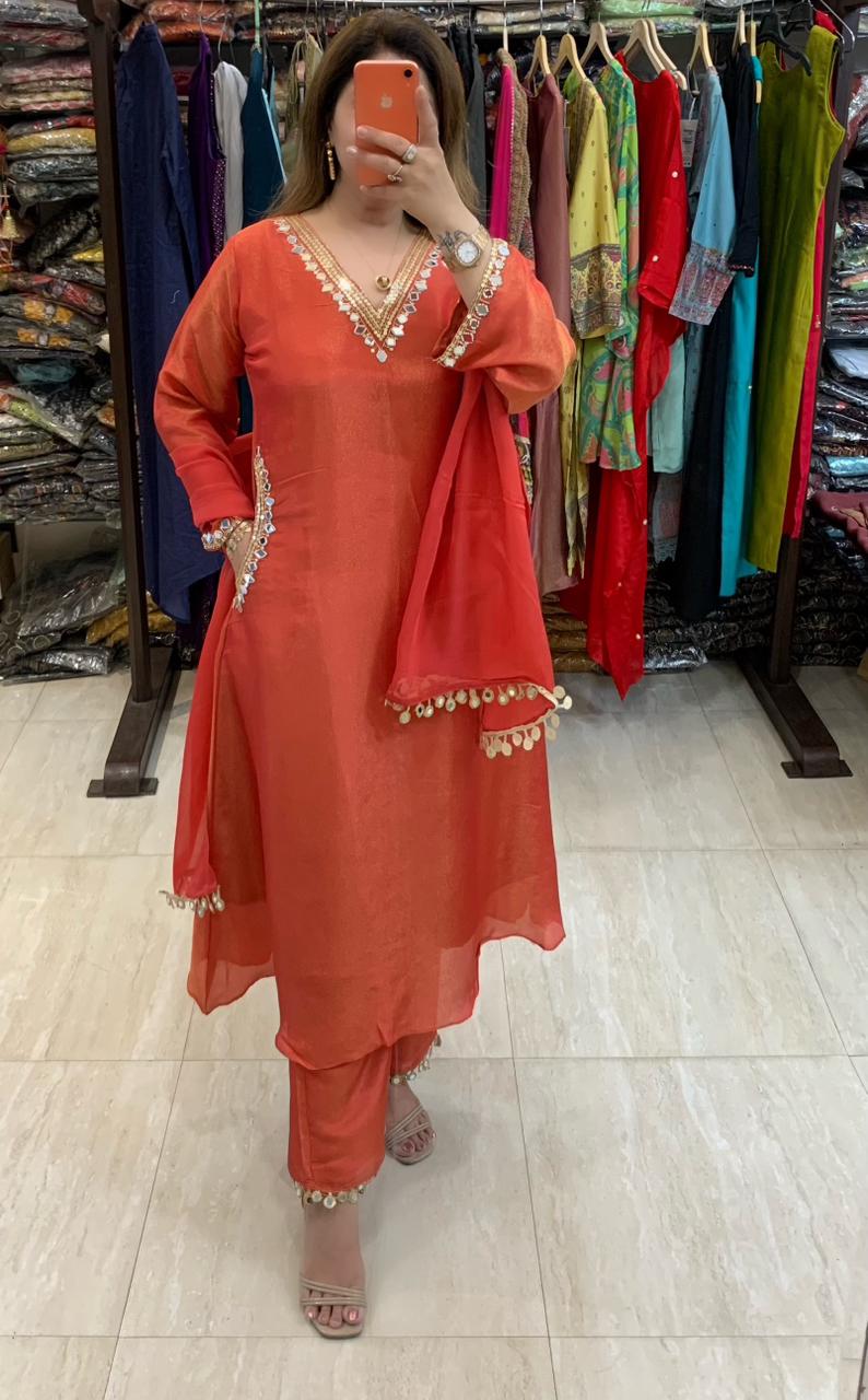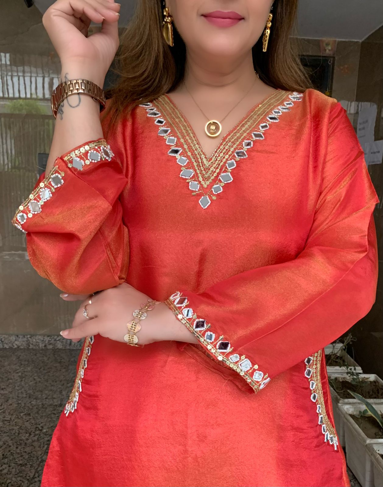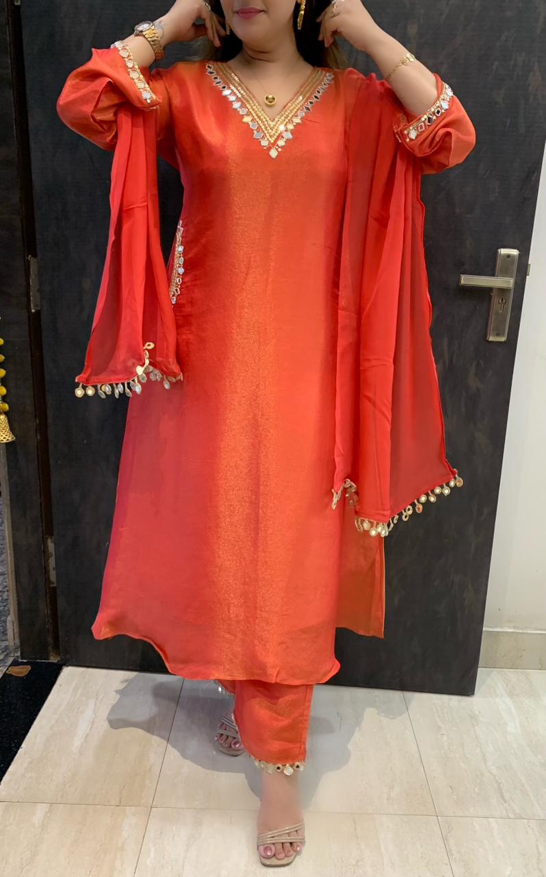 Classy Shimmer Tissue 3 Piece Full Lining Kurti with Fine Pearl Real Mirror, Sequin and Cut Dana Hand work with Side Pockets along with Pant Plazzo and Organza Dupatta with Real Mirror Lace Work