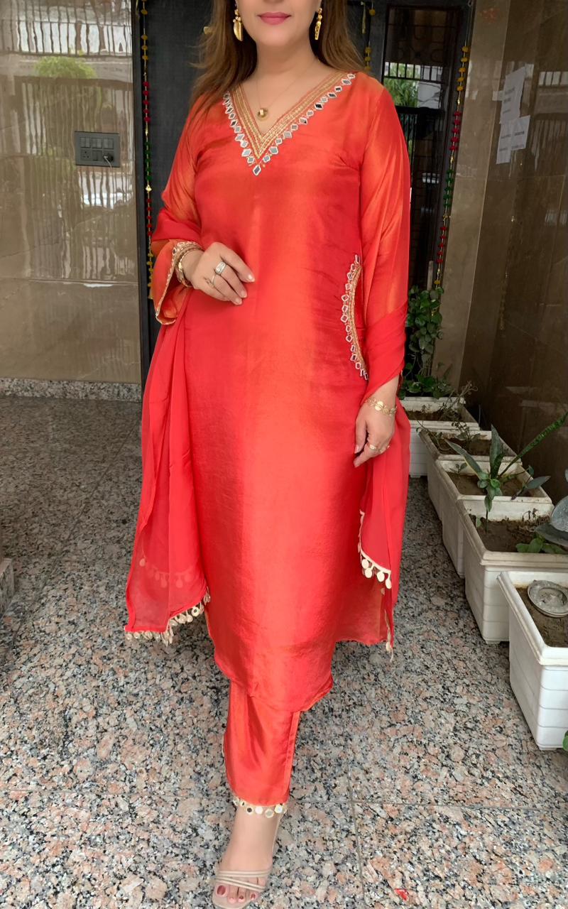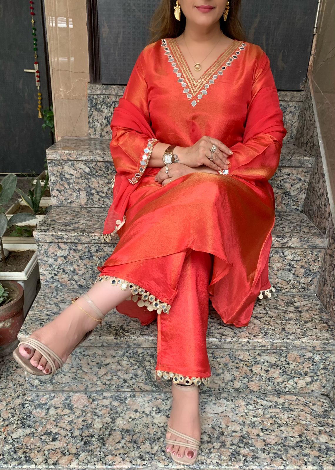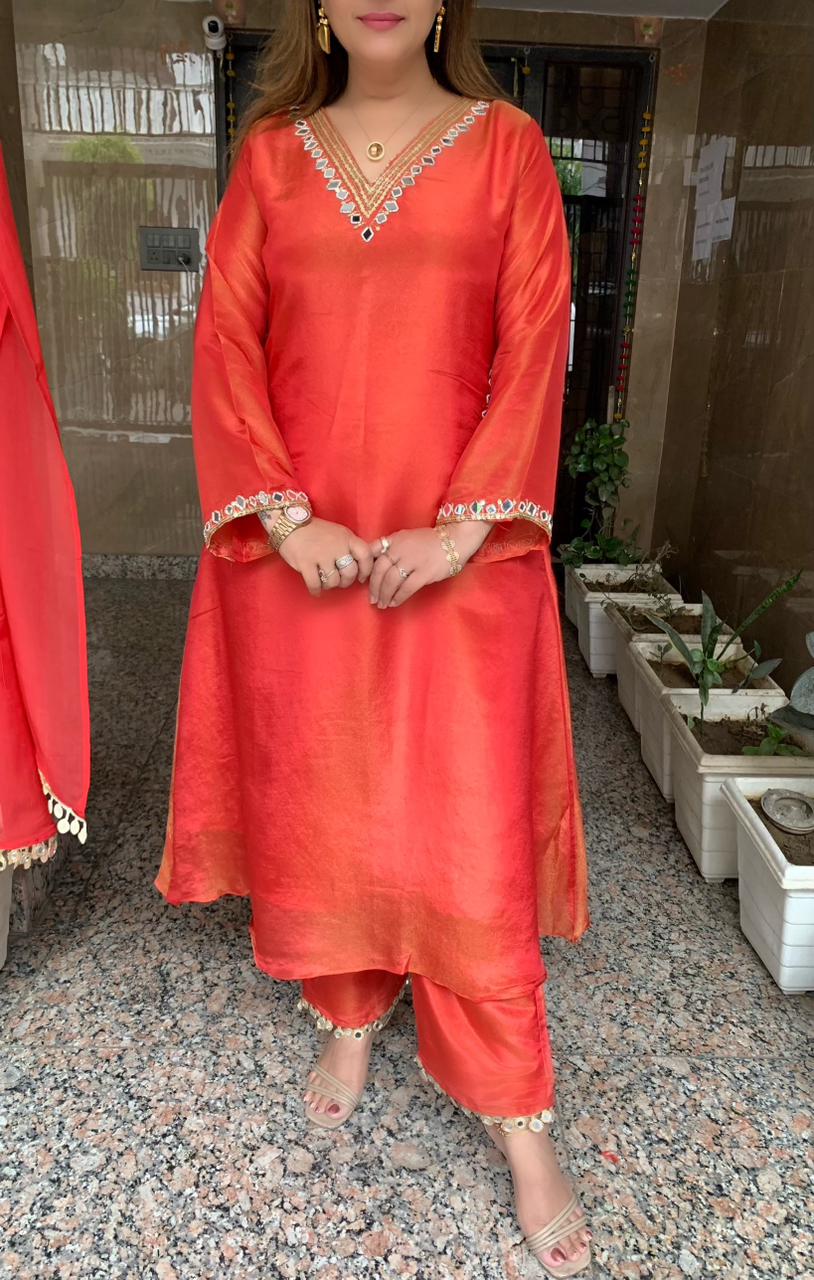 Classy Shimmer Tissue 3 Piece Full Lining Kurti with Fine Pearl Real Mirror, Sequin and Cut Dana Hand work with Side Pockets along with Pant Plazzo and Organza Dupatta with Real Mirror Lace Work