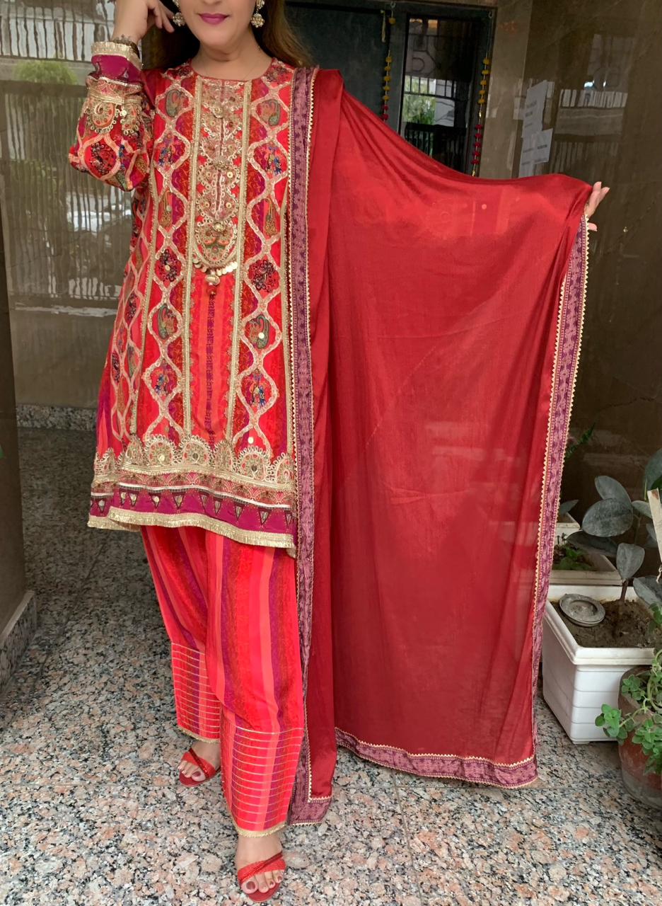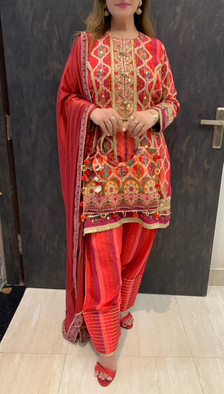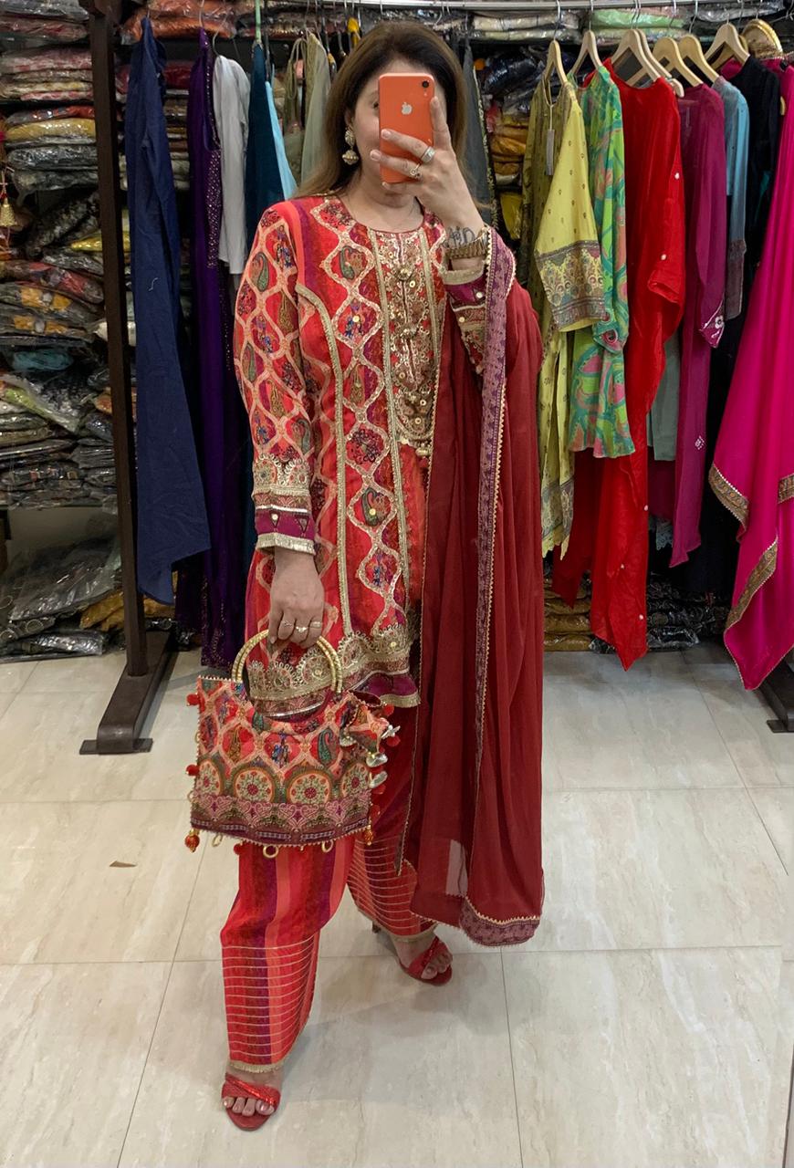 Elegant Digital Print Pure Crepe 3 piece Lining Kurti with Heavy Gotta Detailing, Golden Kingri Frill, Fancy Accessories paired with Farshi Salwar, Chinnon Dupatta and Fancy Matching Hand Bag