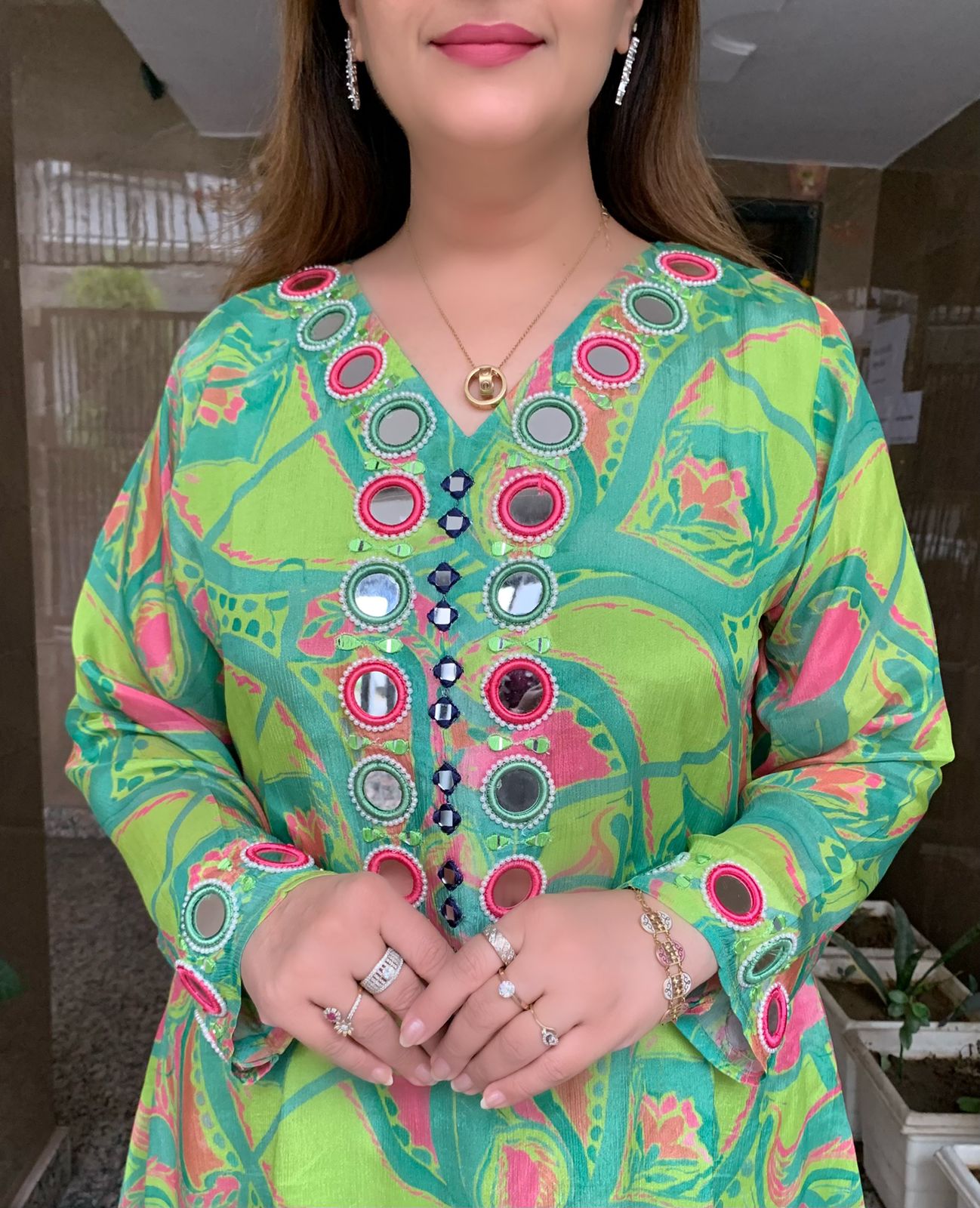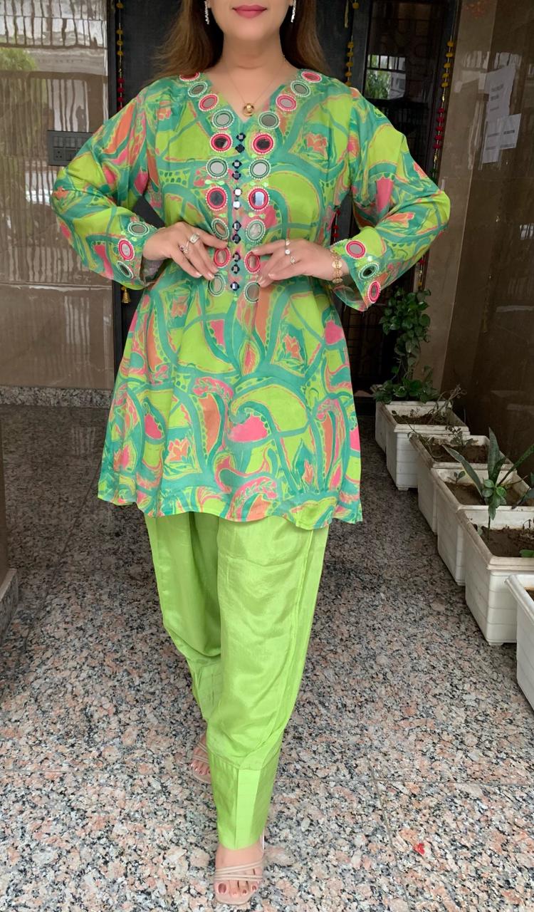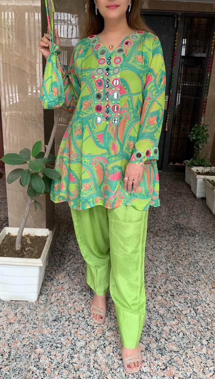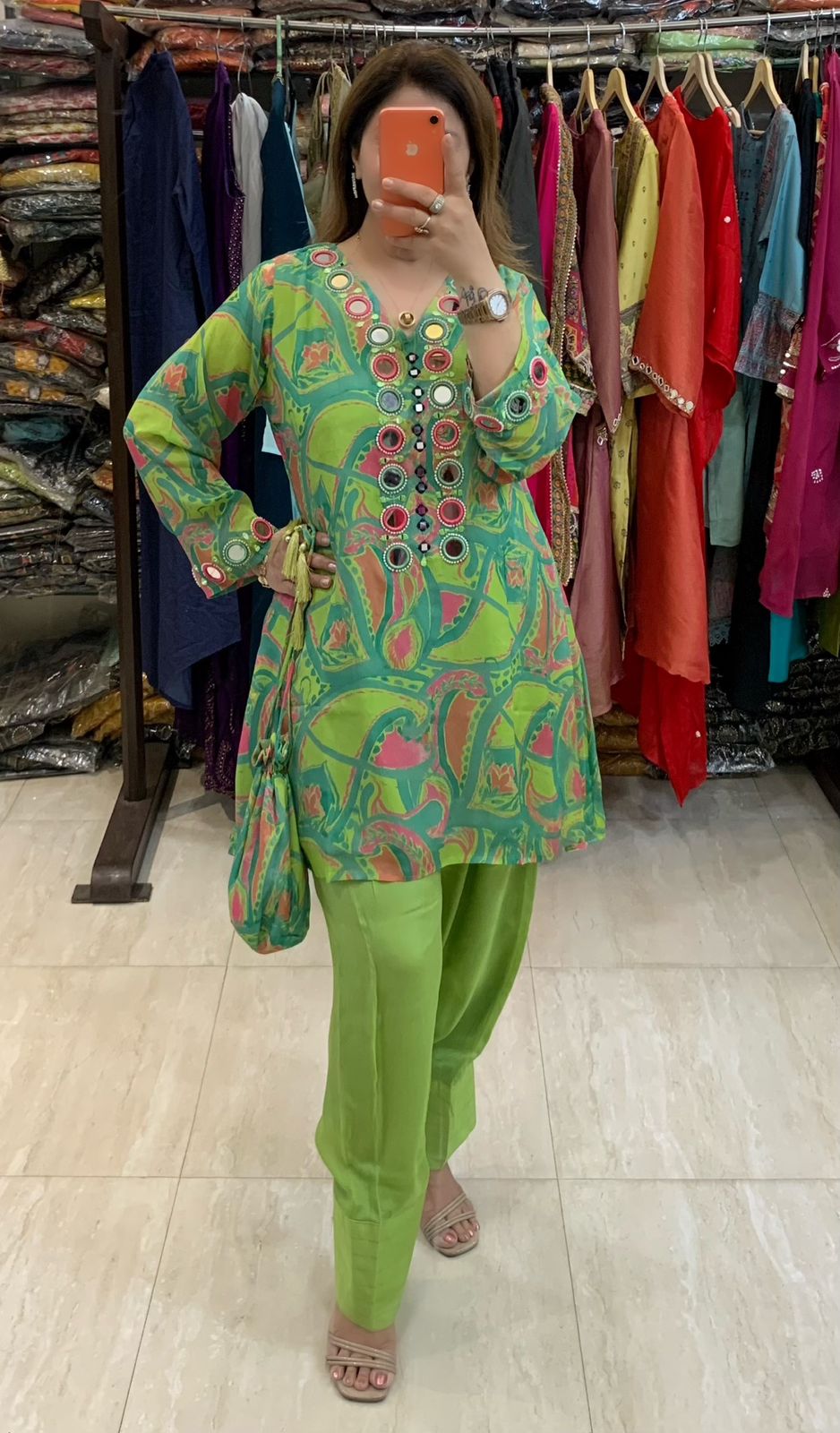 Beautiful Digital Print Pure Chinnon 2 piece Full Lining Kurti with Real Mirror, Moti and Thread Work along Farshi Salwar and Potli Bag