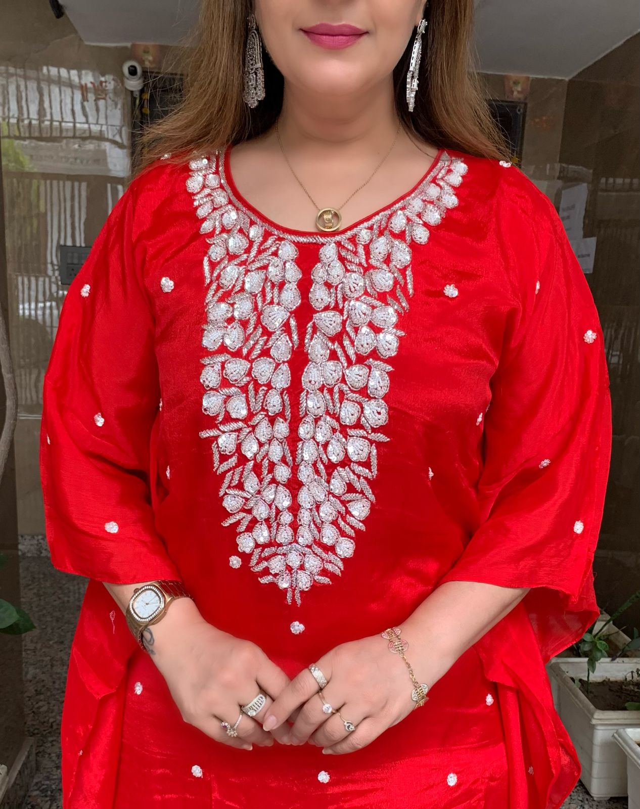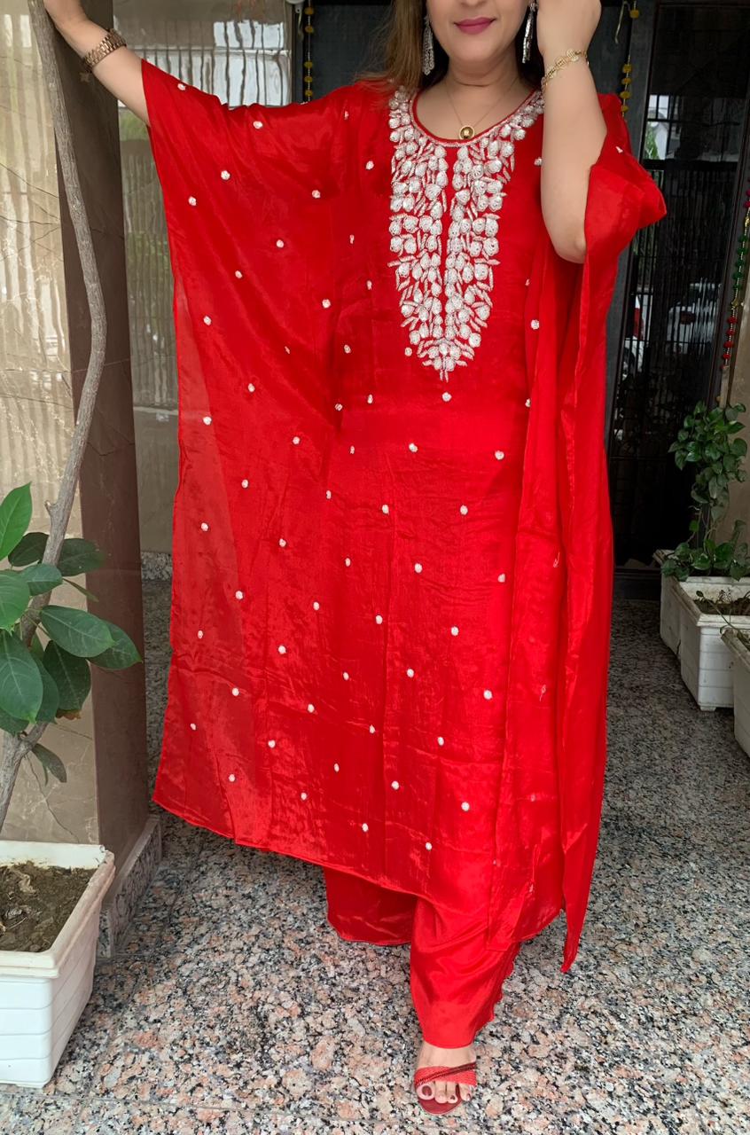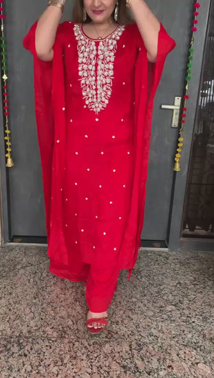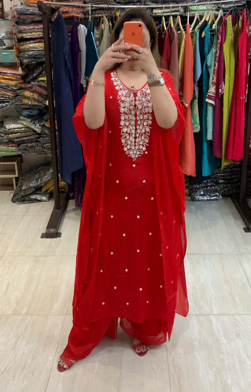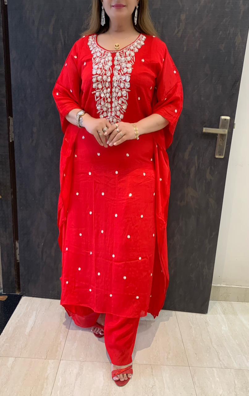 Classy Pure Chinnon 2 piece Kaftaan Co-ord Set with Heavy Handwork on Yoke along with Divider Plazzo