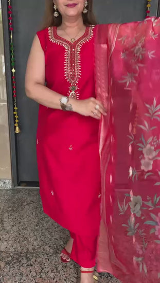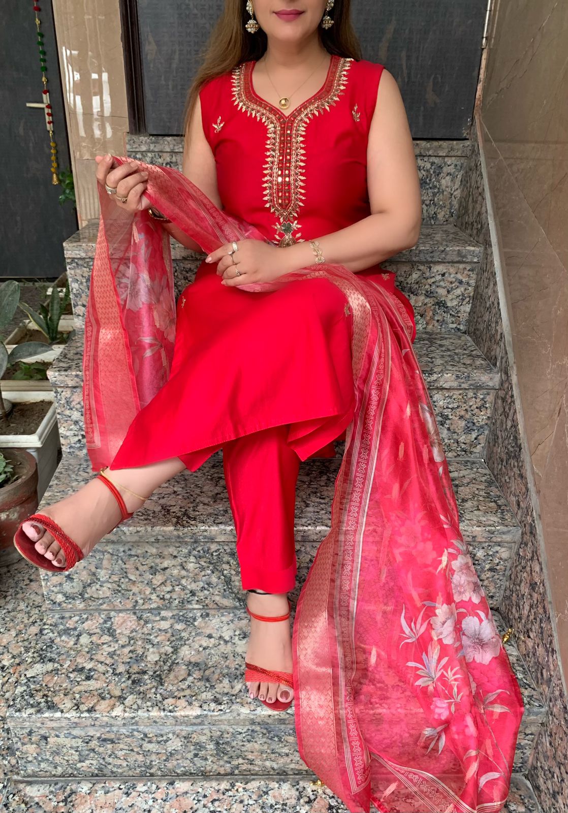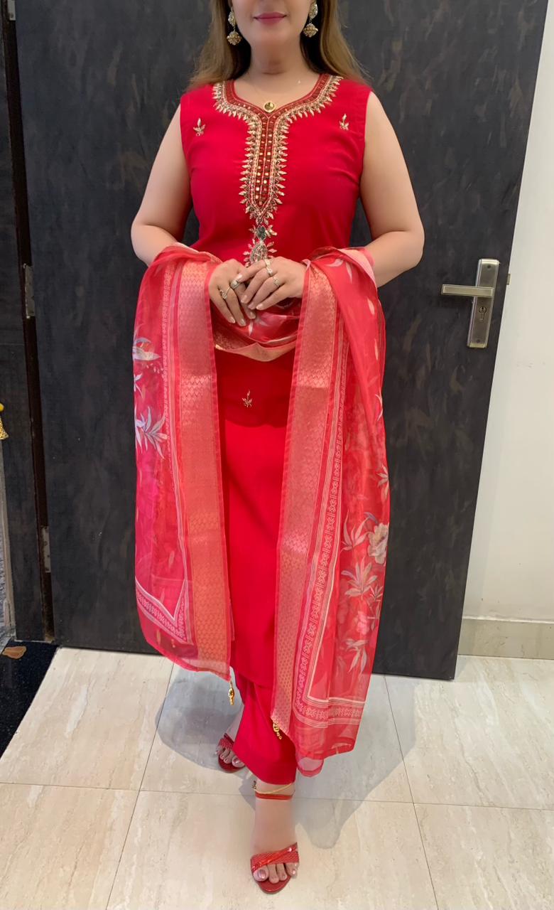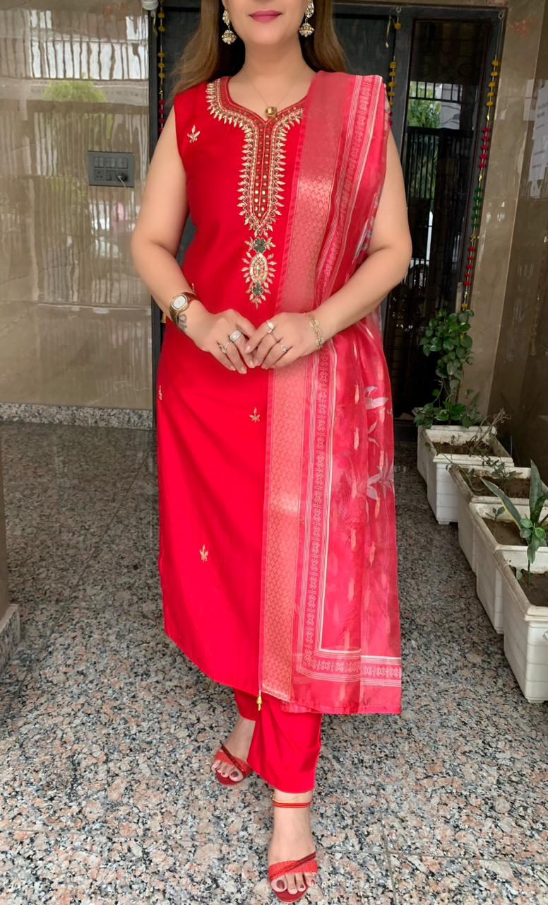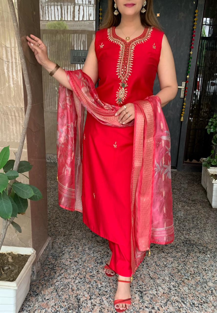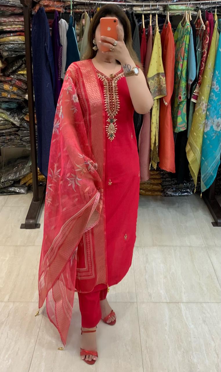 Beautiful Cotton Silk 3 piece Lining Kurti with Fine Dabka Hand Work along with Pant and Printed Organza Dupatta