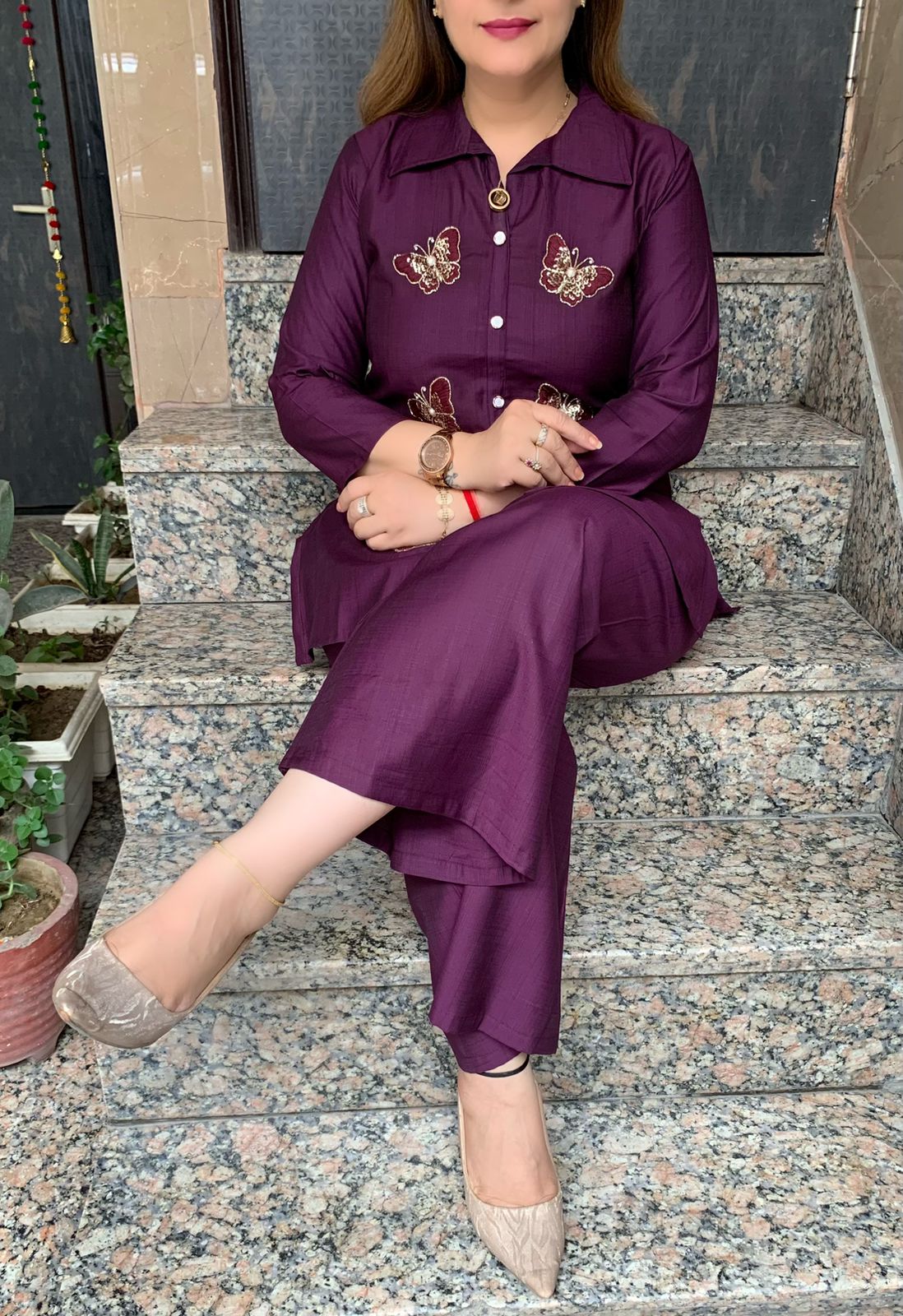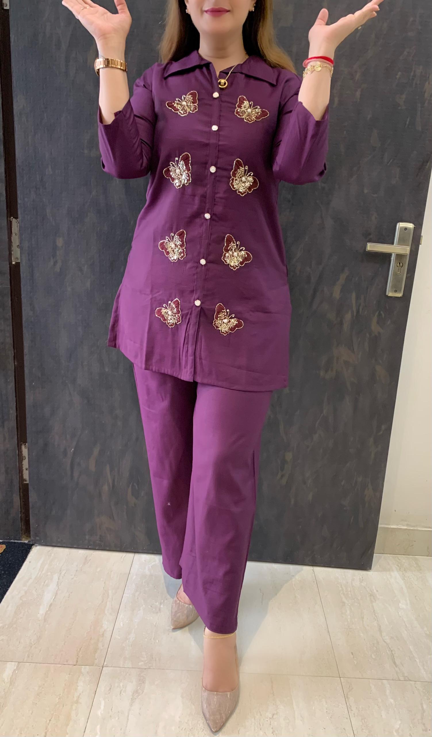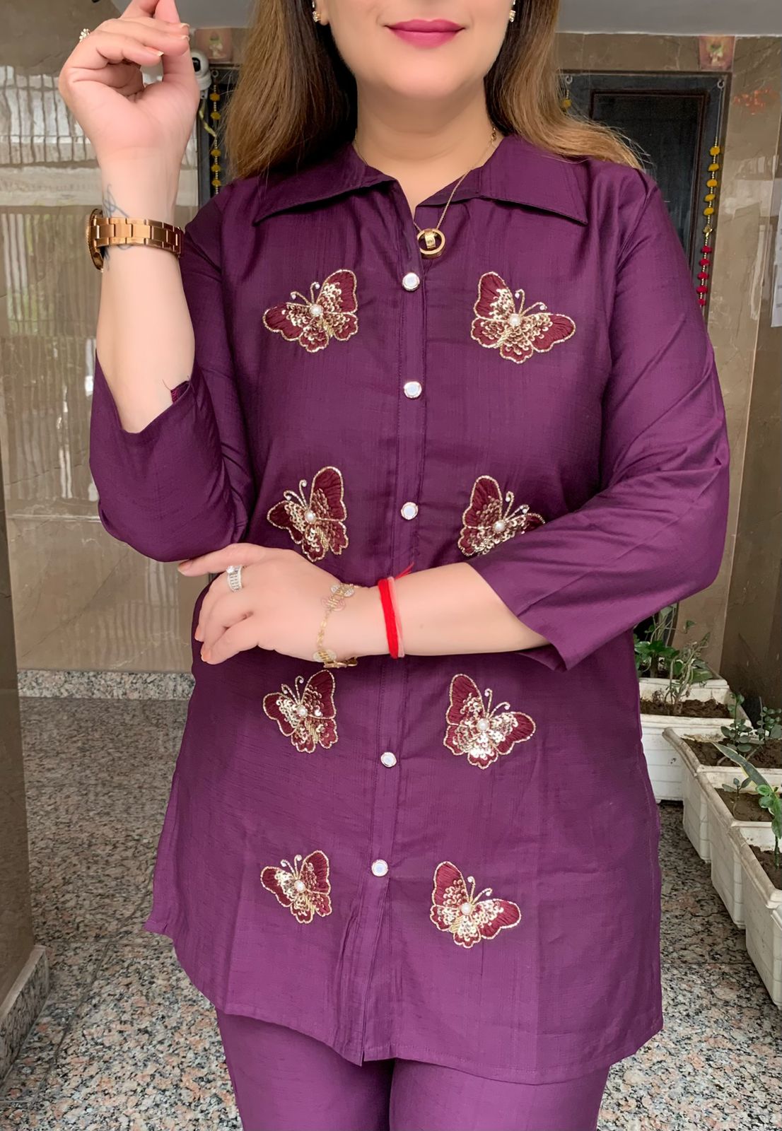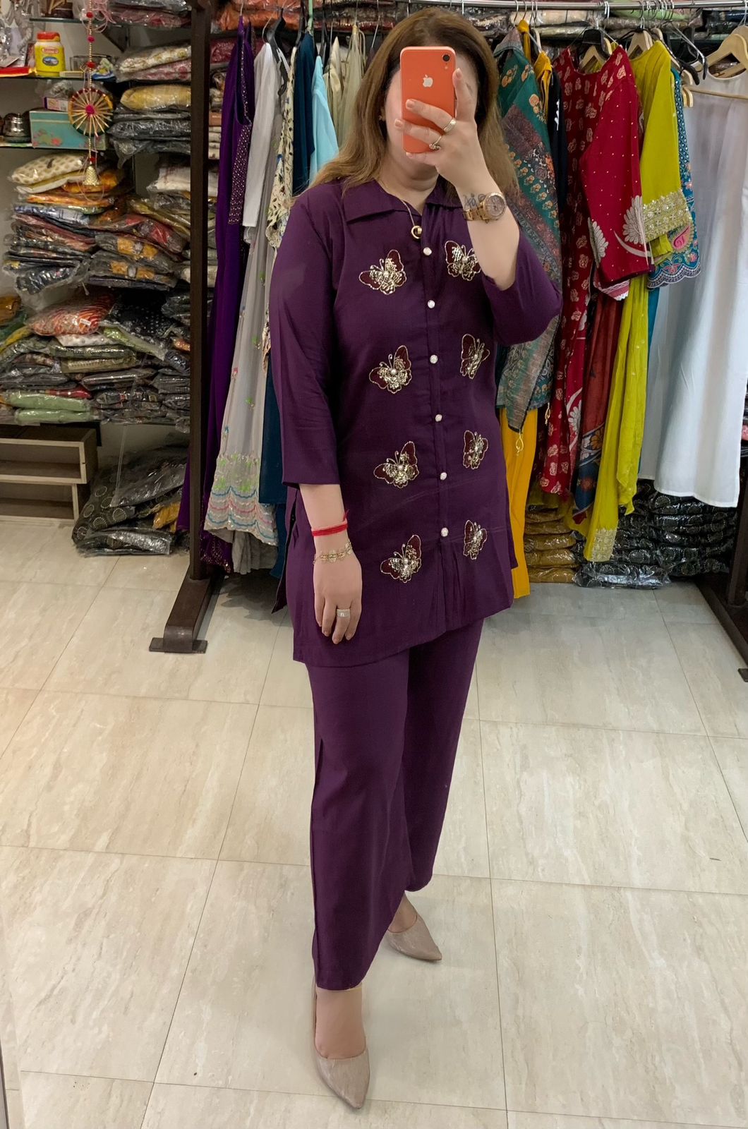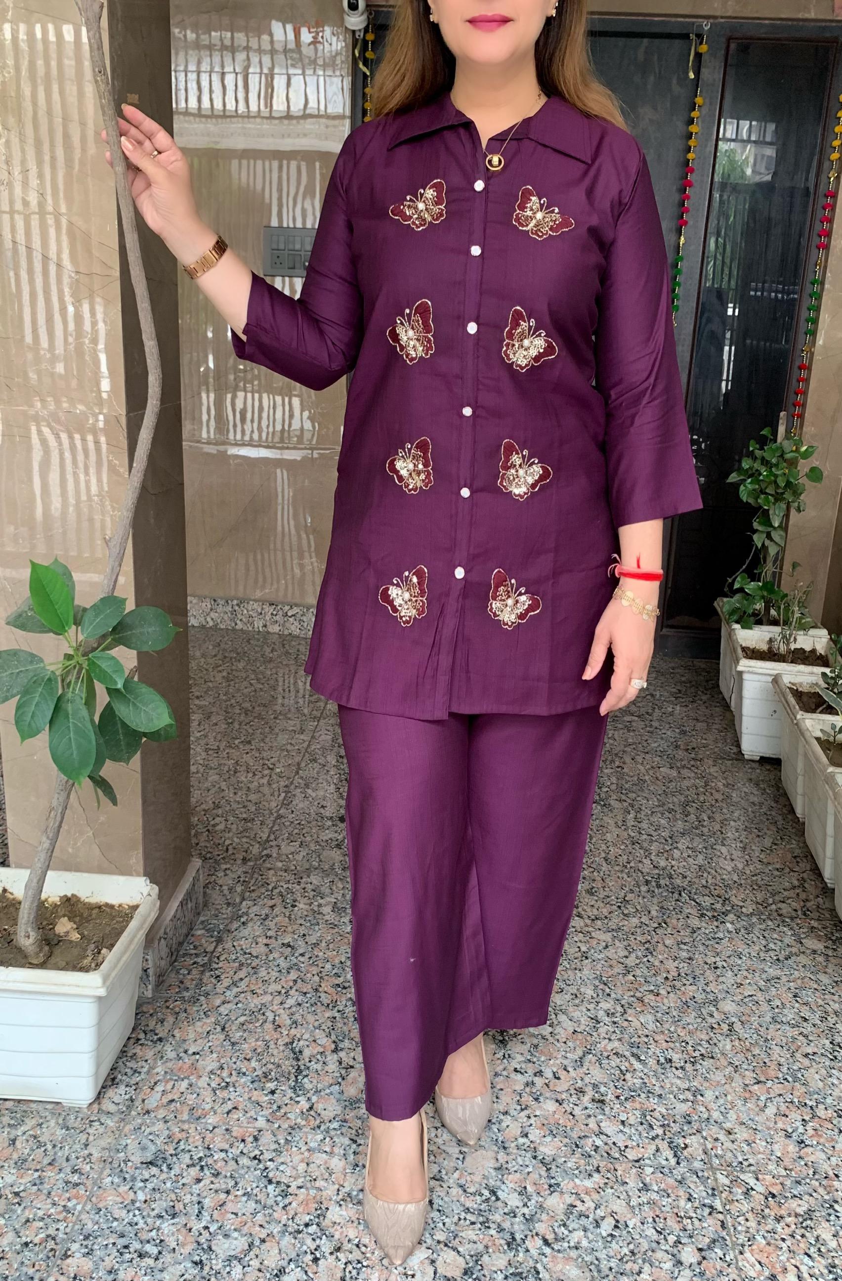 Elegant 2 piece Bombay Vatican Silk Co-ord Set with Lining Top and Fine Hand Work Motifs along with Plazzo Pant
