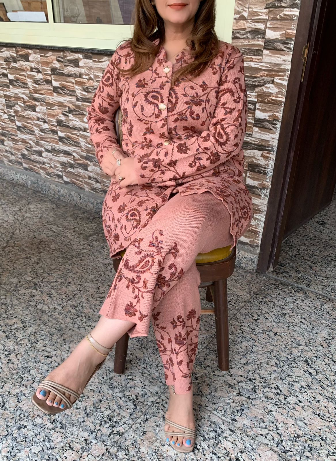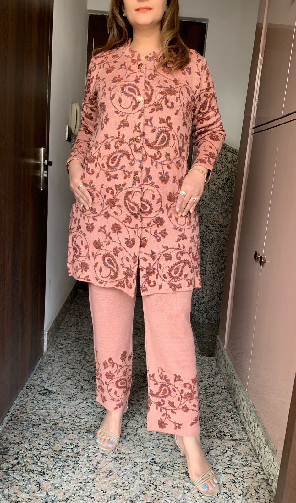 Beautiful Warm Knitted Self Weaving Multi Colored Embossed Effect 2 Piece Co-ord set with Side Pocket