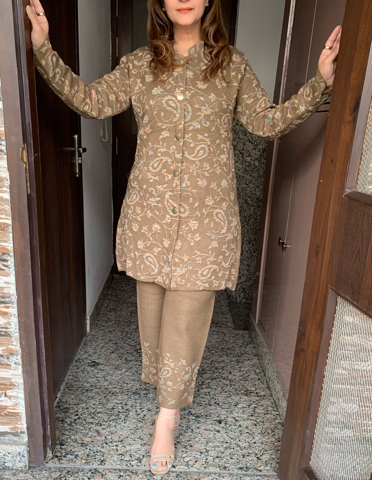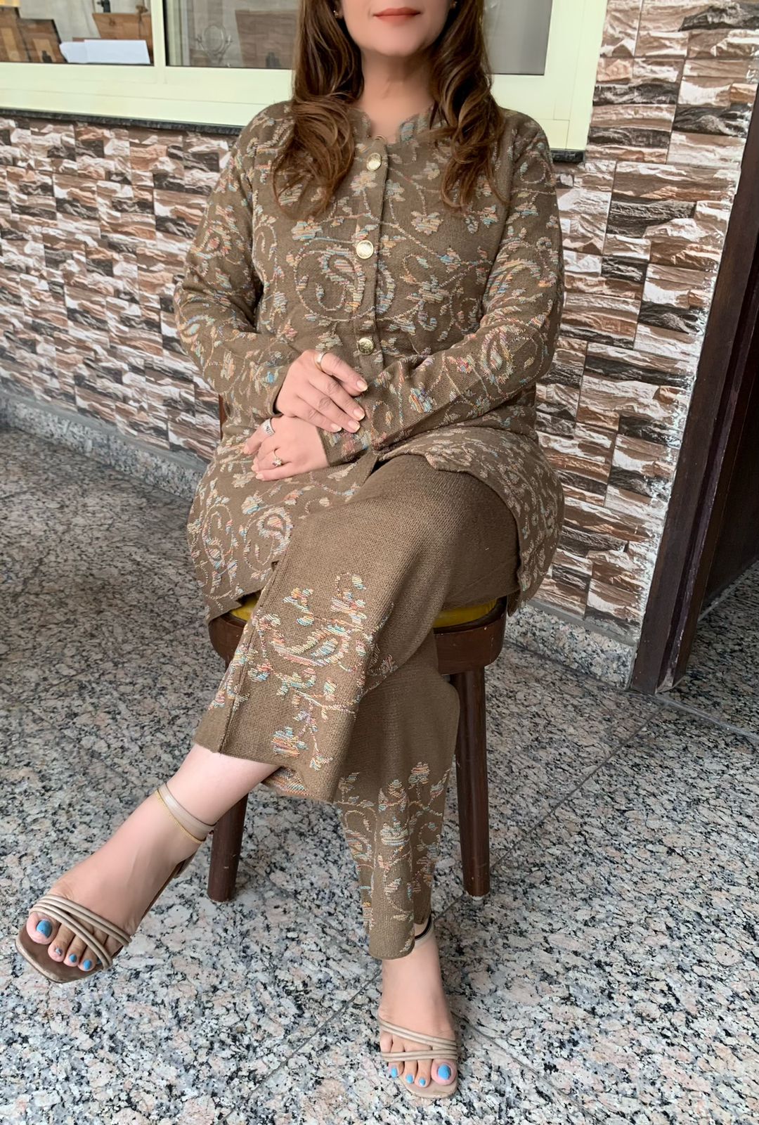 Beautiful Warm Knitted Self Weaving Multi Colored Embossed Effect 2 Piece Co-ord set with Side Pocket